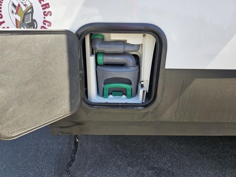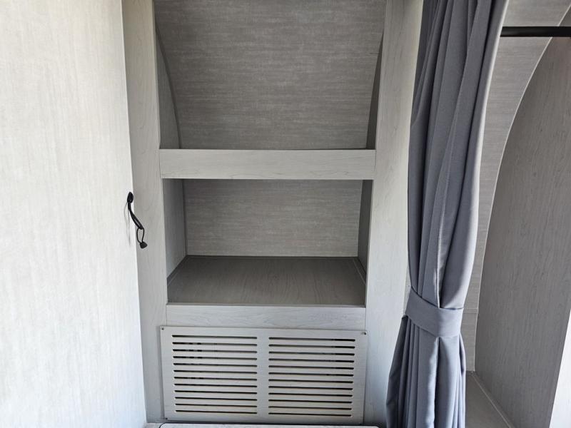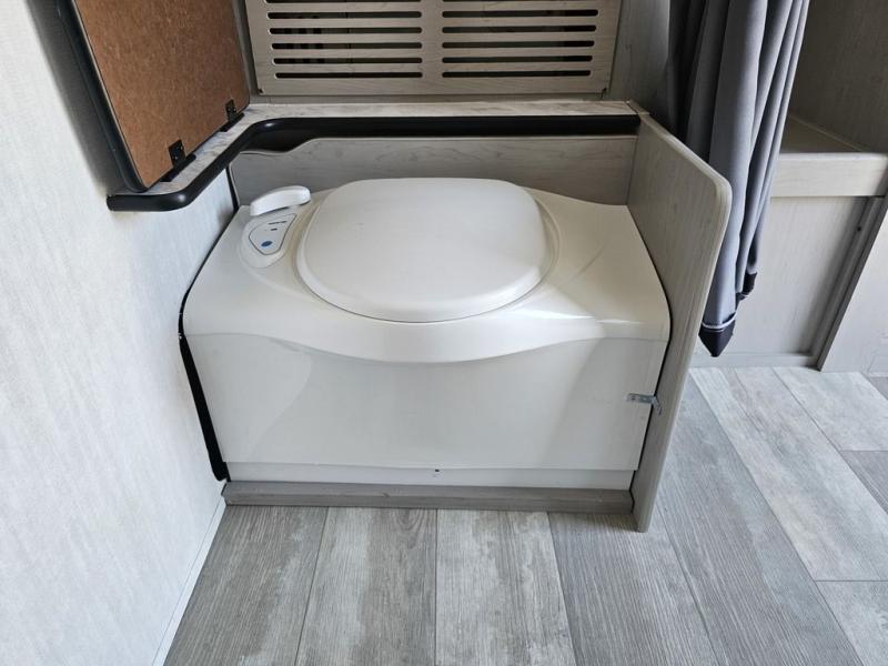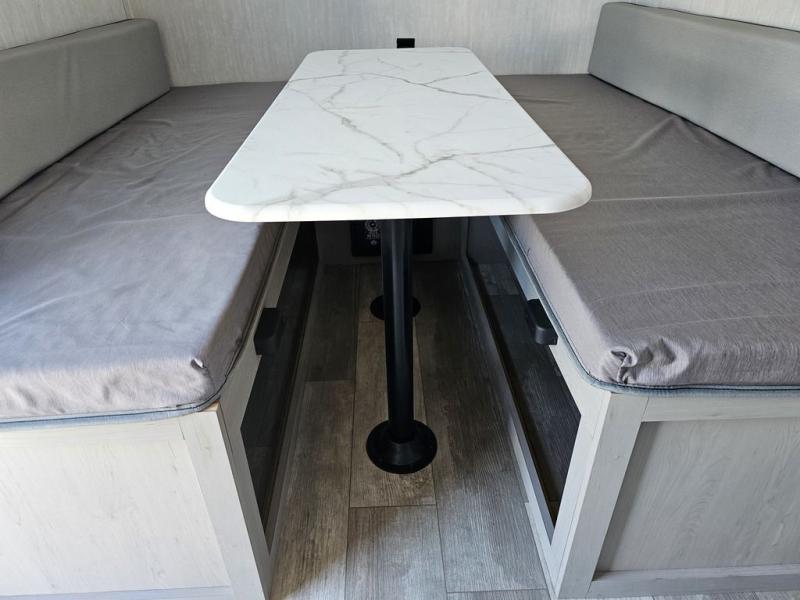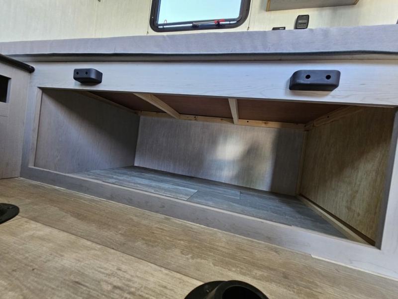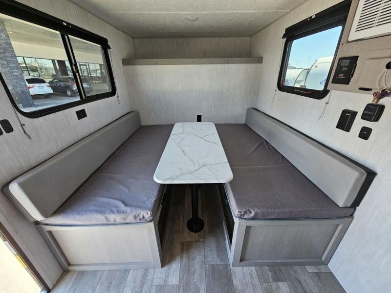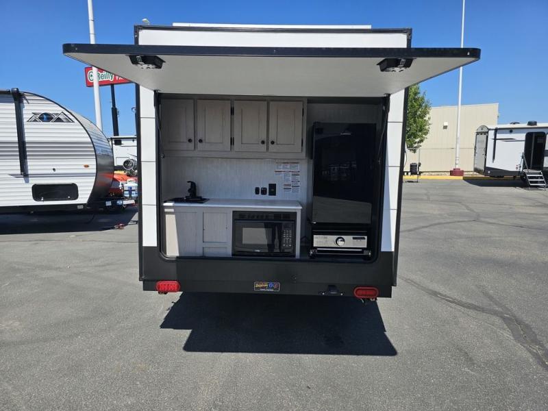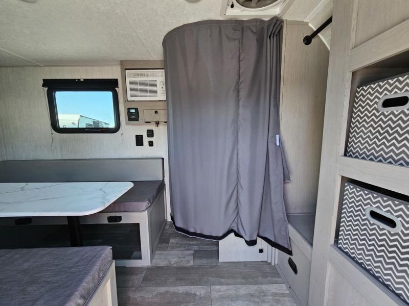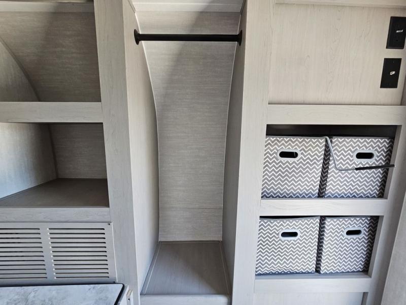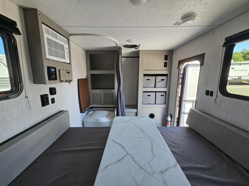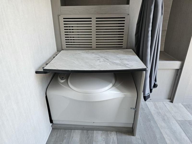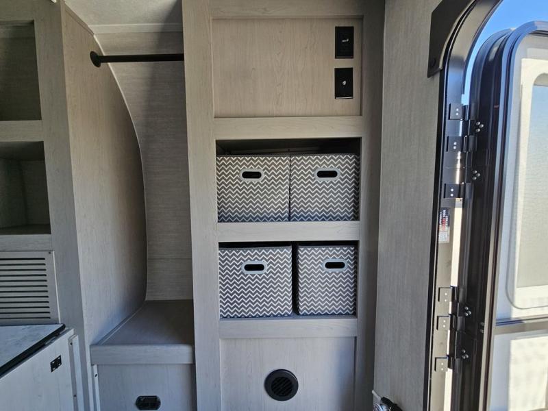 This travel trailer features a little more interior space since you can move between the two twin beds with storage, and there is a portable table where you can dine together. You'll find an overhead cabinet in the back for your belongings, along with a storage cabinet up front and a wardrobe. The cassette toilet will add even more convenience. The rear hatch kitchen includes a pull-out griddle and grill combo cooktop, a 3.3 cu. ft. 12V refrigerator, and a microwave oven. There is also a hot and cold faucet and multiple overhead storage cabinets for spices, utensils, and more!