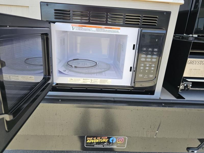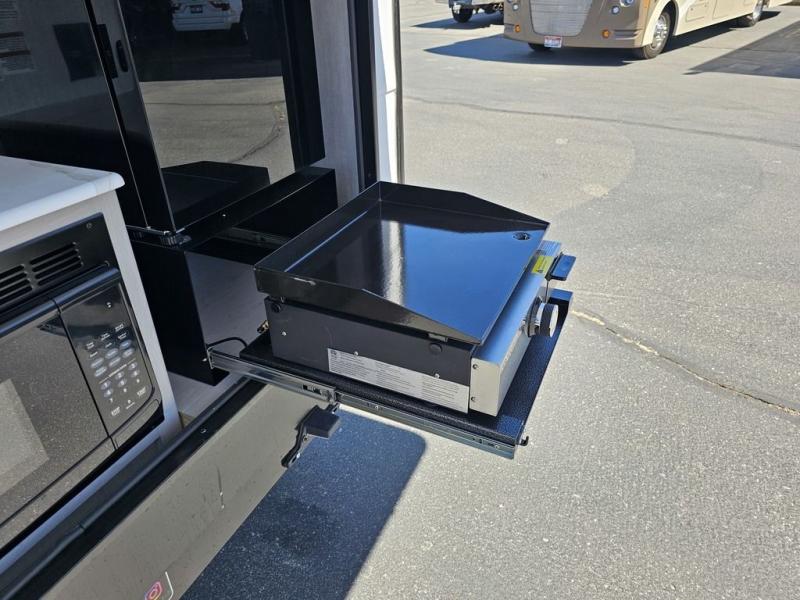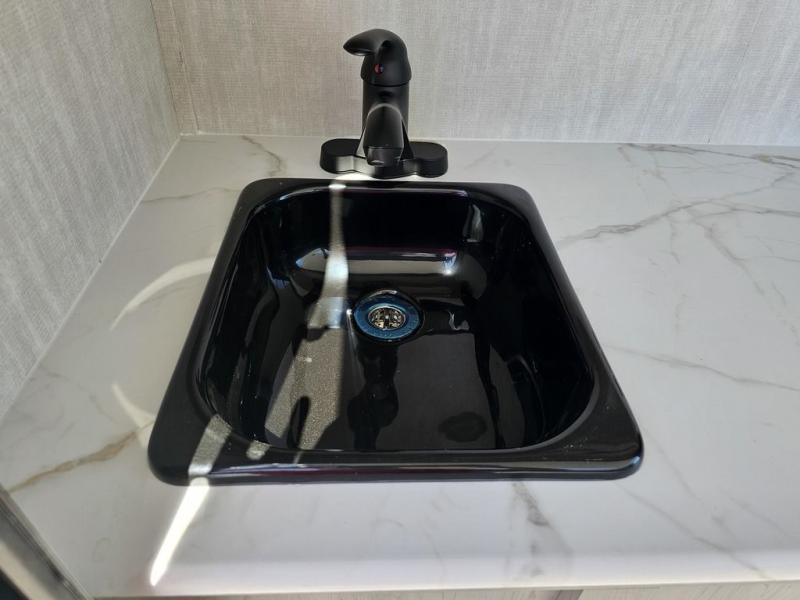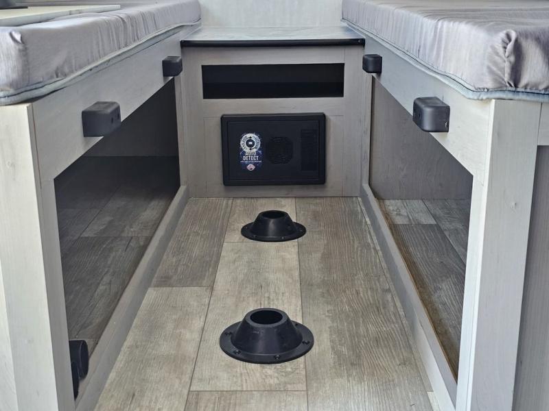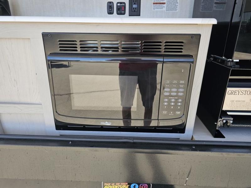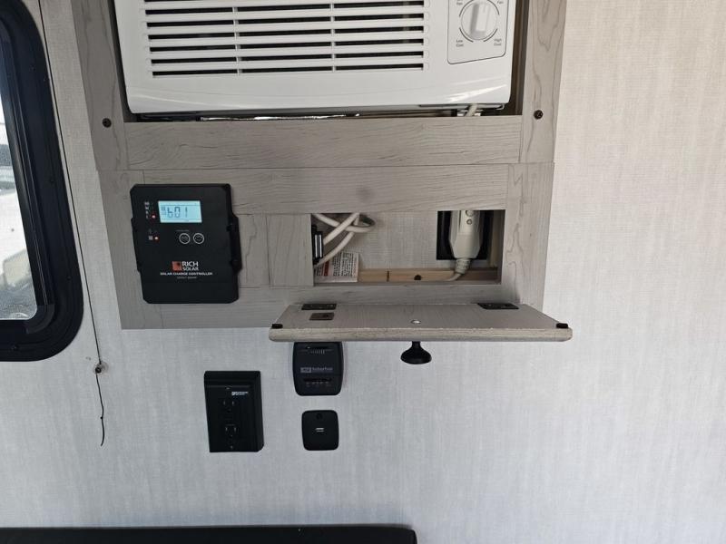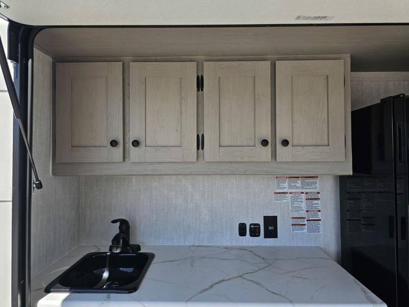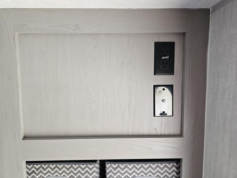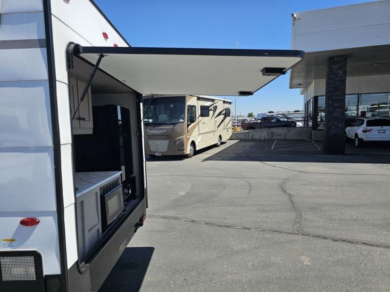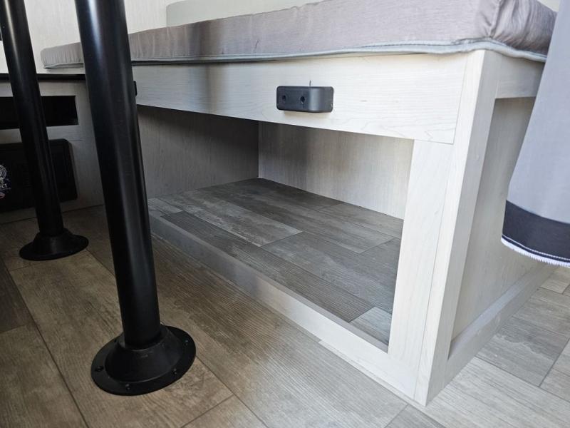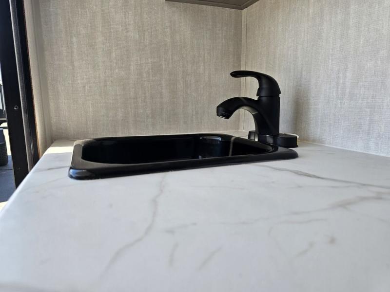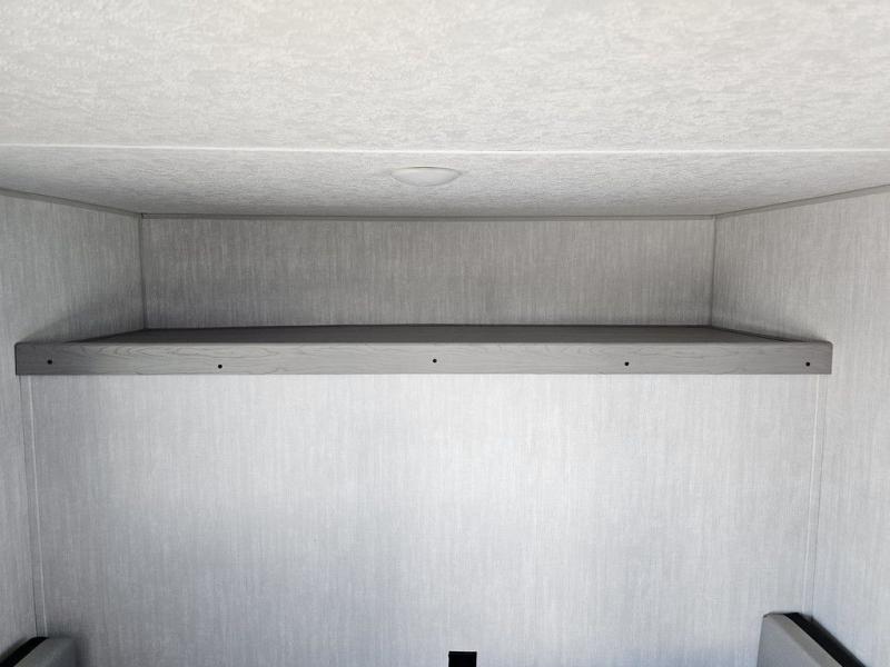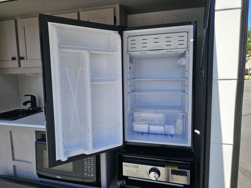 This travel trailer features a little more interior space since you can move between the two twin beds with storage, and there is a portable table where you can dine together. You'll find an overhead cabinet in the back for your belongings, along with a storage cabinet up front and a wardrobe. The cassette toilet will add even more convenience. The rear hatch kitchen includes a pull-out griddle and grill combo cooktop, a 3.3 cu. ft. 12V refrigerator, and a microwave oven. There is also a hot and cold faucet and multiple overhead storage cabinets for spices, utensils, and more!