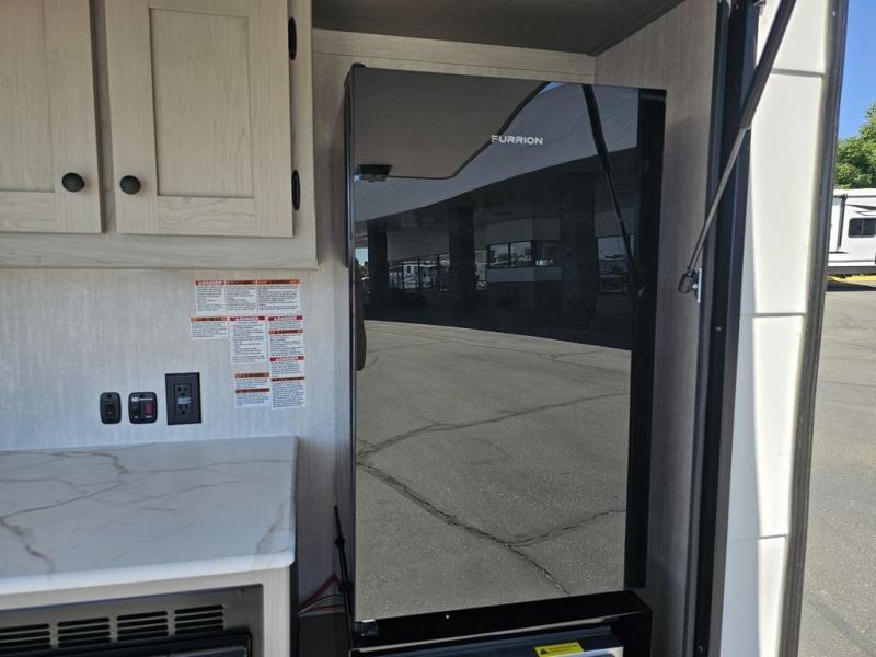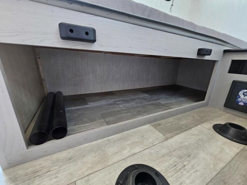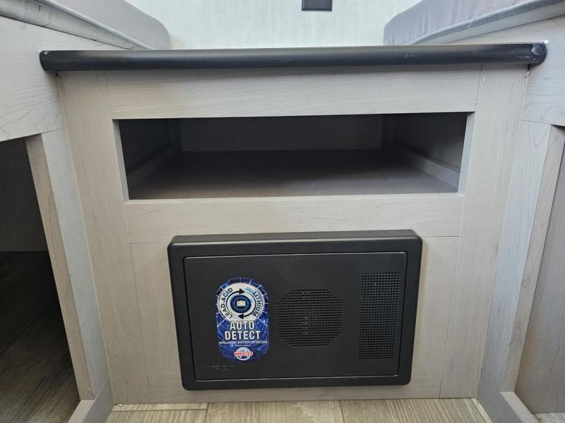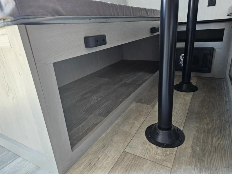 This travel trailer features a little more interior space since you can move between the two twin beds with storage, and there is a portable table where you can dine together. You'll find an overhead cabinet in the back for your belongings, along with a storage cabinet up front and a wardrobe. The cassette toilet will add even more convenience. The rear hatch kitchen includes a pull-out griddle and grill combo cooktop, a 3.3 cu. ft. 12V refrigerator, and a microwave oven. There is also a hot and cold faucet and multiple overhead storage cabinets for spices, utensils, and more!