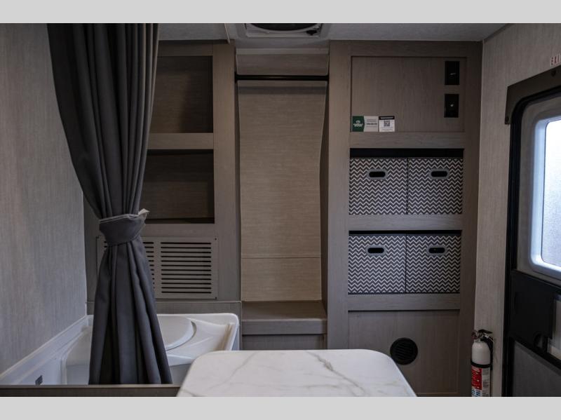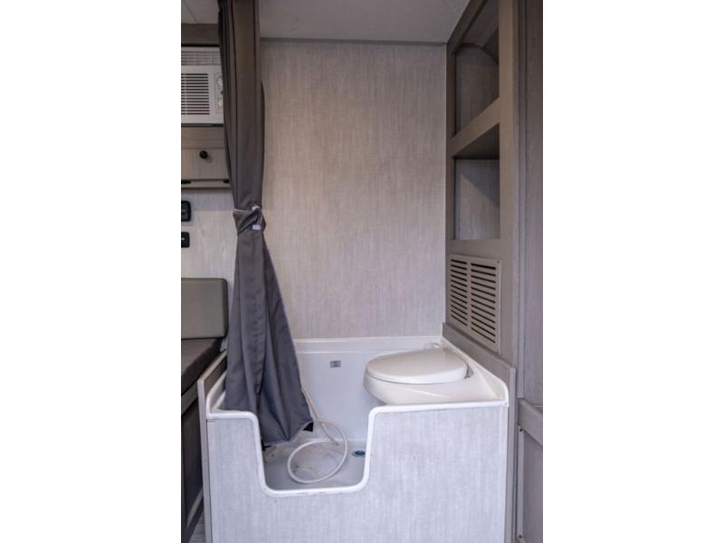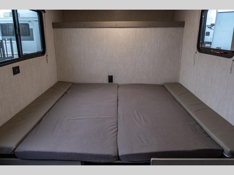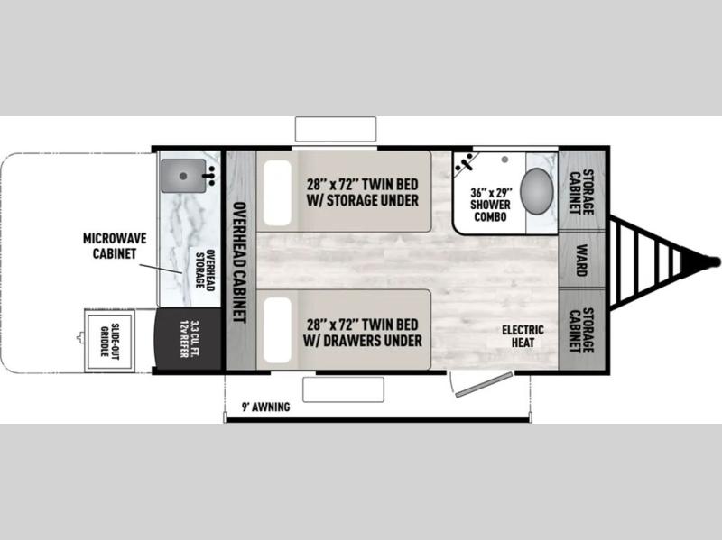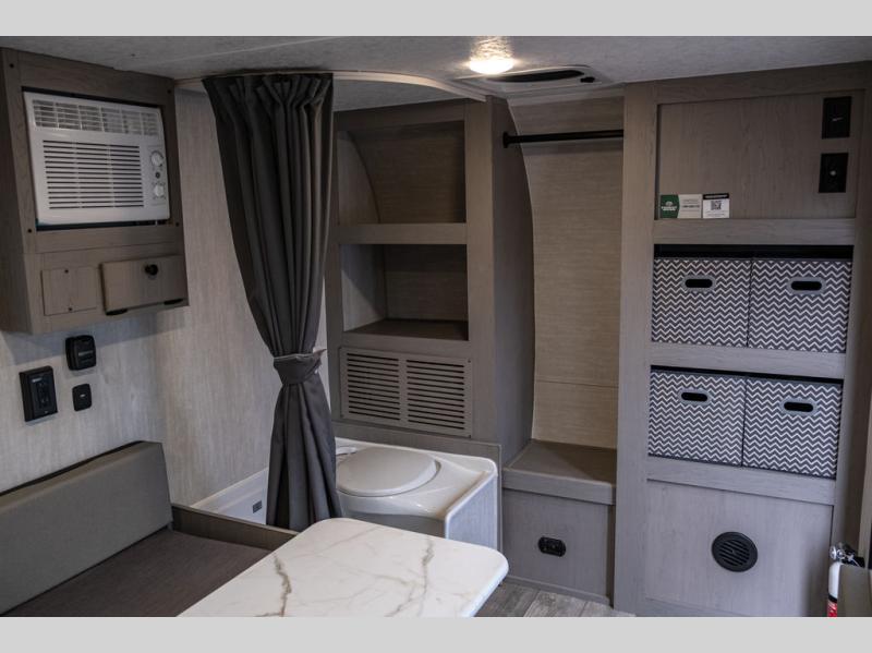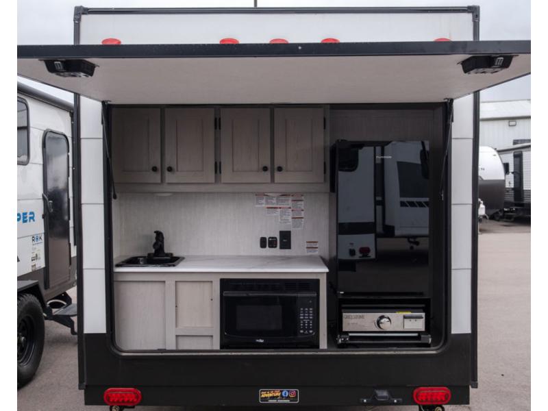 This travel trailer features a little more interior space since you can move between the two twin beds with storage, and there is a portable table where you can dine together. You'll find an overhead cabinet in the back for your belongings, along with a storage cabinet up front and a wardrobe. The cassette toilet will add even more convenience. The rear hatch kitchen includes a pull-out griddle and grill combo cooktop, a 3.3 cu. ft. 12V refrigerator, and a microwave oven. There is also a hot and cold faucet and multiple overhead storage cabinets for spices, utensils, and more!
