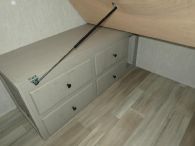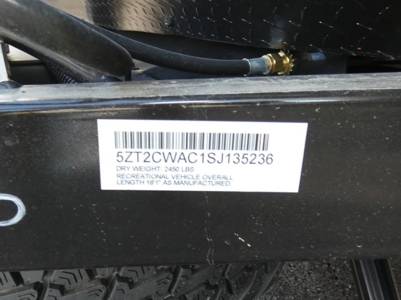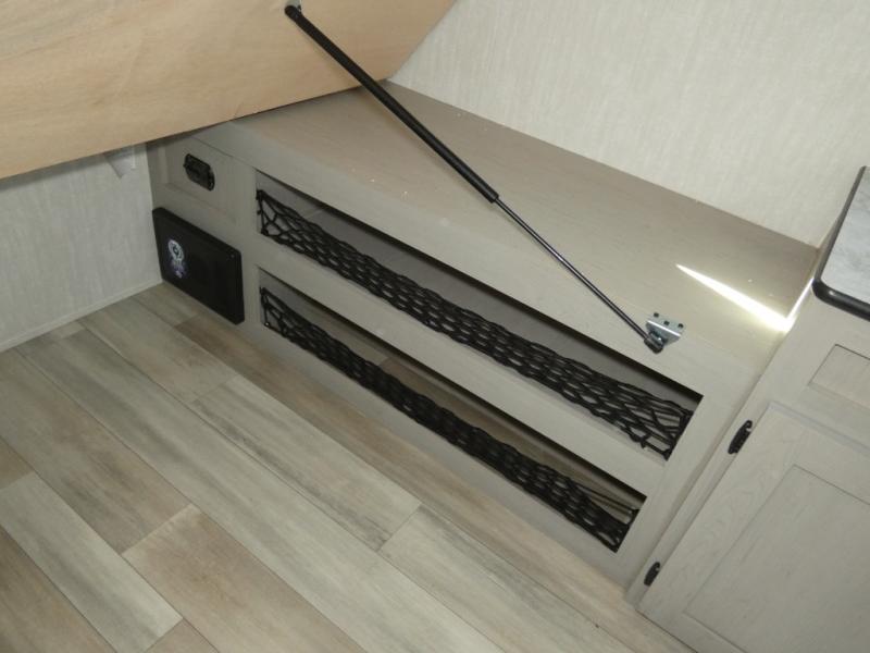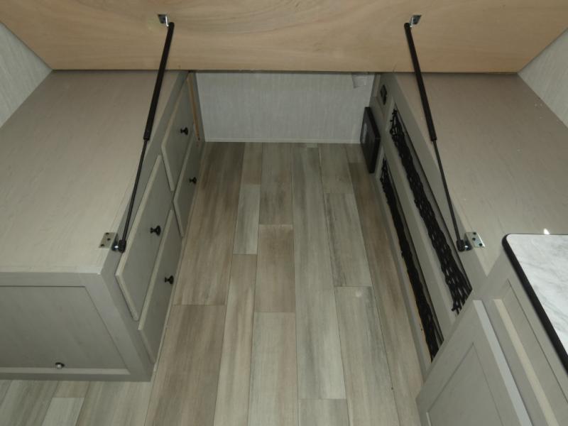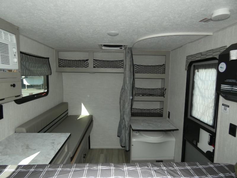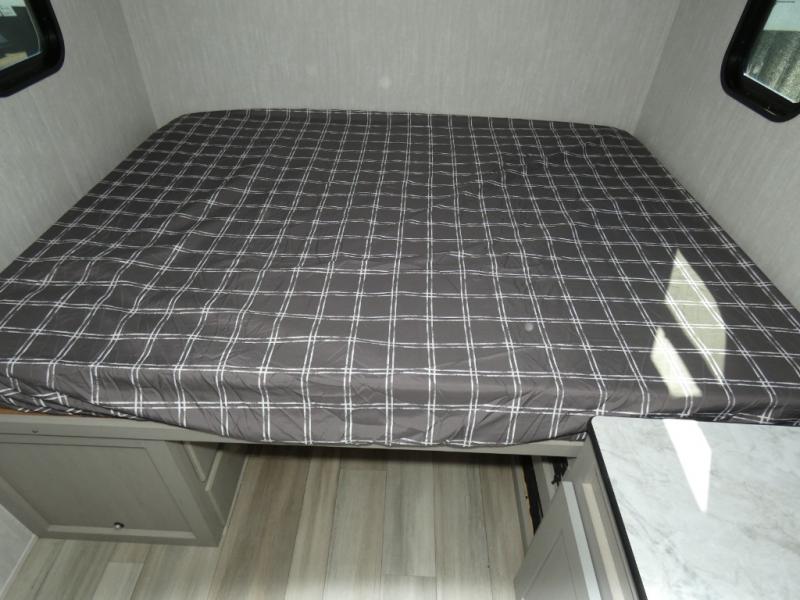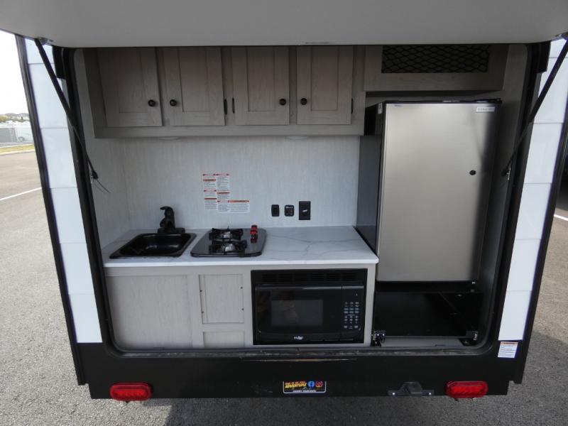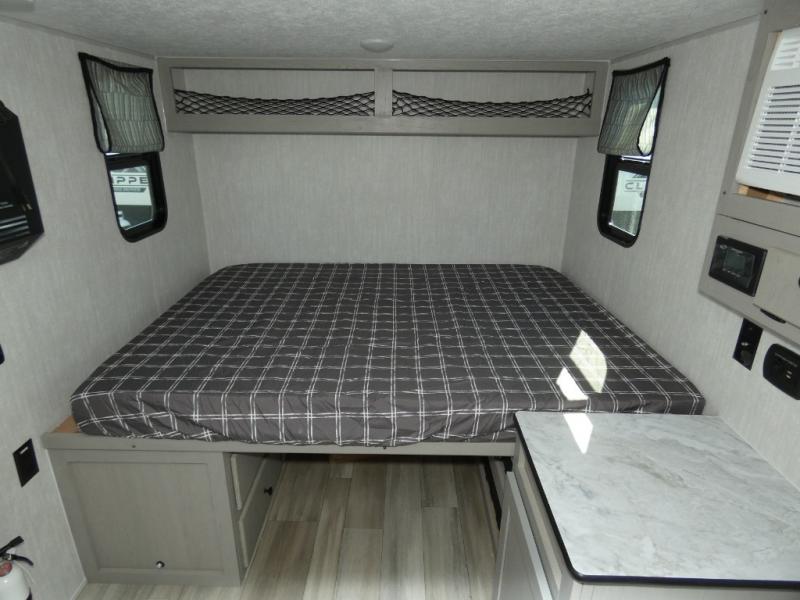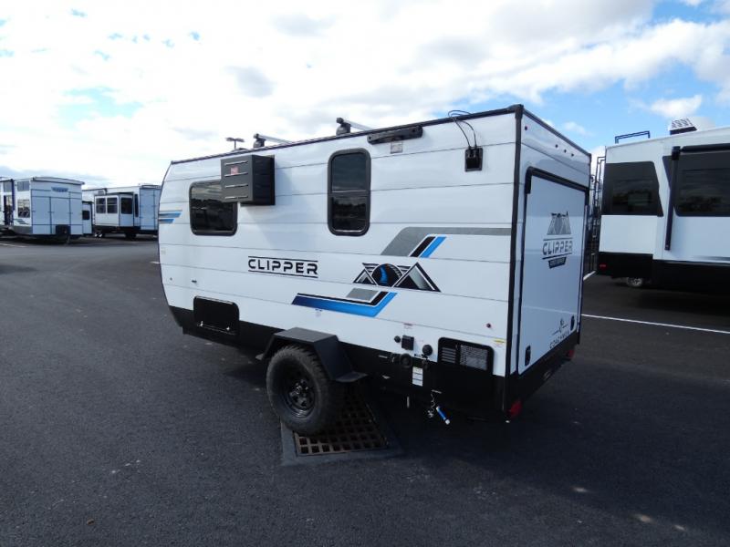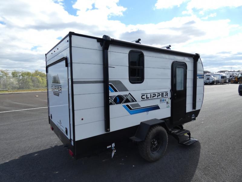 When you want to explore choose this 12000 Series Clipper ROK for your basic off-road adventure needs and a bit more by offering you a 54" X 74" flip-up bed with storage beneath, and gaucho seating that pulls out into a bed for an additional camper at night. There is front and rear overhead cabinetry for storage, and a cassette toilet for added convenience especially at night. A rear hatch camp kitchen provides a place for you to create meals and snacks while you explore. There is a slide-out griddle, a 3.3 cu. ft. 12-volt refrigerator for your cold items, a single sink, and two burner cooktop, plus a microwave oven. There is also plenty of overhead storage for your paper products and spices. A 9' manual awning creates a bit of added outdoor living space where you can set up your camp chairs.