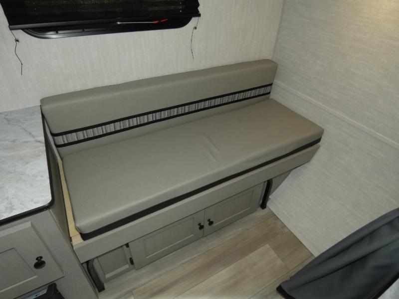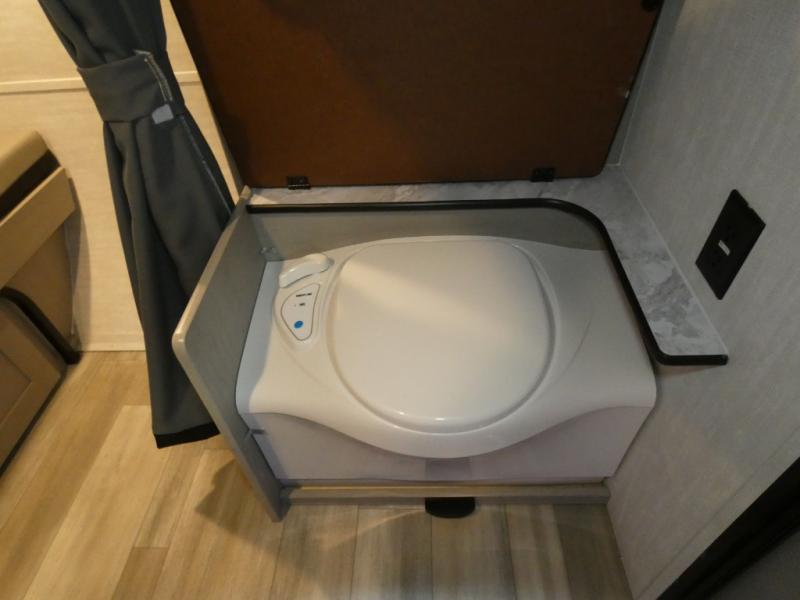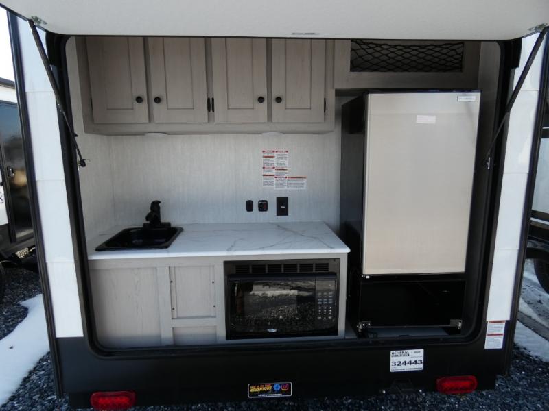 When you want to explore choose this teardrop trailer for your basic off-road adventure needs and a bit more by offering you a 54" X 74" flip-up bed with storage beneath, and gaucho seating that pulls out into a bed for an additional camper at night. There is front and rear overhead cabinetry for storage, and a cassette toilet for added convenience especially at night. A rear hatch camp kitchen provides a place for you to create meals and snacks while you explore. There is a slide-out griddle and grill combo cooktop, a 3.3 cu. ft. 12-volt refrigerator for your cold items, a single sink, and two burner cooktop, plus a microwave oven. A 9' power awning creates a bit of added outdoor living space where you can set up your camp chairs.