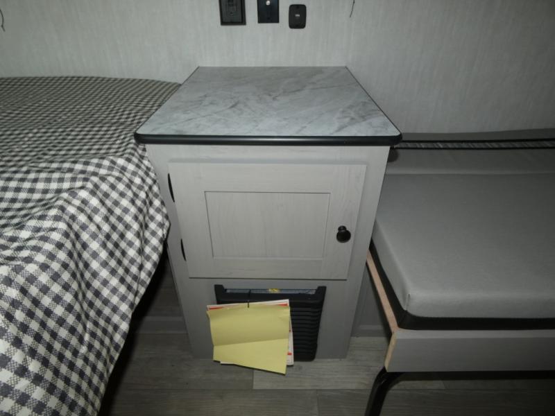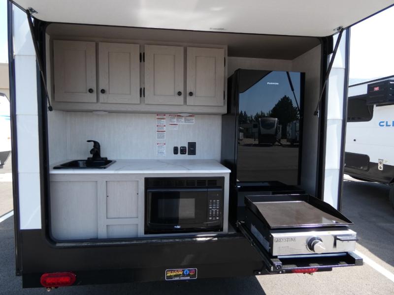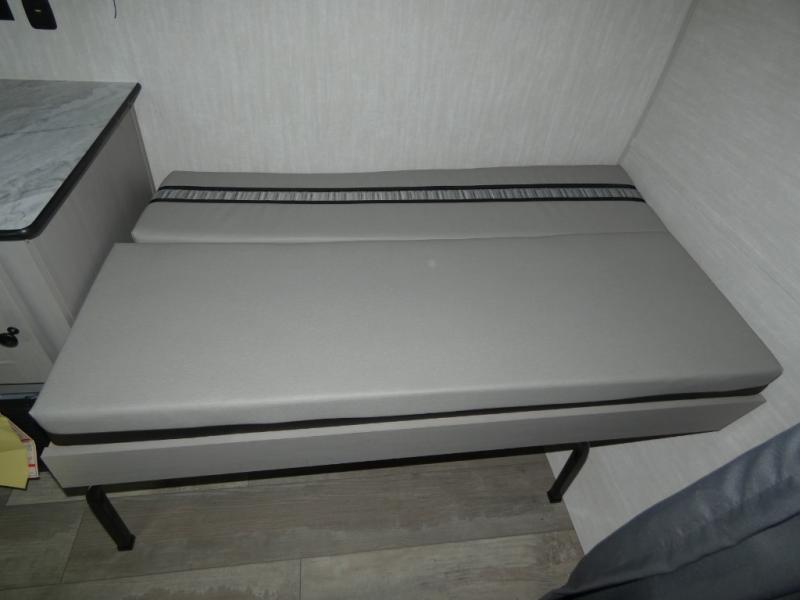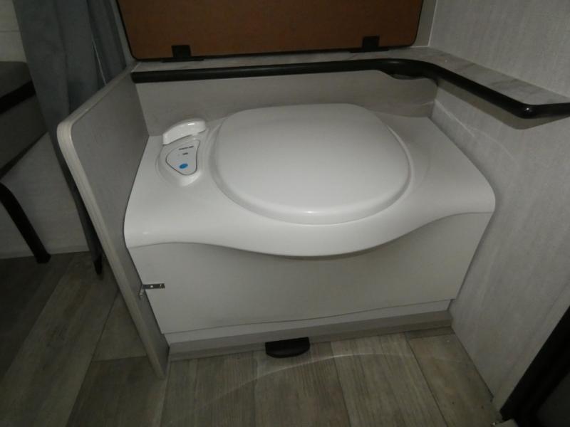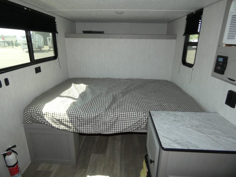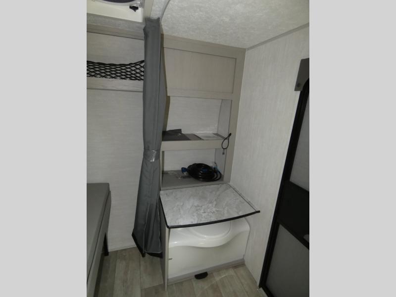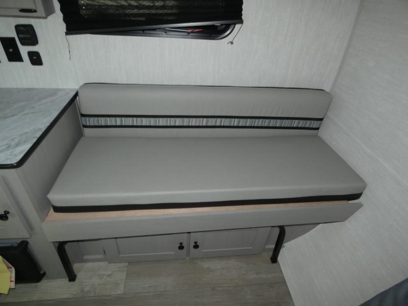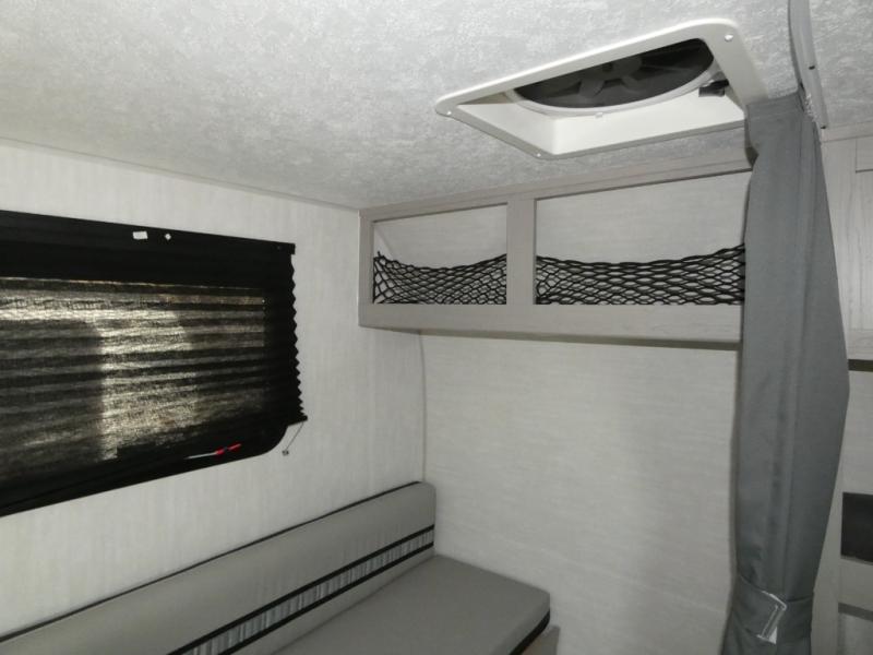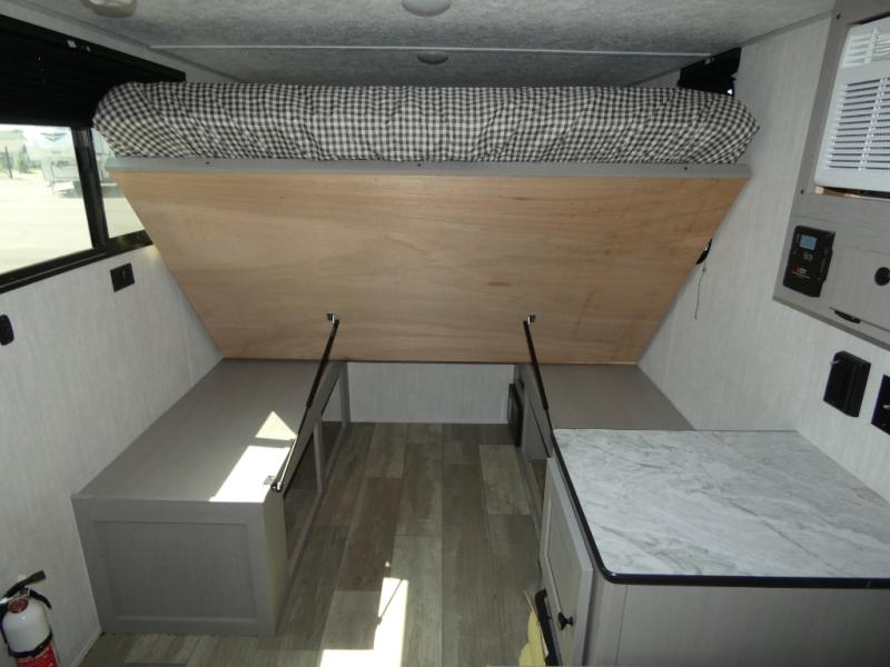 When you want to explore choose this travel trailer for your basic off-road adventure needs and a bit more by offering you a 54" X 74" flip-up bed with storage beneath, and gaucho seating that pulls out into a bed for an additional camper at night. There is front and rear overhead cabinetry for storage, and a cassette toilet for added convenience especially at night. A rear hatch camp kitchen provides a place for you to create meals and snacks while you explore. There is a slide-out griddle and grill combo cooktop, a 3.3 cu. ft. 12-volt refrigerator for your cold items, a single sink, and two burner cooktop, plus a microwave oven. A 9' power awning creates a bit of added outdoor living space where you can set up your camp chairs.