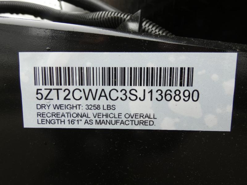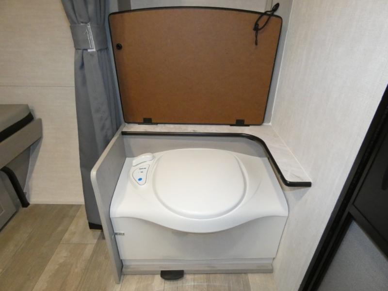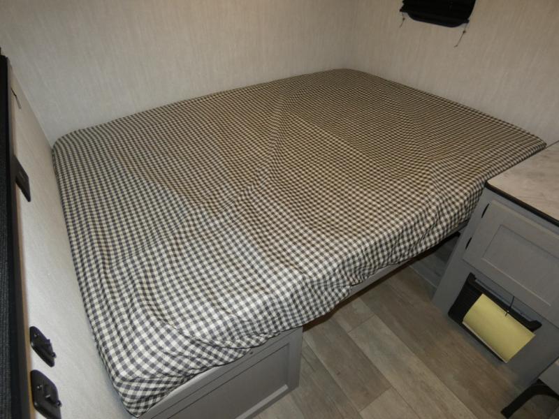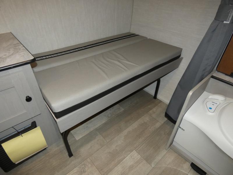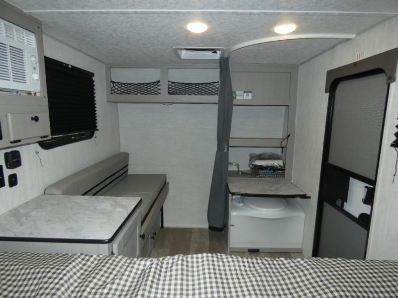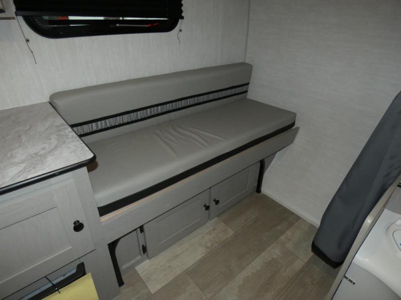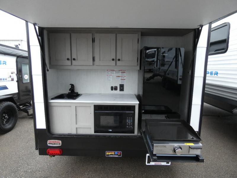 When you want to explore choose this travel trailer for your basic off-road adventure needs and a bit more by offering you a 54" X 74" flip-up bed with storage beneath, and gaucho seating that pulls out into a bed for an additional camper at night. There is front and rear overhead cabinetry for storage, and a cassette toilet for added convenience especially at night. A rear hatch camp kitchen provides a place for you to create meals and snacks while you explore. There is a slide-out griddle and grill combo cooktop, a 3.3 cu. ft. 12-volt refrigerator for your cold items, a single sink, and two burner cooktop, plus a microwave oven. A 9' power awning creates a bit of added outdoor living space where you can set up your camp chairs.