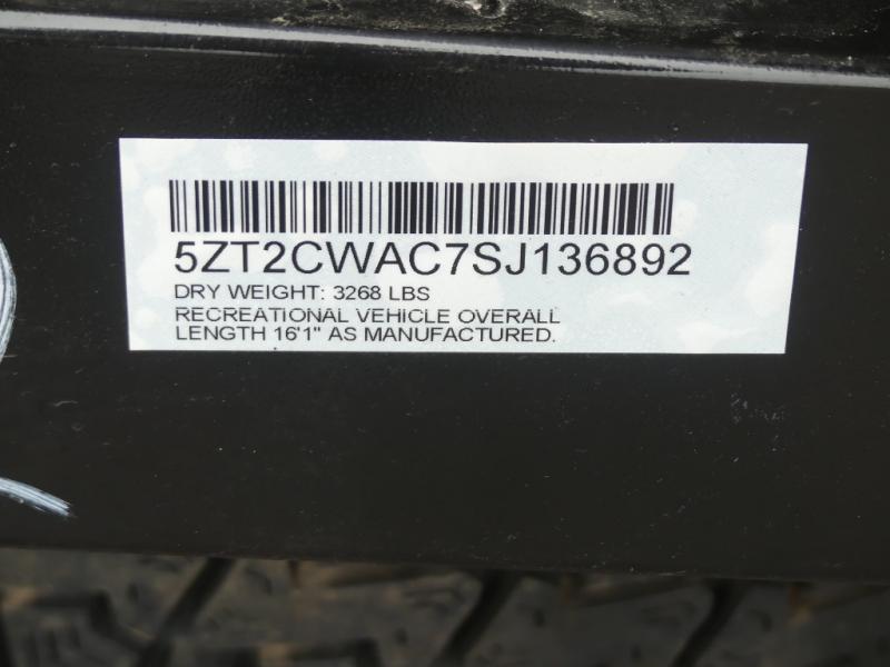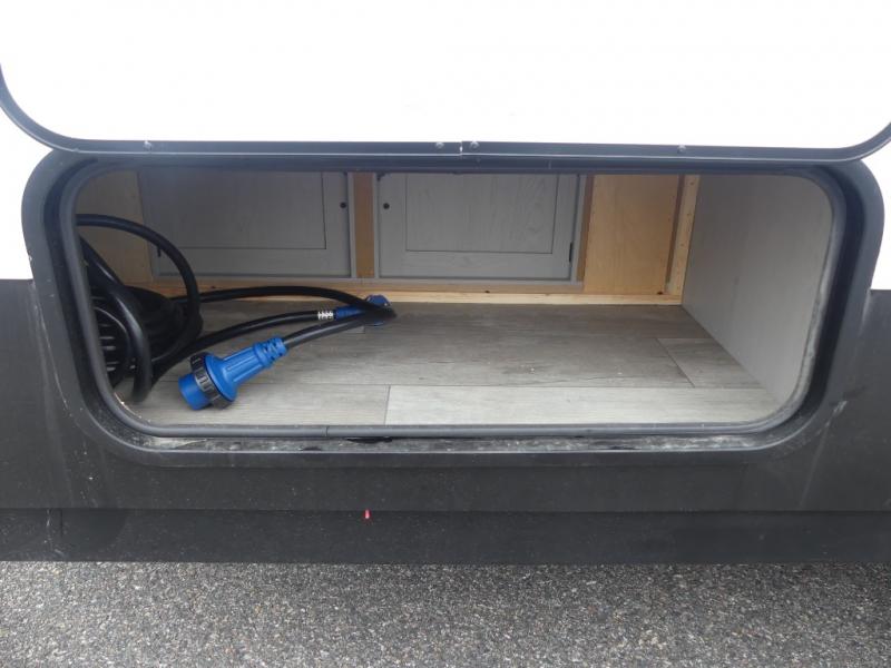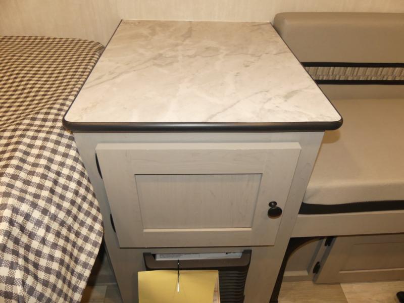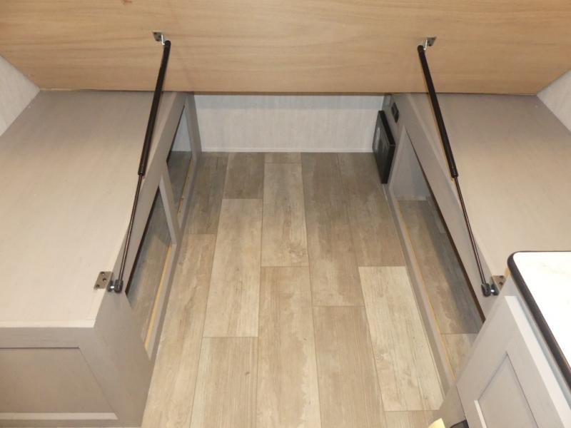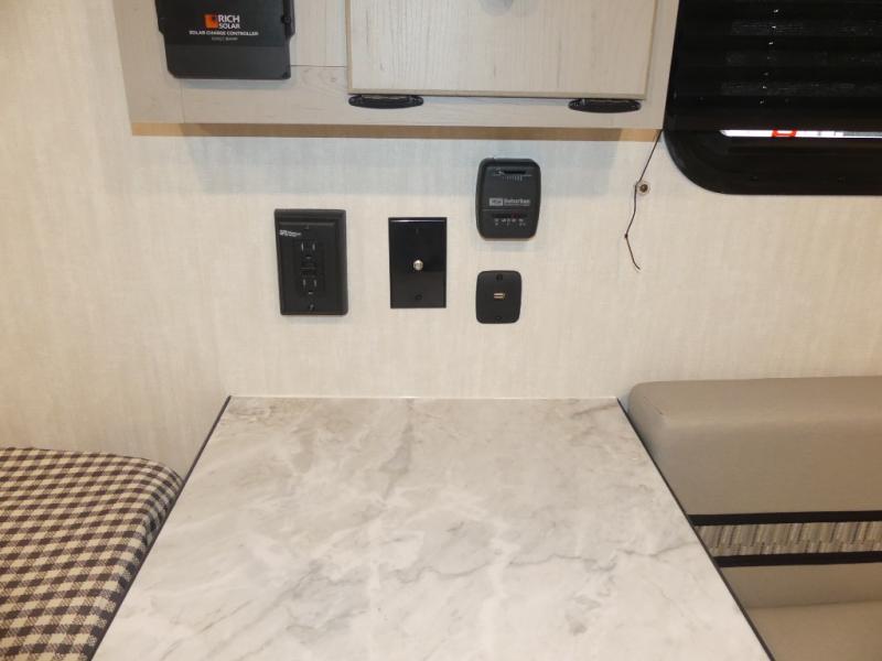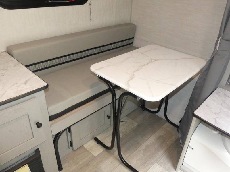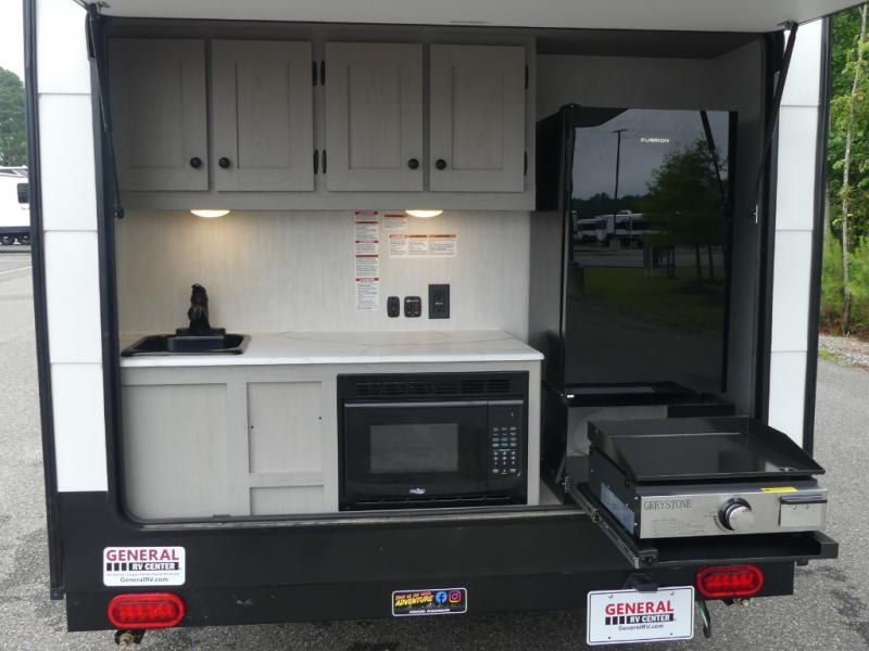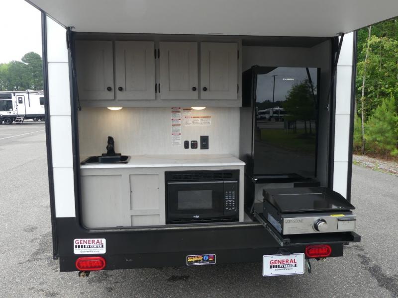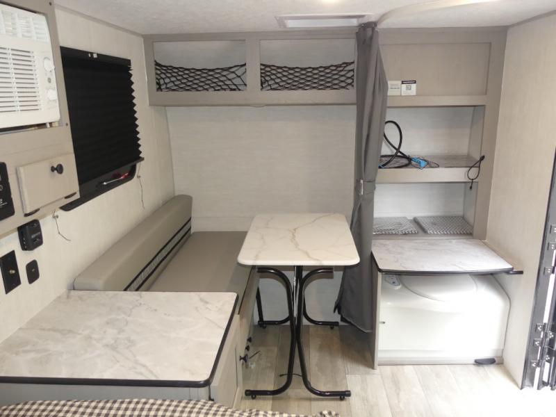 When you want to explore choose this travel trailer for your basic off-road adventure needs and a bit more by offering you a 54" X 74" flip-up bed with storage beneath, and gaucho seating that pulls out into a bed for an additional camper at night. There is front and rear overhead cabinetry for storage, and a cassette toilet for added convenience especially at night. A rear hatch camp kitchen provides a place for you to create meals and snacks while you explore. There is a slide-out griddle and grill combo cooktop, a 3.3 cu. ft. 12-volt refrigerator for your cold items, a single sink, and two burner cooktop, plus a microwave oven. A 9' power awning creates a bit of added outdoor living space where you can set up your camp chairs.