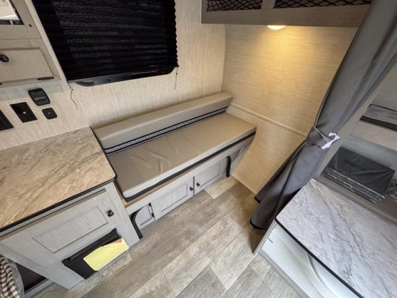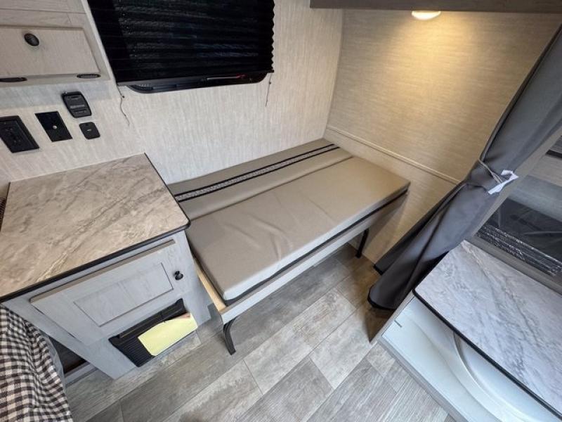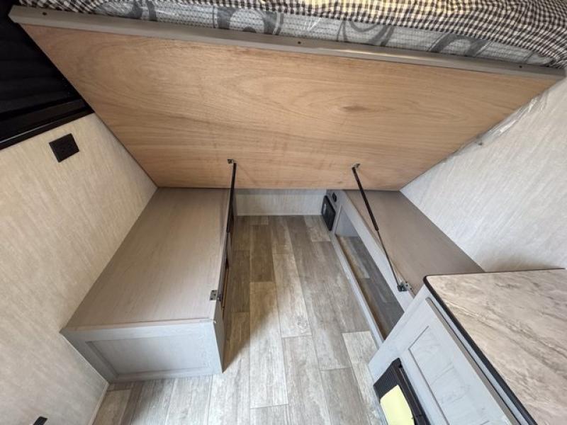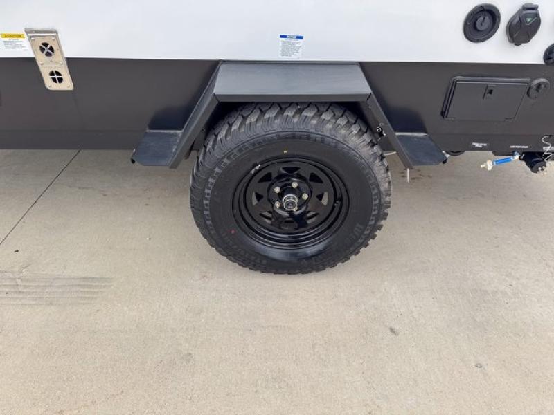 When you want to explore choose this travel trailer for your basic off-road adventure needs and a bit more by offering you a 54" X 74" flip-up bed with storage beneath, and gaucho seating that pulls out into a bed for an additional camper at night. There is front and rear overhead cabinetry for storage, and a cassette toilet for added convenience especially at night. A rear hatch camp kitchen provides a place for you to create meals and snacks while you explore. There is a slide-out griddle and grill combo cooktop, a 3.3 cu. ft. 12-volt refrigerator for your cold items, a single sink, and two burner cooktop, plus a microwave oven. A 9' power awning creates a bit of added outdoor living space where you can set up your camp chairs. You can also add an optional roof-top tent for additional sleeping.