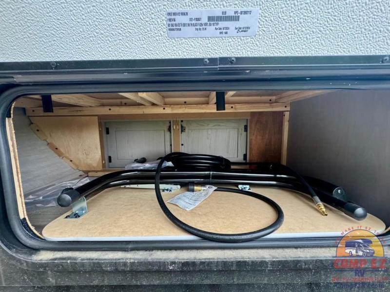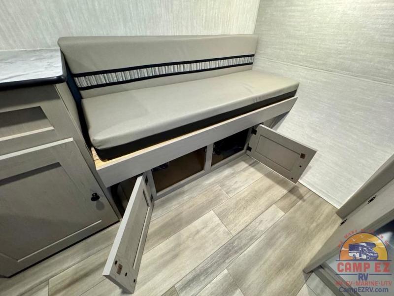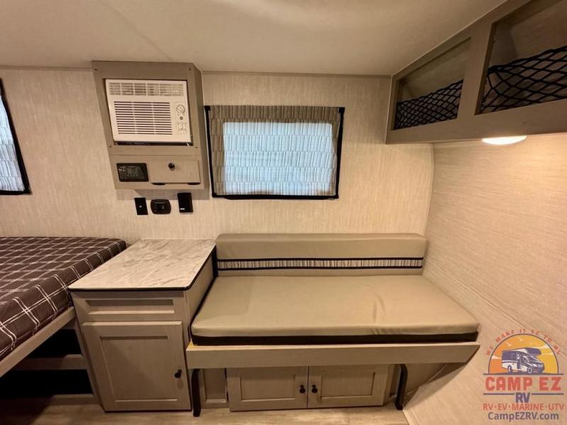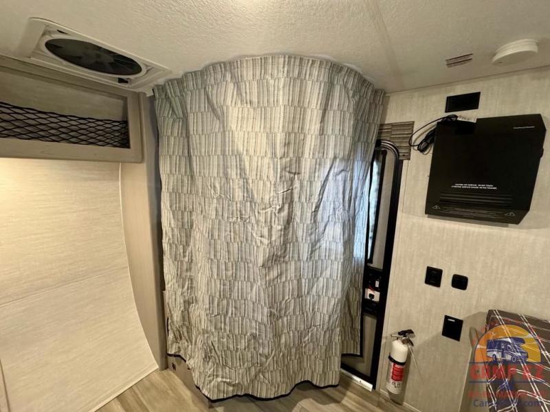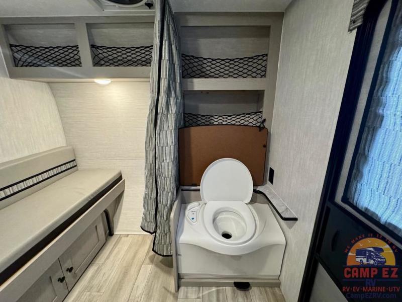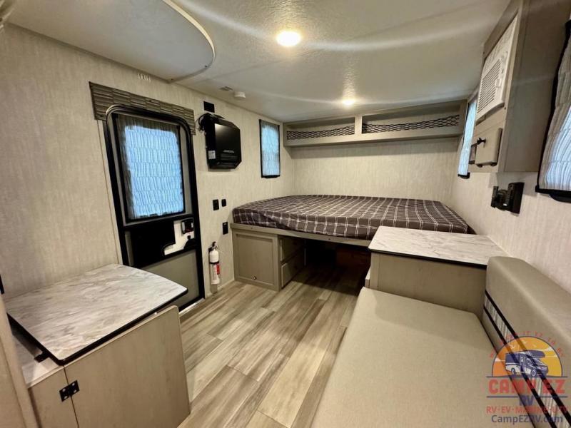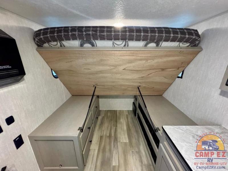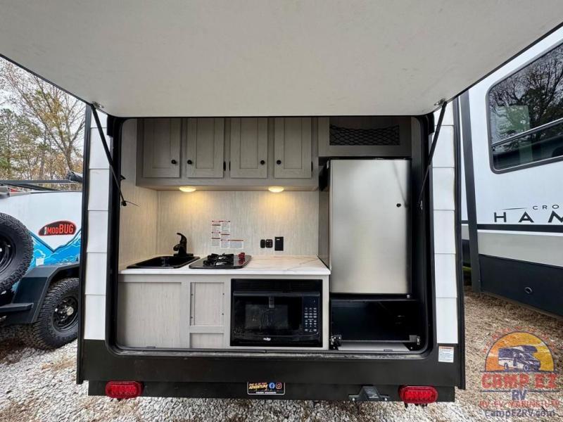 When you want to explore choose this travel trailer for your basic off-road adventure needs and a bit more by offering you a 54" X 74" flip-up bed with storage beneath, and gaucho seating that pulls out into a bed for an additional camper at night. There is front and rear overhead cabinetry for storage, and a cassette toilet for added convenience especially at night. A rear hatch camp kitchen provides a place for you to create meals and snacks while you explore. There is a slide-out griddle and grill combo cooktop, a 3.3 cu. ft. 12-volt refrigerator for your cold items, a single sink, and two burner cooktop, plus a microwave oven. A 9' power awning creates a bit of added outdoor living space where you can set up your camp chairs. You can also add an optional roof-top tent for additional sleeping.