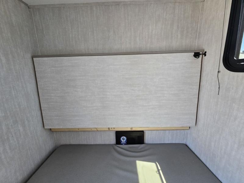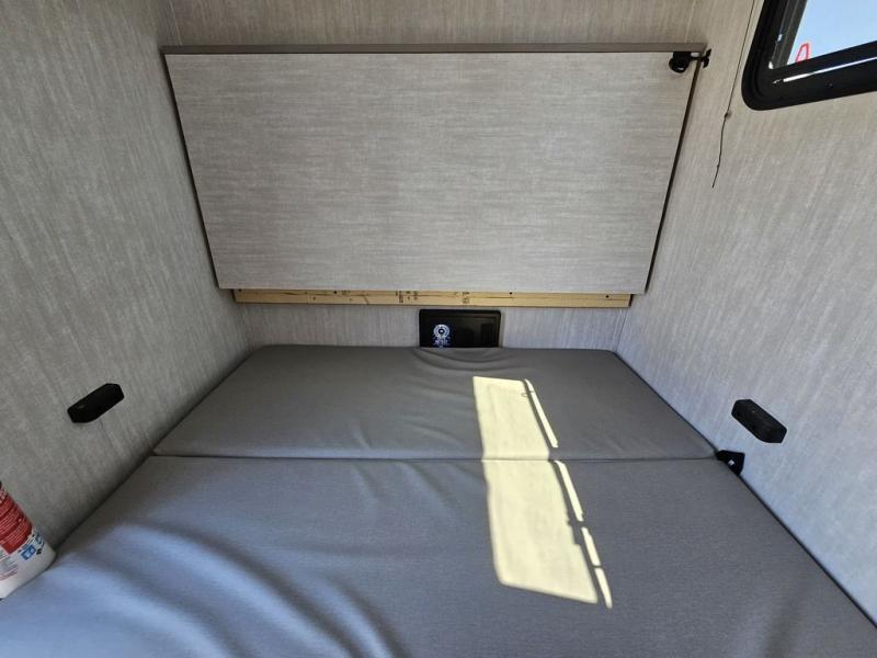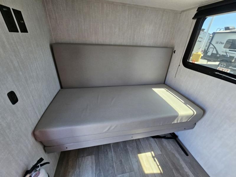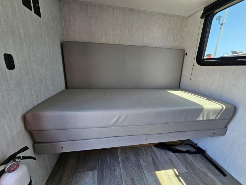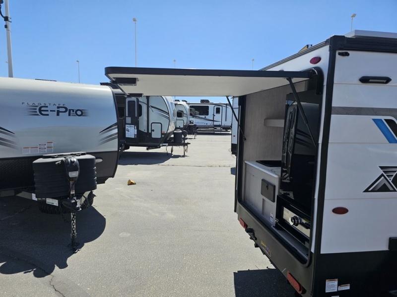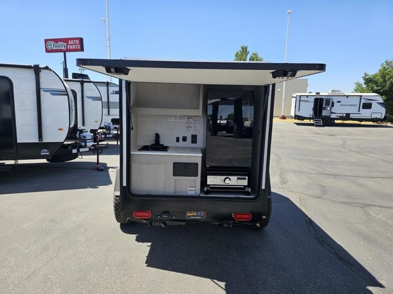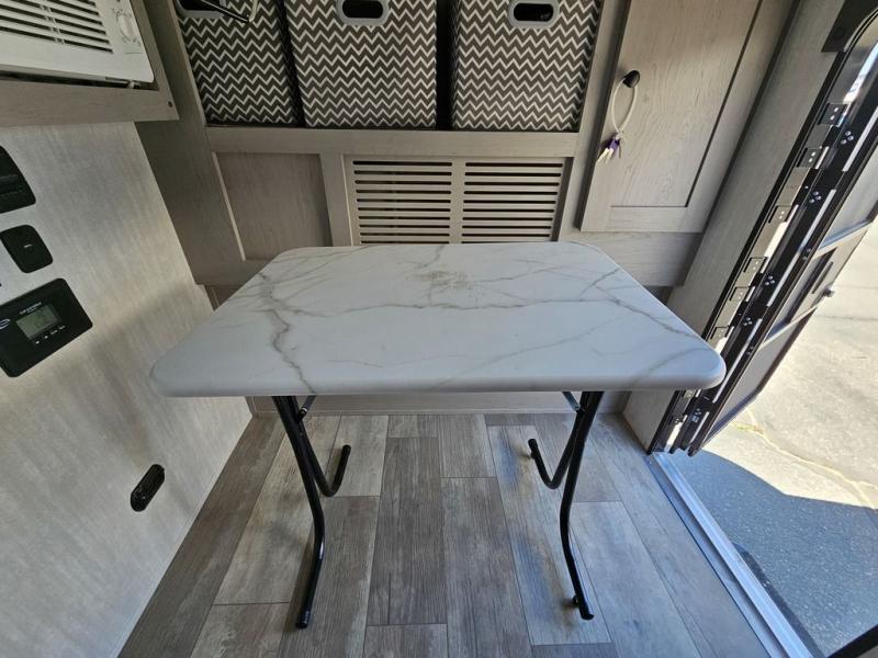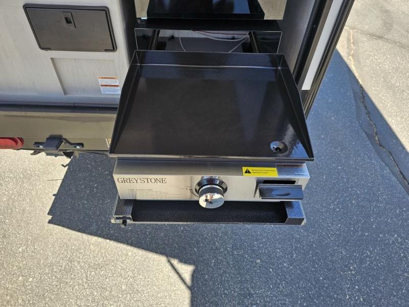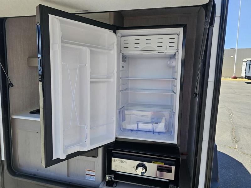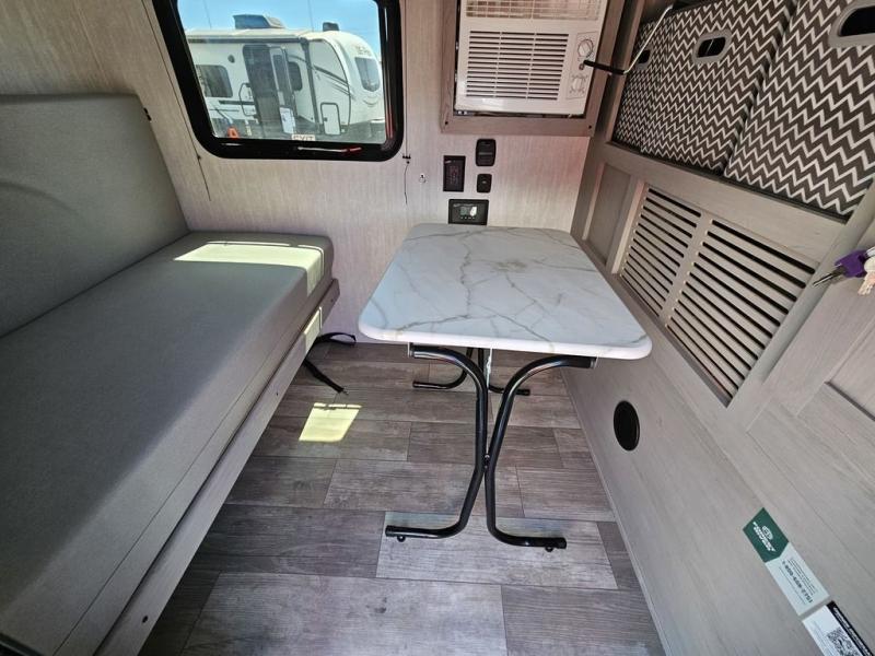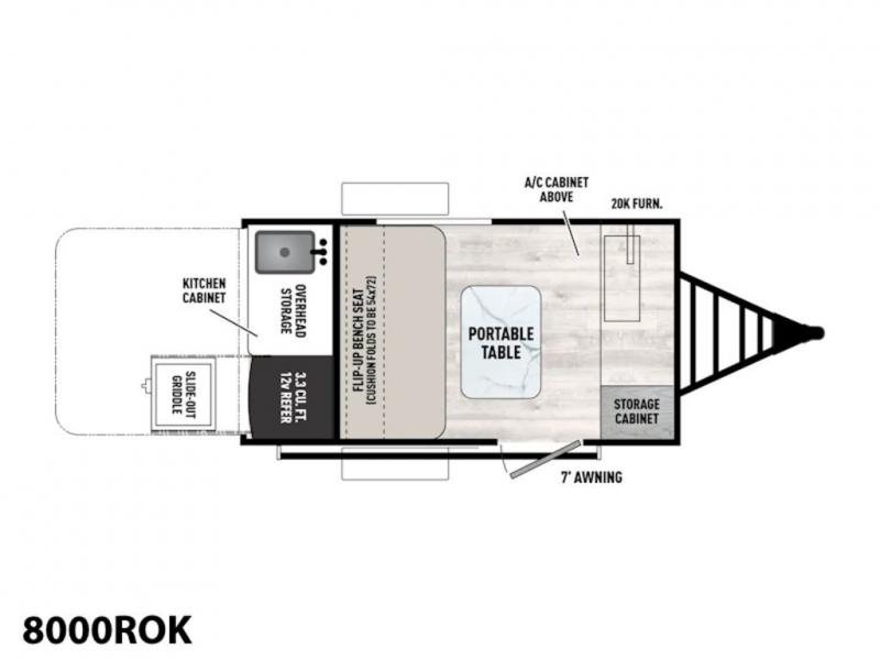 This travel trailer features a little more interior space since there is a flip-up bench seat that folds down to a 54" x 72" bed, and the portable table provides a place to dine together. You'll also find a storage cabinet, a 20K furnace and an A/C cabinet to keep you comfortable. The rear hatch kitchen includes a slide-out griddle to cook meals plus a 3.3 cu. ft. 12V refrigerator and cabinet for food storage.