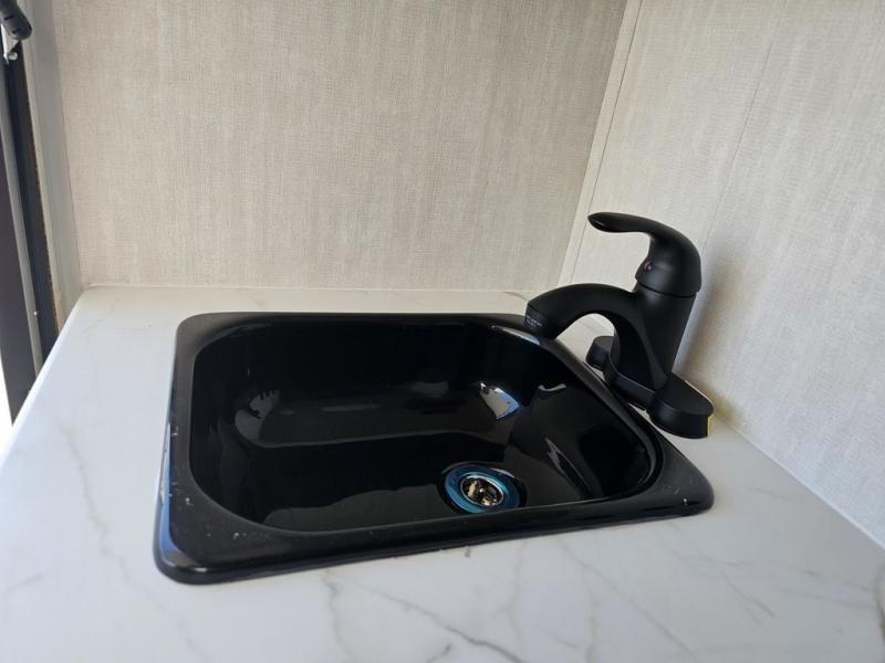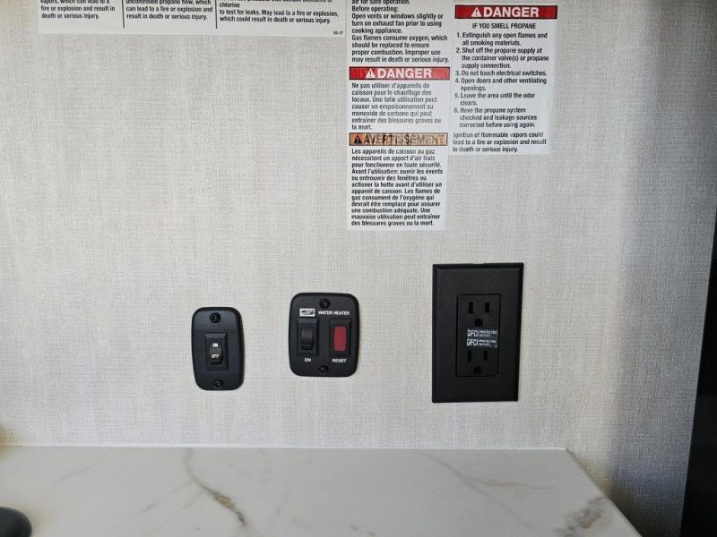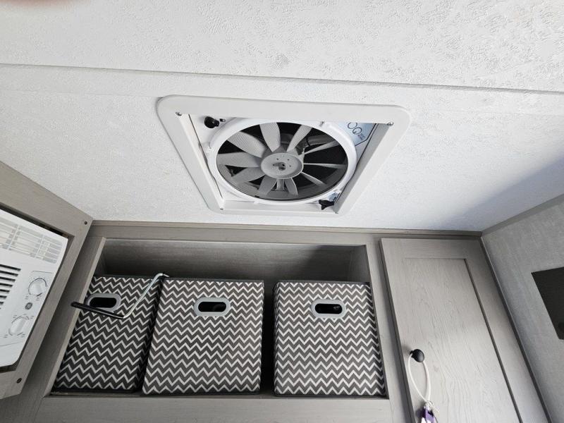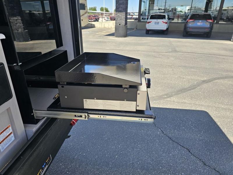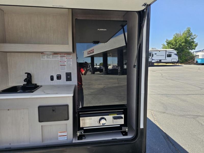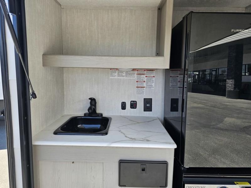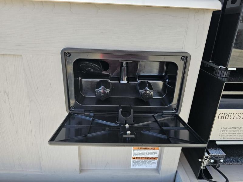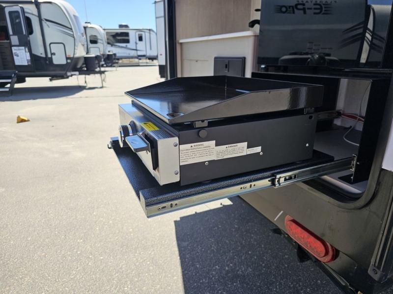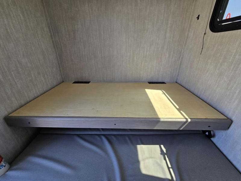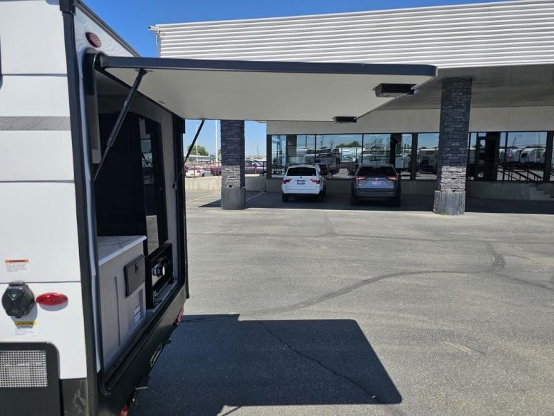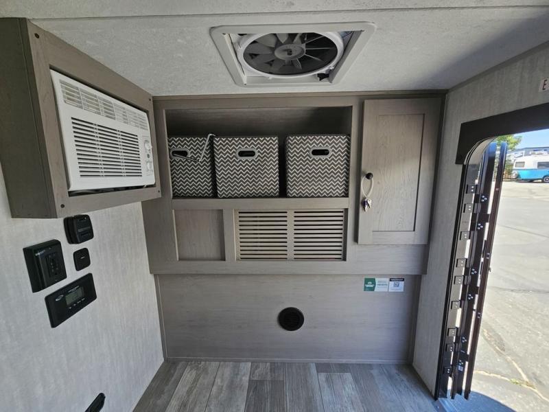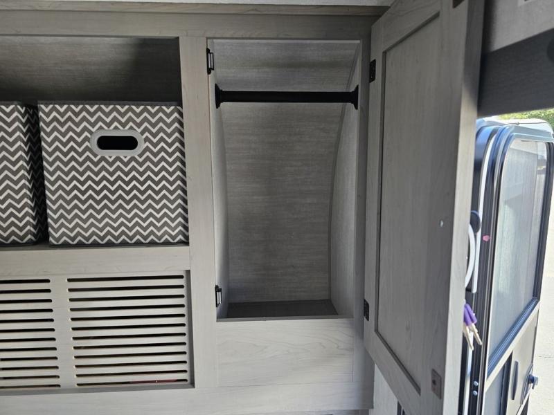 This travel trailer features a little more interior space since there is a flip-up bench seat that folds down to a 54" x 72" bed, and the portable table provides a place to dine together. You'll also find a storage cabinet, a 20K furnace and an A/C cabinet to keep you comfortable. The rear hatch kitchen includes a slide-out griddle to cook meals plus a 3.3 cu. ft. 12V refrigerator and cabinet for food storage.