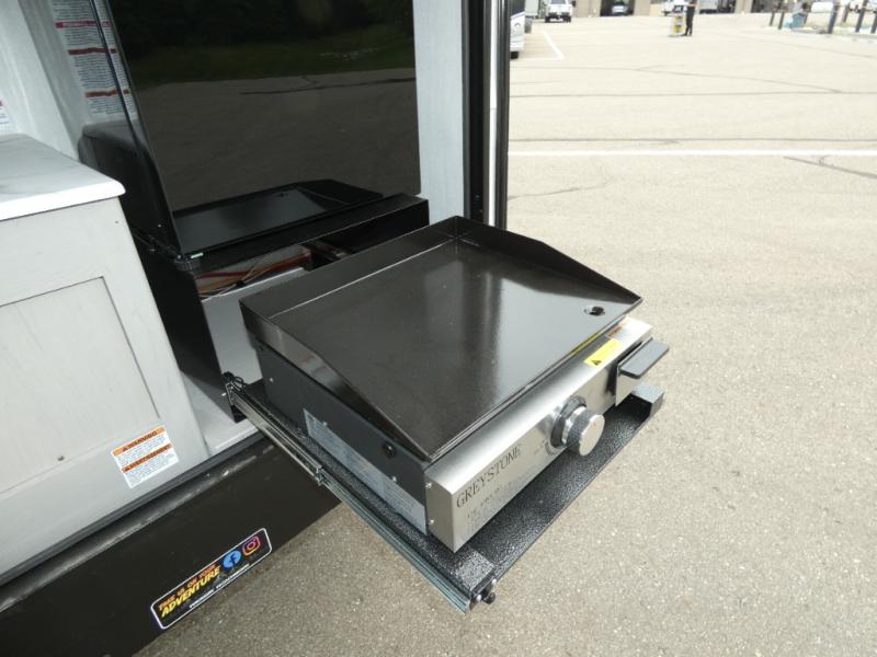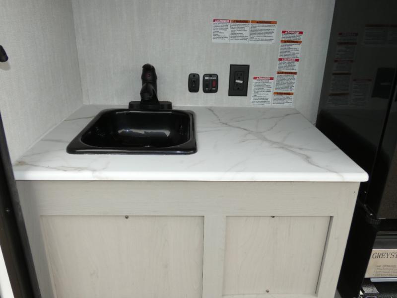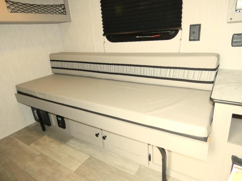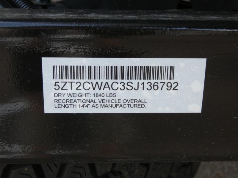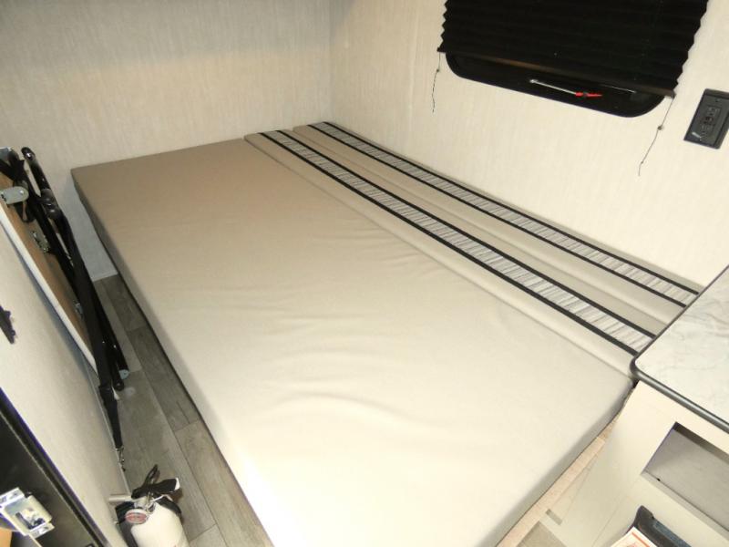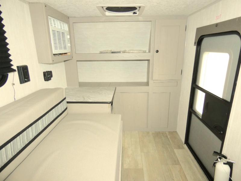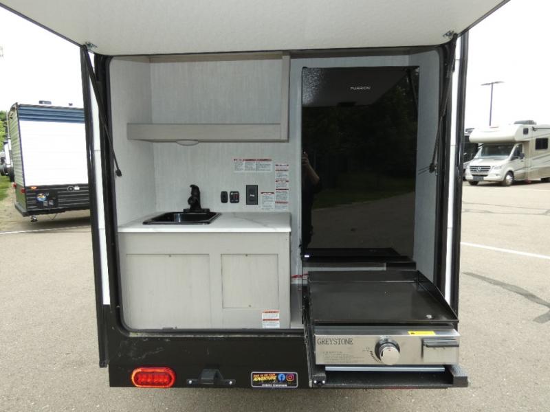 This travel trailer features your basic off-road adventure needs by providing you a 74" gaucho seating that pulls out into a bed at night. There is open shelving along the front wall for your things, plus a wardrobe for clothing. A rear overhead cabinet offers more space to store your gear, and the rear hatch provides a place for you to create meals and snacks while you explore. There is a slide-out griddle, a 3.3 cu. ft. 12-volt refrigerator for your cold items, and a single sink and overhead cabinet. There is also a 9' bag awning for added outdoor living, plus additional storage.