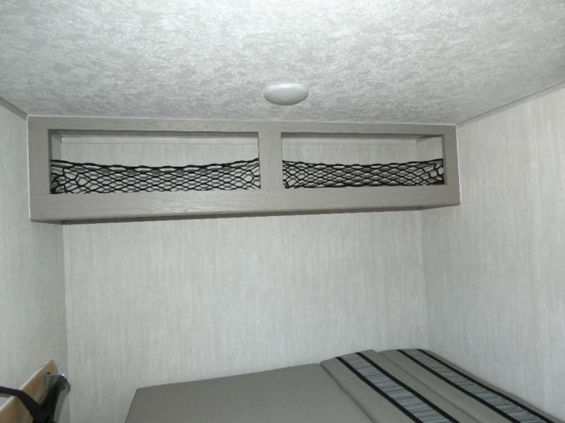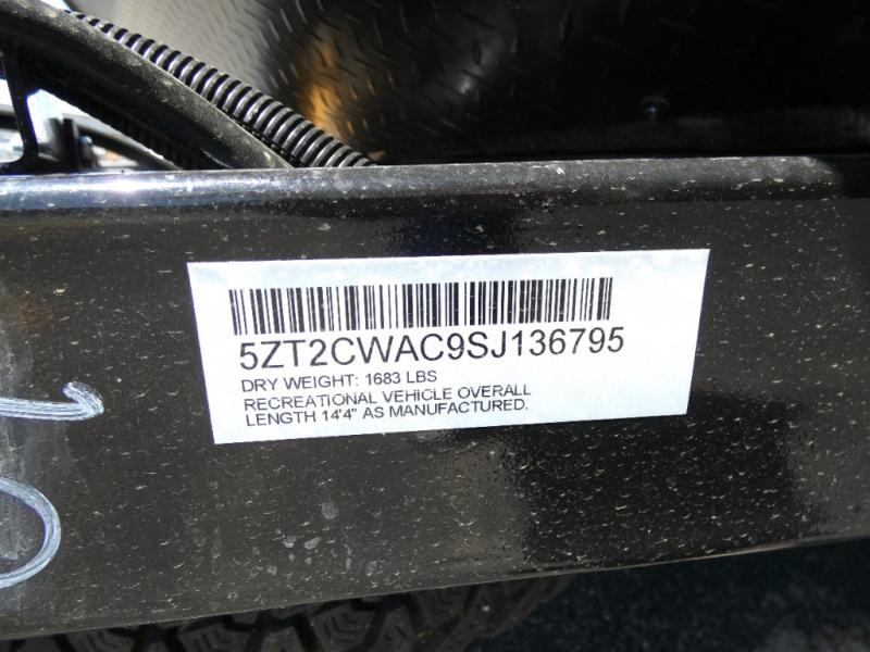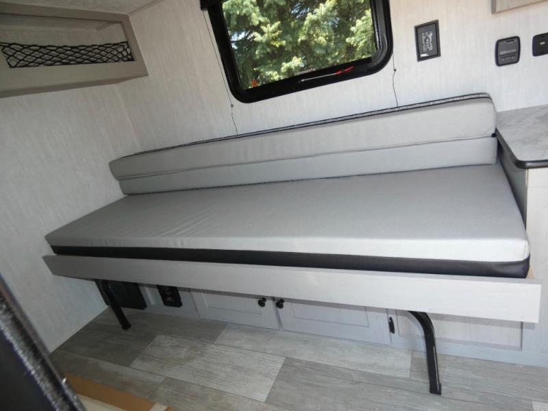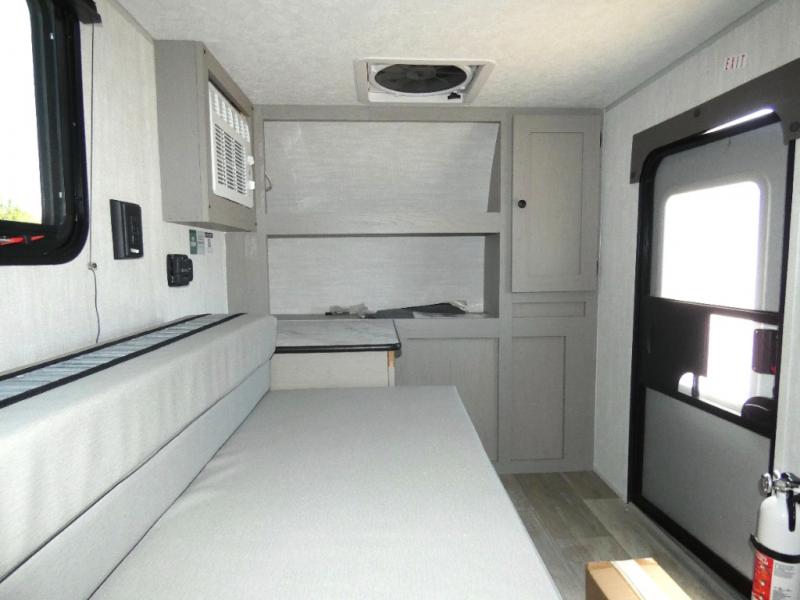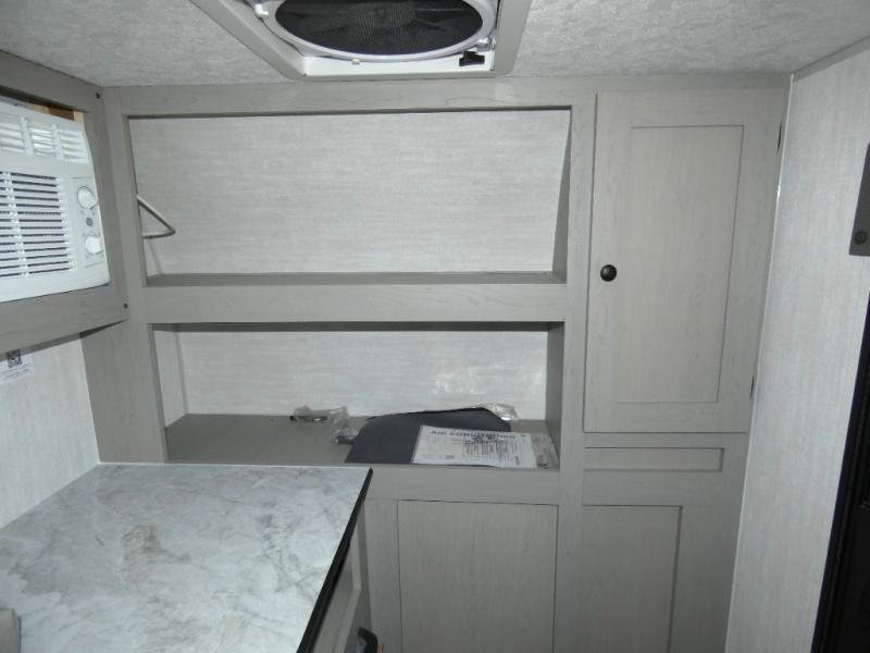 This travel trailer features your basic off-road adventure needs by providing you a 74" gaucho seating that pulls out into a bed at night. There is open shelving along the front wall for your things, plus a wardrobe for clothing. A rear overhead cabinet offers more space to store your gear, and the rear hatch provides a place for you to create meals and snacks while you explore. There is a slide-out griddle, a 3.3 cu. ft. 12-volt refrigerator for your cold items, and a single sink and overhead cabinet. There is also a 9' bag awning for added outdoor living, plus additional storage.
