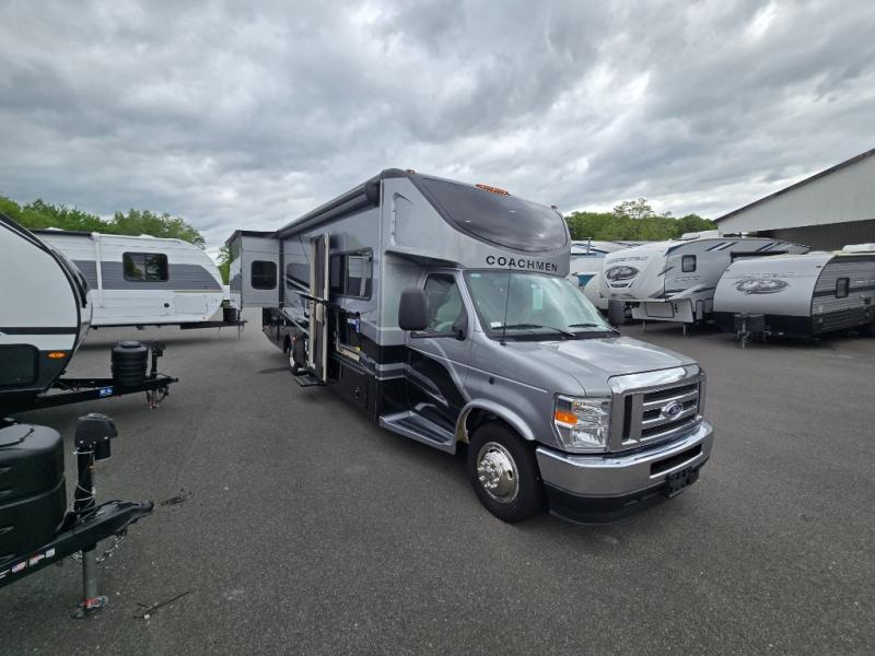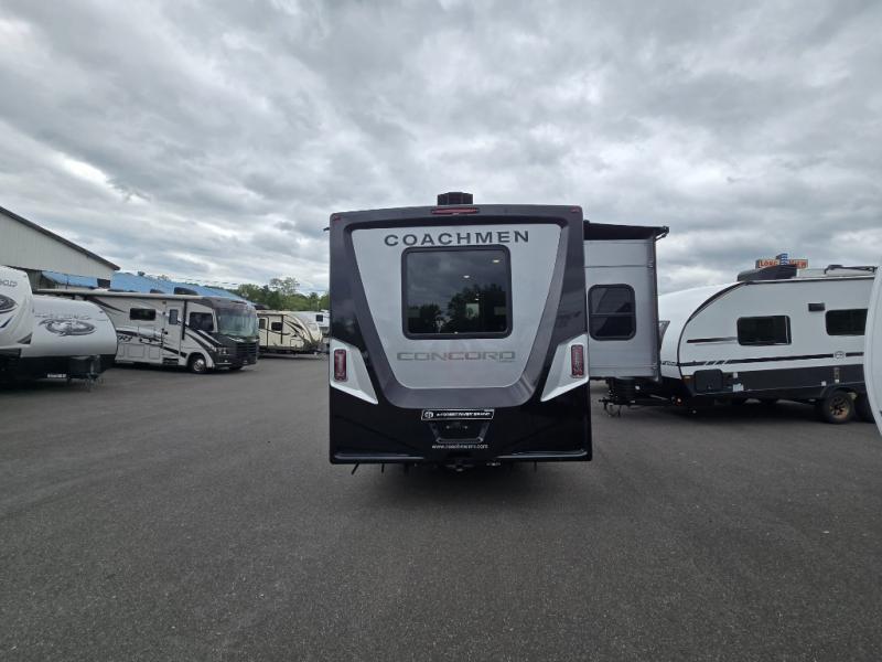 Start traveling in a convenient and comfortable way with one of these Coachmen RV Concord Class C gas motorhomes! They are built on a Ford E-450 chassis with a 7.3L V8 engine to power you to every destination. The molded rear fiberglass cap has backup proximity sensors and the molded front fiberglass cap has an oversized window for you to clearly see your surroundings. An auto flex rear air ride suspension not only provides a smooth ride, but also an increased roll stability and consistent vehicle ride height. You will appreciate the Aqua View Showermiser system and tankless on demand water heater. Stay cool even on the hottest summer day with the dual 15,000 BTU A/C's with heat pumps. Come check out what else they have to offer!