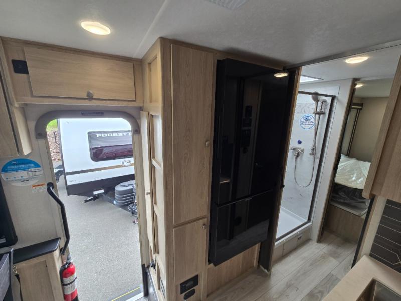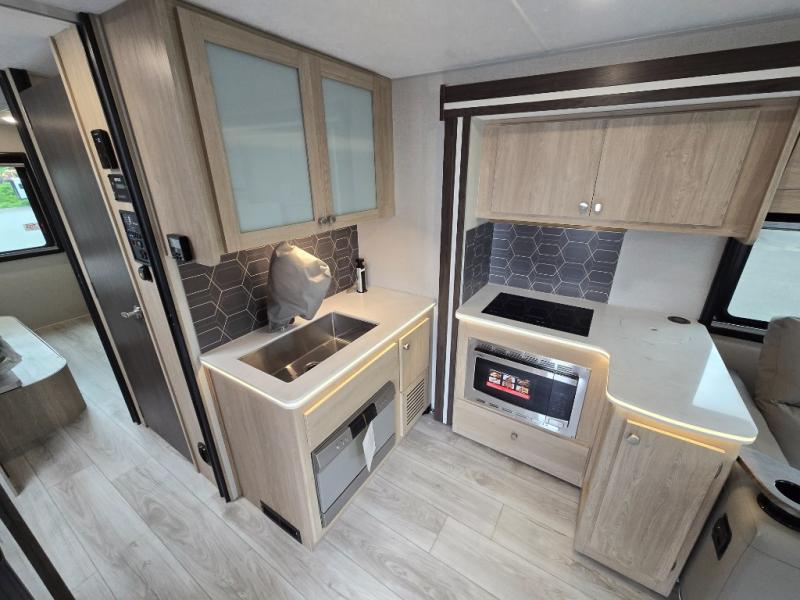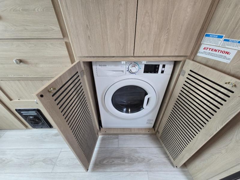 You will travel the highway in true comfort with this motorhome! After a long day of traveling, you can head to the rear private bedroom and lay down on the king bed slide across from a dresser with a 32" Smart TV and even an area prepped to add an optional washer and dryer. The separated bathroom allows one person to clean up in the 24" x 36" shower while another uses the private toilet and sink. The chef can prepare their best meals with the two burner induction cooktop, convection microwave, and 10 cu. ft. 12V double door refrigerator. Enjoy your meals at the free standing dinette with four chairs then let your stomach settle in one of the two recliners while you watch a show on the 39" Smart TV or you could head to the outside entertainment center with a TV/HDMI port/Bluetooth soundbar!