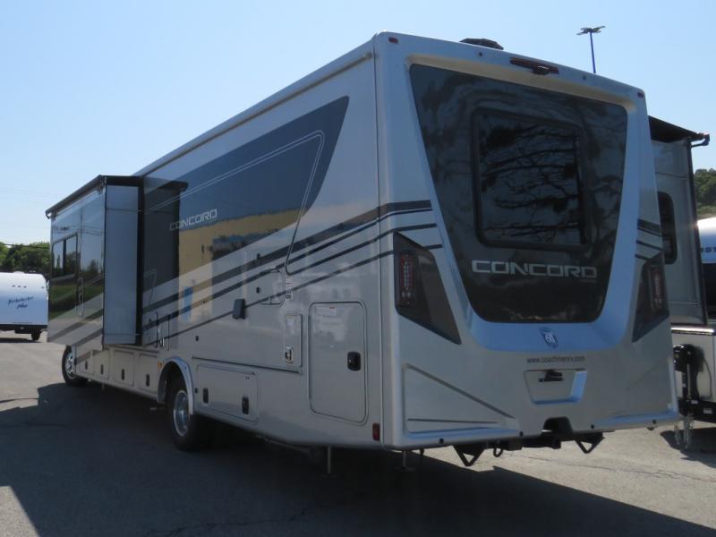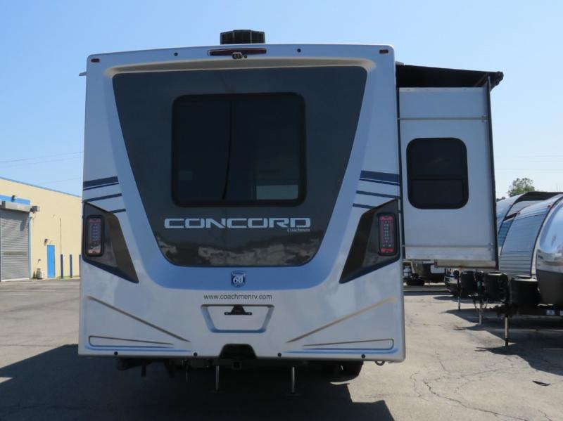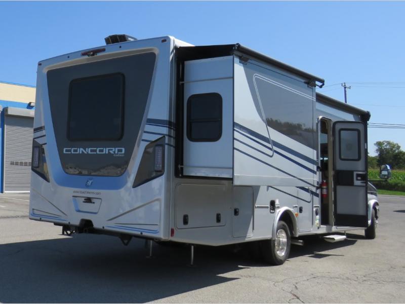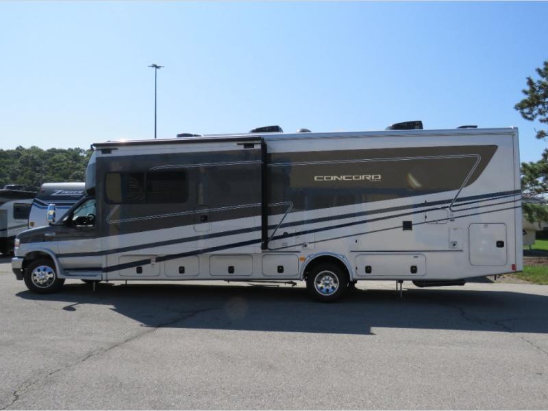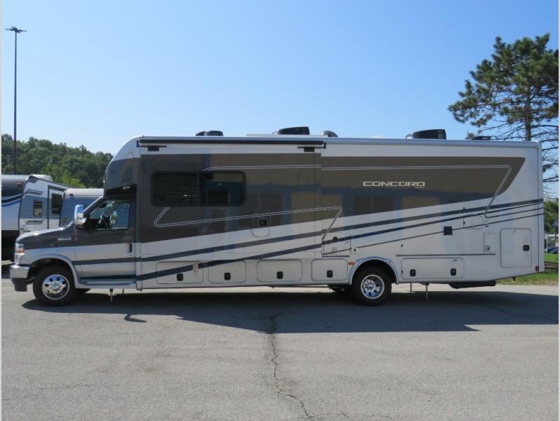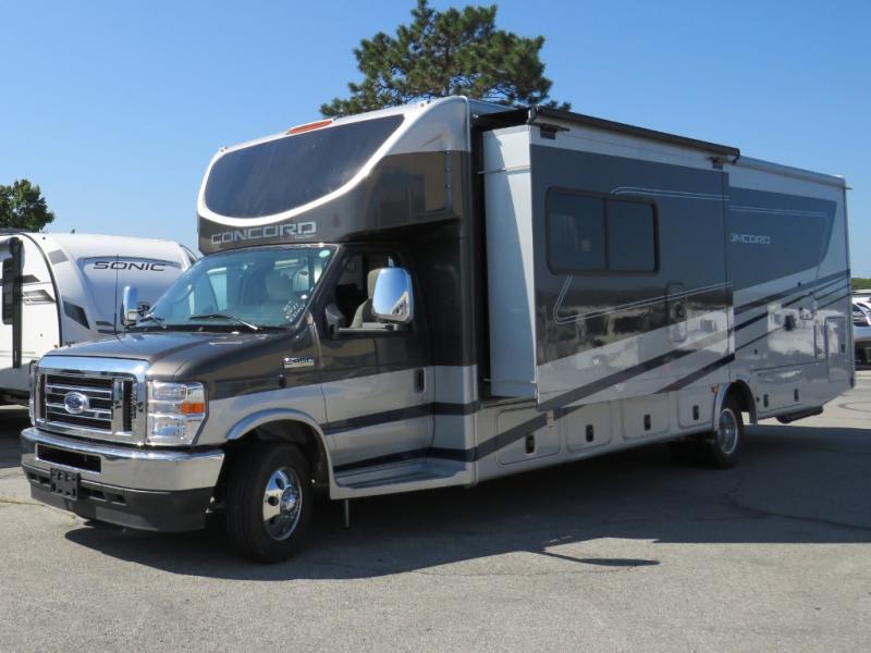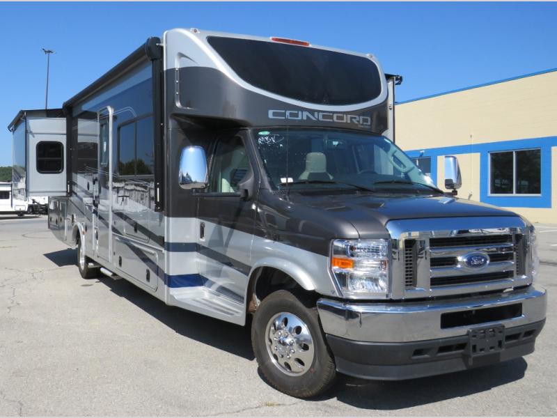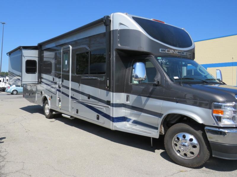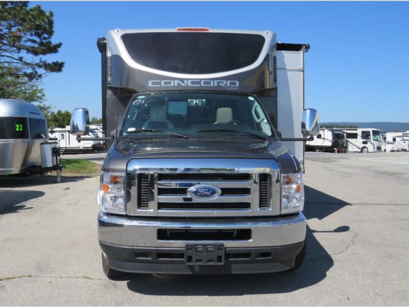 Start traveling in a convenient and comfortable way with one of these Coachmen RV Concord Class C gas motorhomes! They are built on a Ford E-450 chassis with a 7.3L V8 engine to power you to every destination. The molded rear fiberglass cap has backup proximity sensors and the molded front fiberglass cap has an oversized window for you to clearly see your surroundings. An auto flex rear air ride suspension not only provides a smooth ride, but also an increased roll stability and consistent vehicle ride height. You will appreciate the Aqua View Showermiser system and tankless on demand water heater. Stay cool even on the hottest summer day with the dual 15,000 BTU A/C's with heat pumps. Come check out what else they have to offer!
