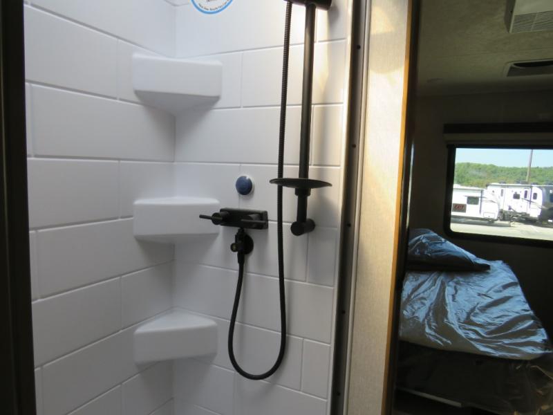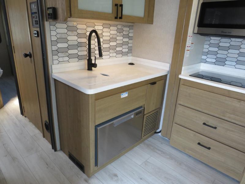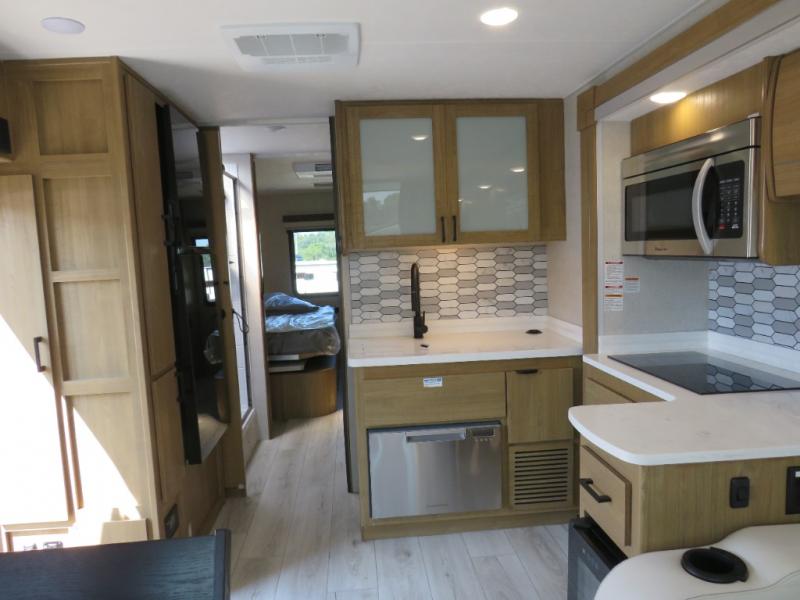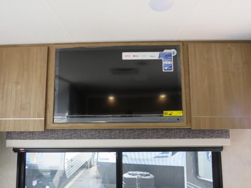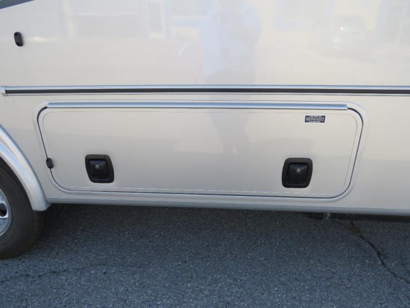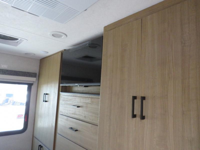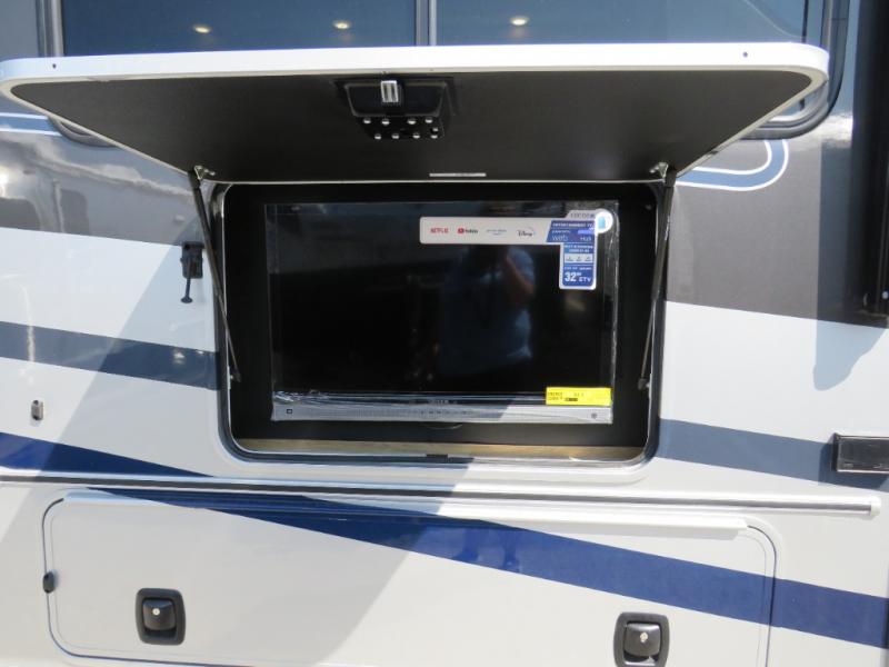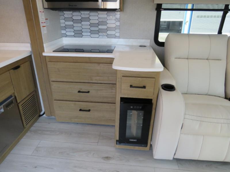 You will travel the highway in true comfort with this motorhome! After a long day of traveling, you can head to the rear private bedroom and lay down on the king bed slide across from a dresser with a 32" Smart TV and even an area prepped to add an optional washer and dryer. The separated bathroom allows one person to clean up in the 24" x 36" shower while another uses the private toilet and sink. The chef can prepare their best meals with the two burner induction cooktop, convection microwave, and 10 cu. ft. 12V double door refrigerator. Enjoy your meals at the free standing dinette with four chairs then let your stomach settle in one of the two recliners while you watch a show on the 39" Smart TV or you could head to the outside entertainment center with a TV/HDMI port/Bluetooth soundbar!