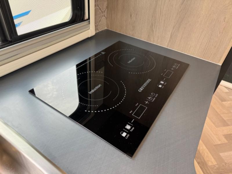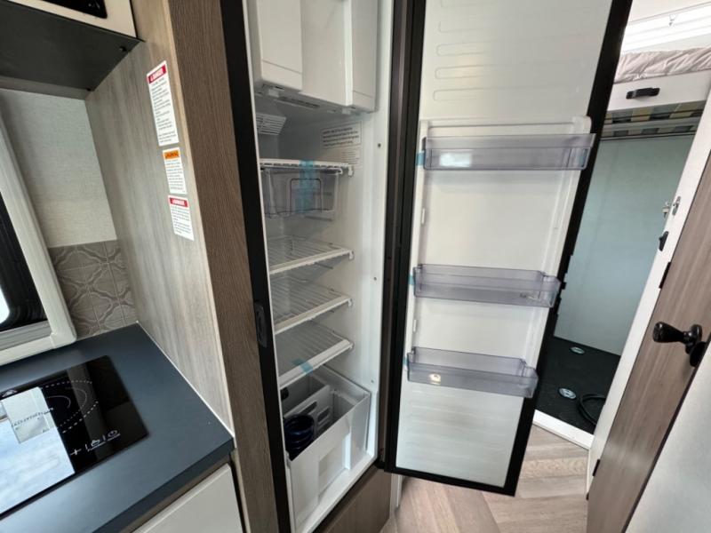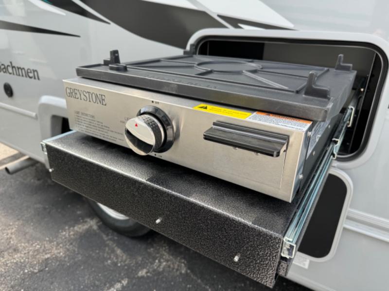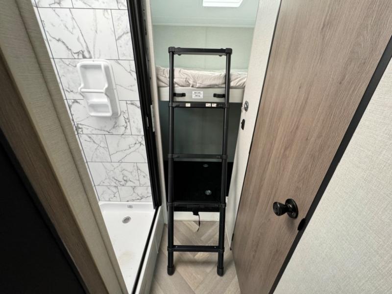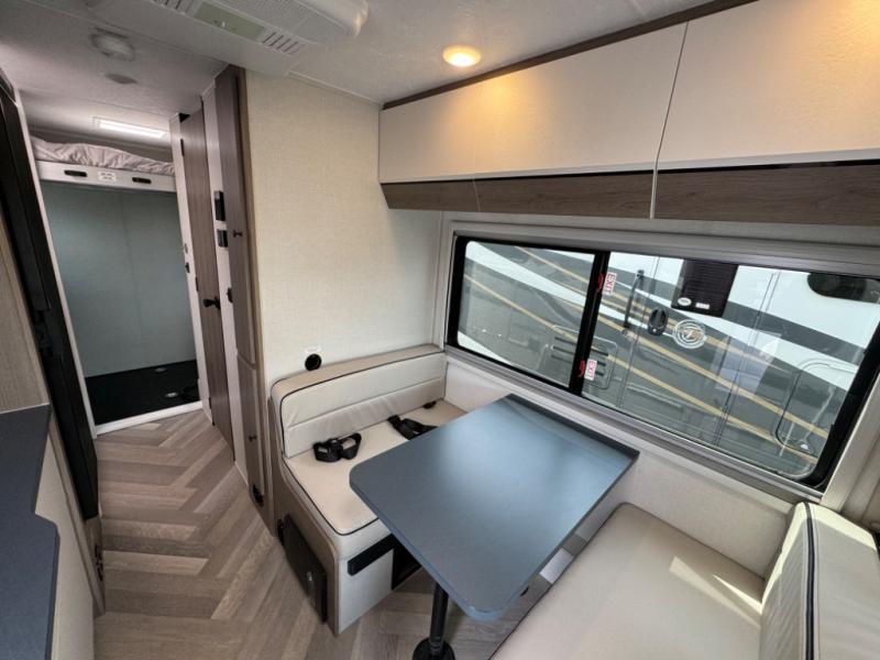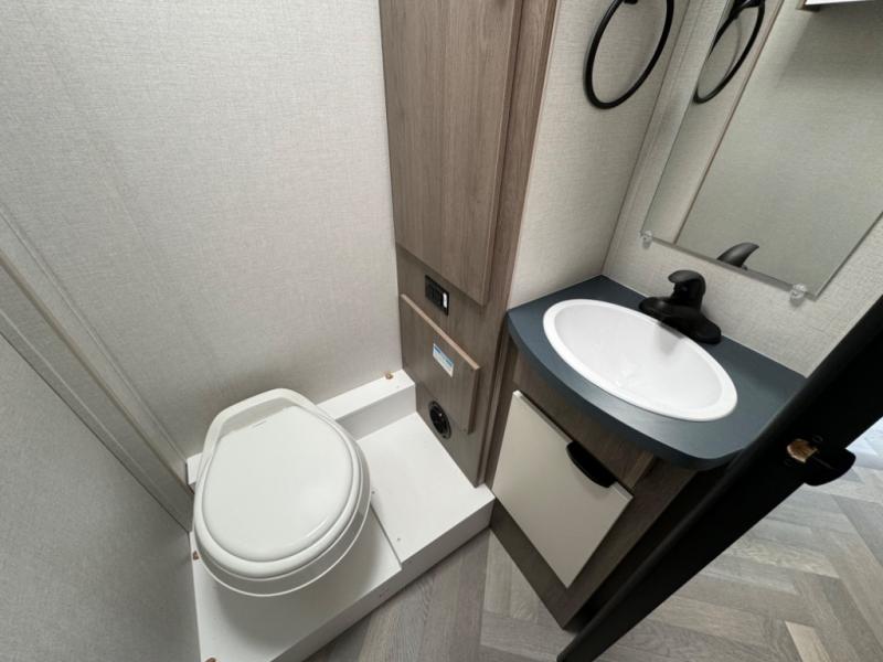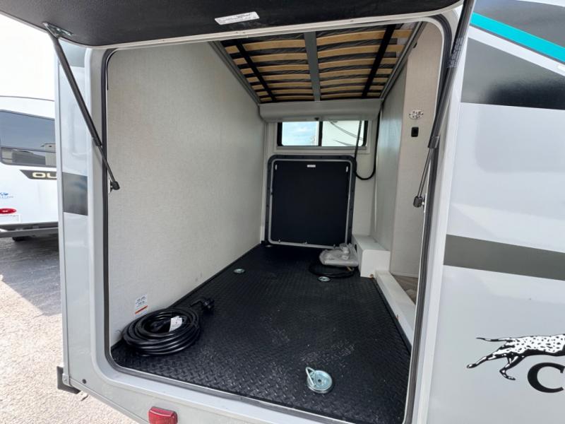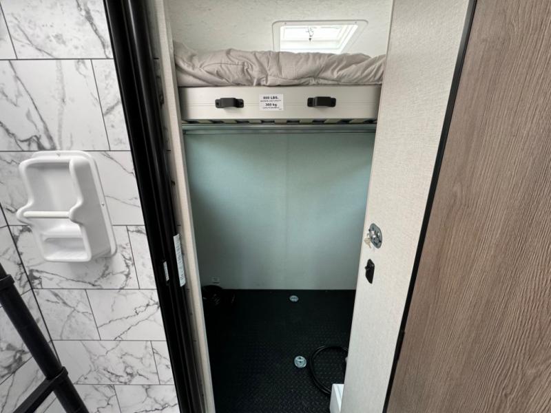 This coach is compact and full of features for you and your favorite person or family of three to enjoy road trips and camping in tighter spaces than most! The chef of your group can prepare a quick lunch on the two burner cooktop, and you can dine together on the dinette/sofa that offers sleeping for one at night. There is a large shower to clean up in, and the private toilet and sink is just across the hall so two people can freshen up at once. This coach also includes plenty of storage space in overhead compartments, within the pantry for snacks and paper goods, and even under the double-size bed where you might like to store your bike through the exterior cargo doors that open on both sides!