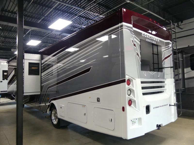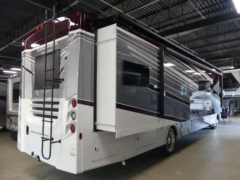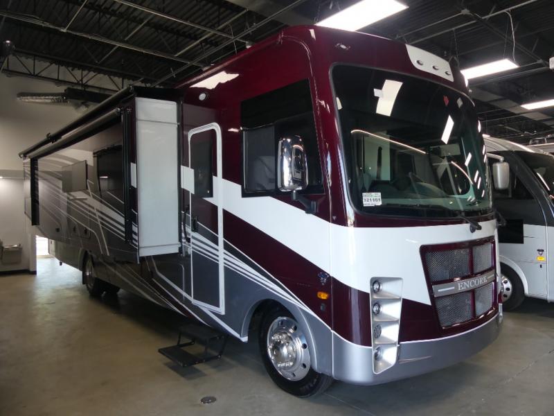 Each one of these Coachmen RV Encore Class A gas motorhomes have been engineered for maximum comfort! A Ford F53 chassis holds them together and a 7.3L V8 engine powers them to each destination. Both the crowned, laminated fiberglass roof and the high gloss gelcoat sidewalls come with Azdel superlite composite to prevent your unit from rotting away. Automatic leveling jacks make for an easy and quick set up when you arrive. You will appreciate having an exterior propane hookup and the pas-through full basement storage area has plenty of space for all of your outdoor gear, plus the radius trunk doors come with slam latch. With high definition back up and side cameras, you can travel with peace of mind. Come find your favorite one today!