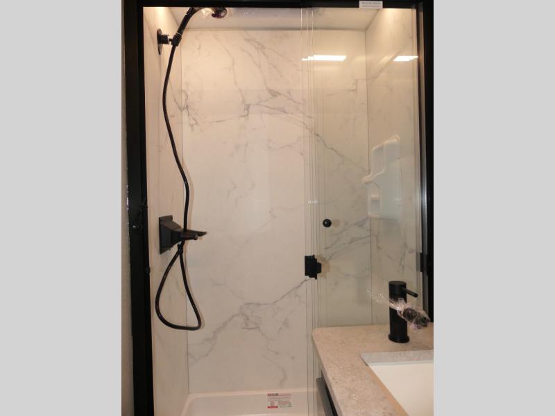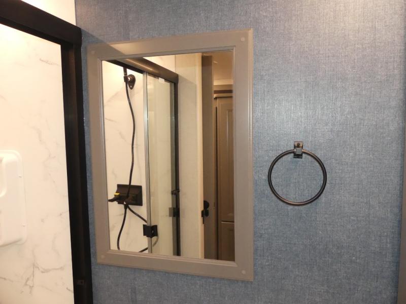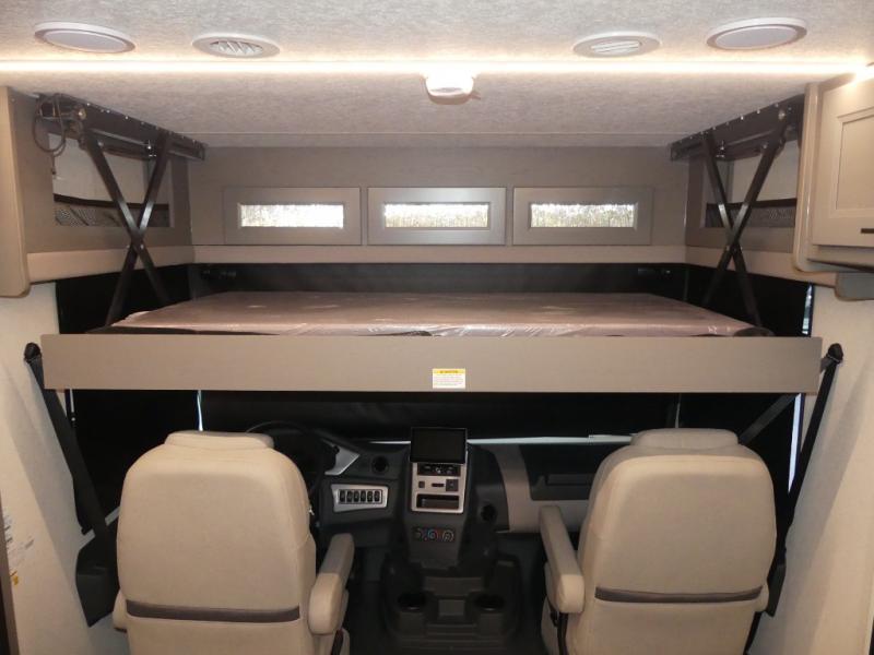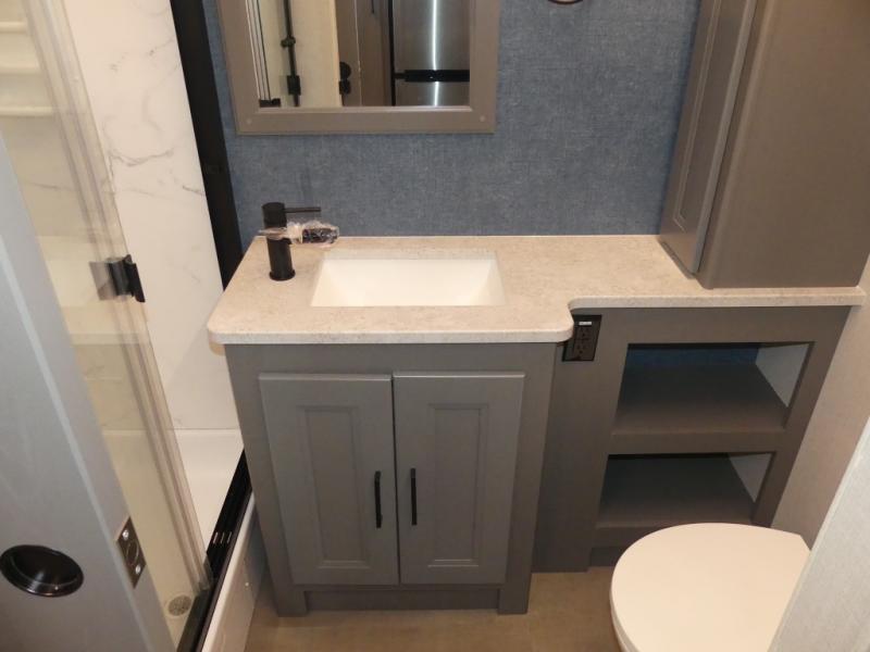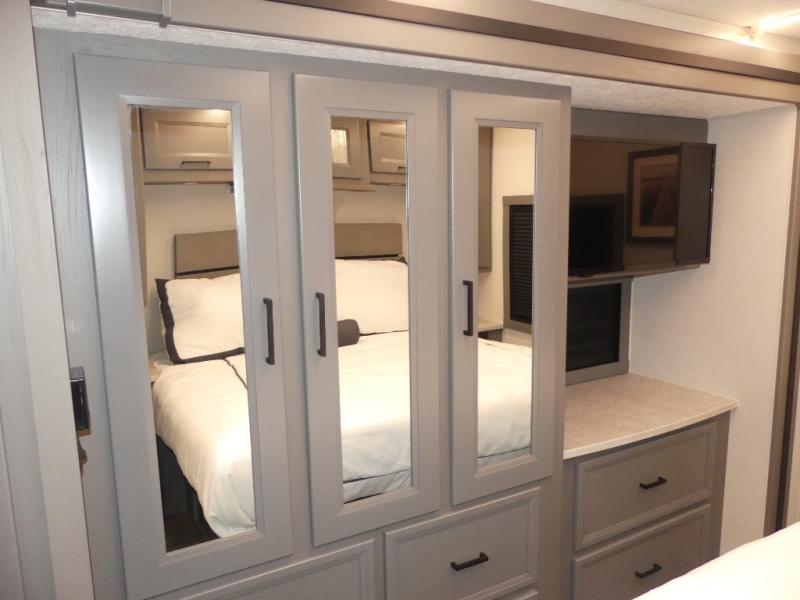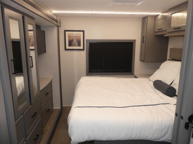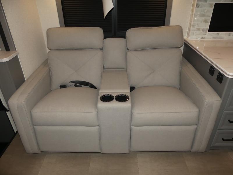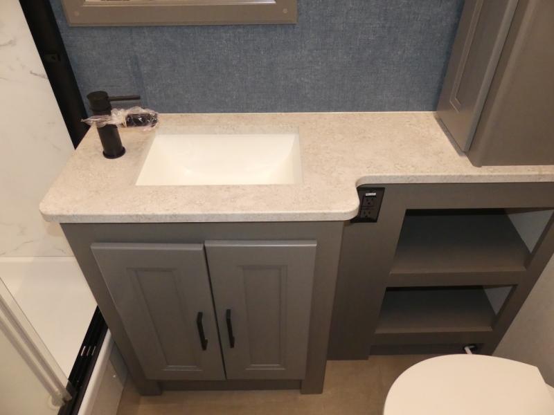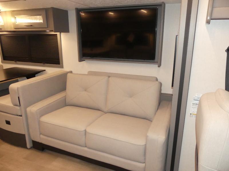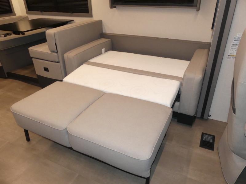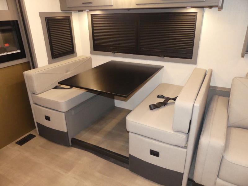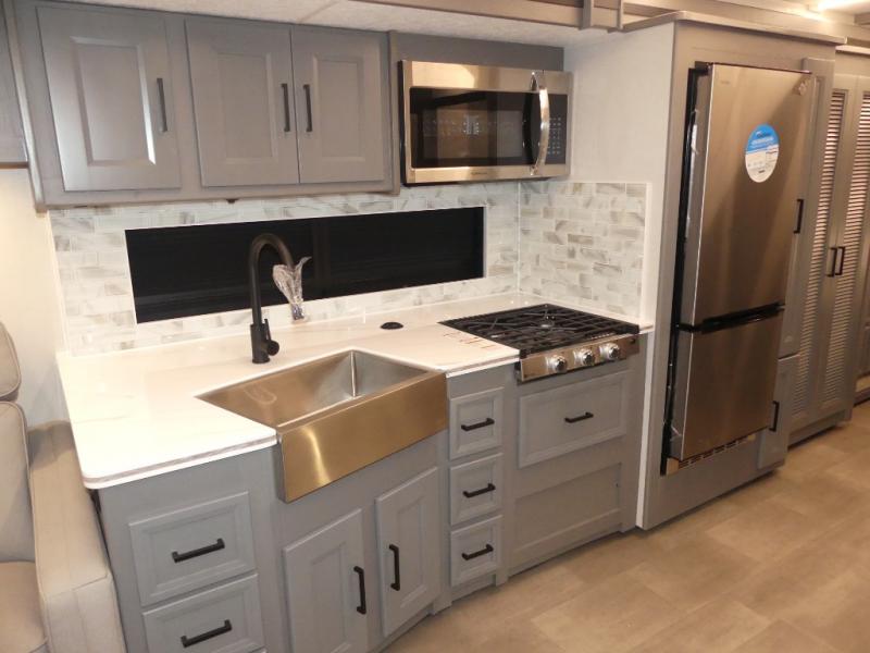 You won't even feel like you're on the road with this motorhome! The fully equipped kitchen has everything you need to prepare your delicious meals including a farm sink for easy clean up. There is a 42" x 76" booth dinette to enjoy your meals at then play a card game or two before relaxing on the theater seats. If you need to get some work done while you're away then you can easily do so at the computer work station in front of the passenger seat. After a long day of traveling, you can freshen up in the full bathroom featuring a 38" x 24" shower, and if you add a stackable washer and dryer you can even do a load of laundry. You will be able to get a good night's rest each night sleeping on the 70" x 74" king bed with storage system, and if needed, a CPAP station above it!