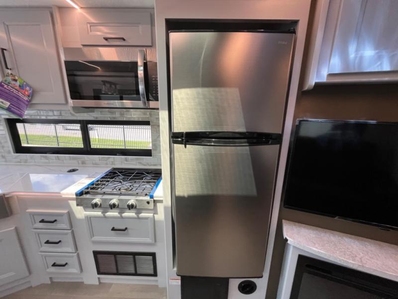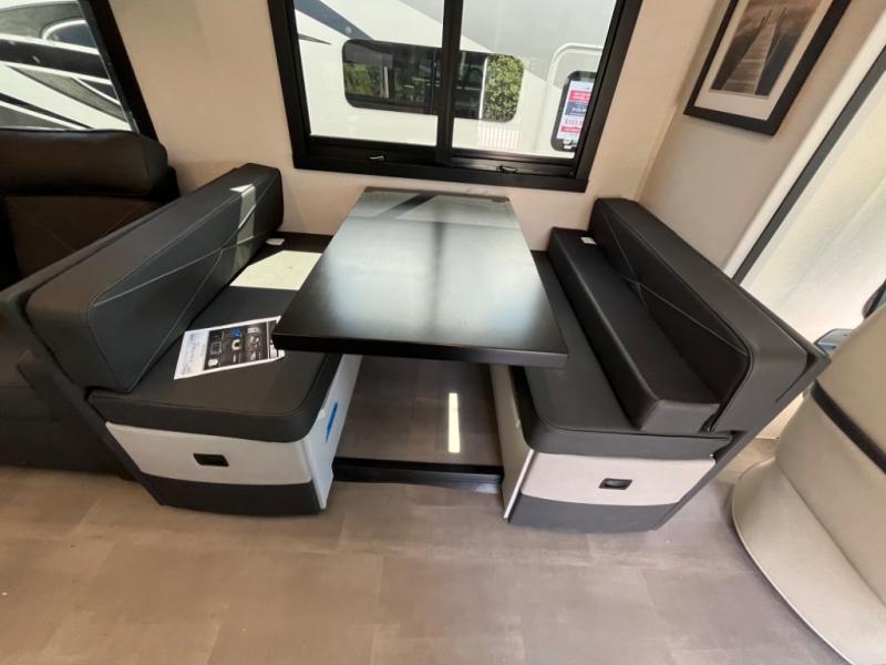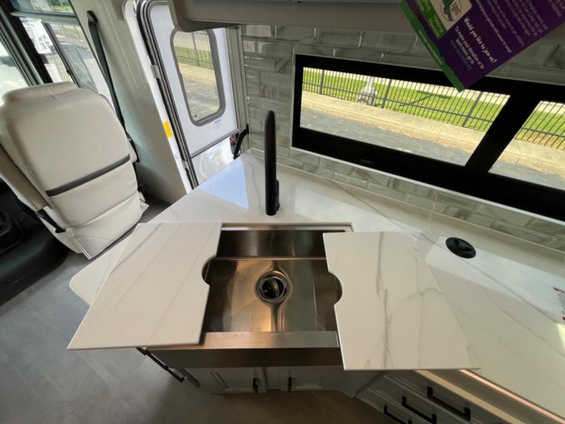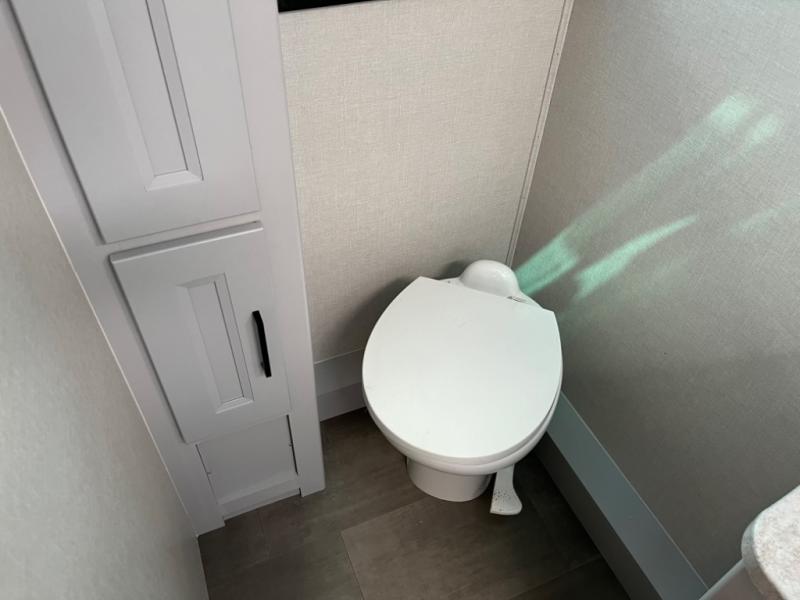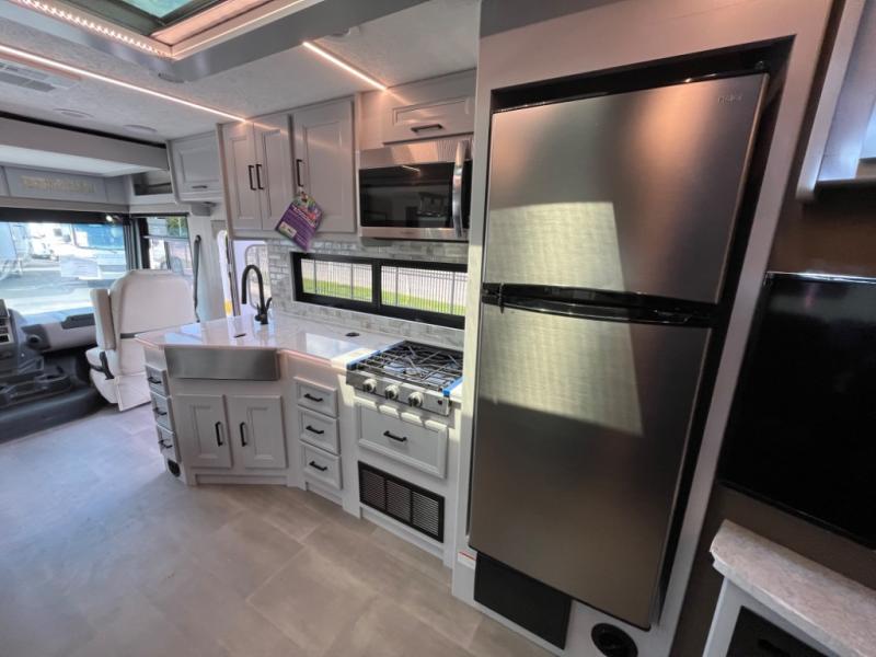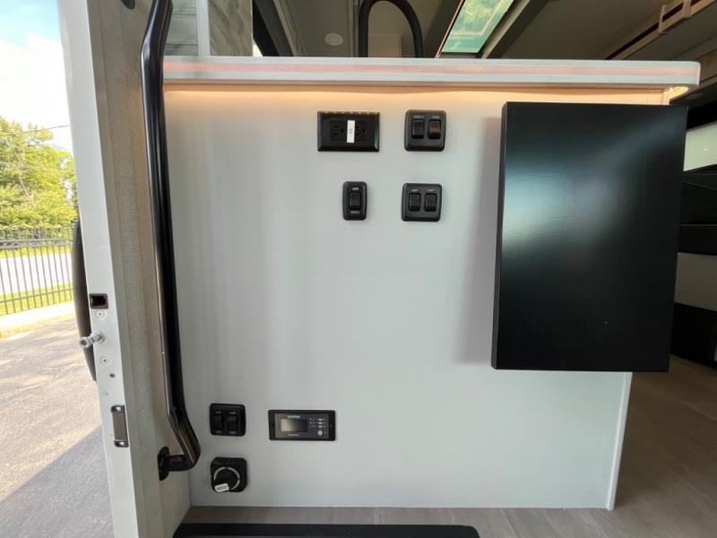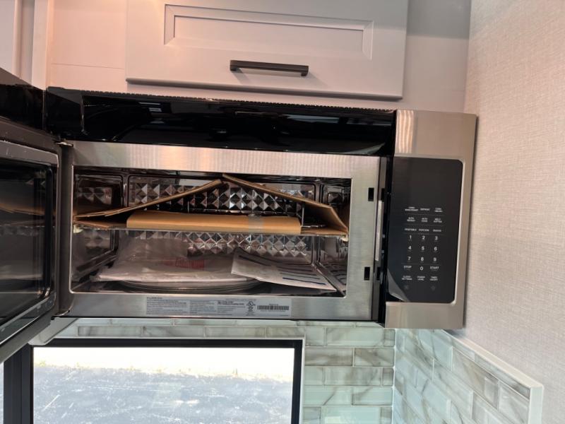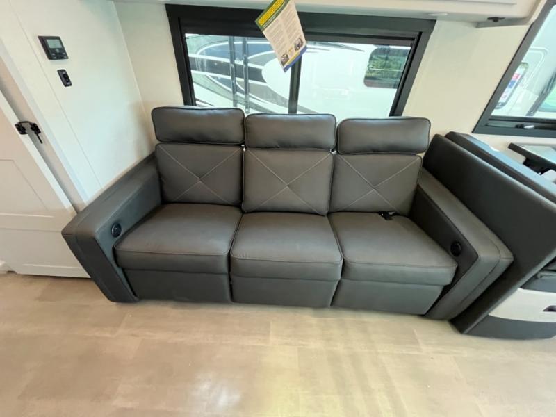 It's a clean decision to take this motorhome on your next vacation with a bath and a half! The full rear bathroom has a 38" x 30" shower and creates a master suite with the entrance going into the private bedroom which features a 70" x 74" king bed slide with CPAP station above it, a wardrobe, and a 32" LED TV with storage space. Just outside the bedroom is a prepped area to add an optional washer and dryer and a versatile space that can be transformed into bunks, an office, or a wardrobe area instead. The half bathroom is conveniently located close to the living/kitchen area for easy access for everyone. There is an 86" sofa with bed for extra sleeping space, but if you don't need the extra sleeping area then you can switch it out for the optional power theater seating. A 42" x 72" booth dinette could also transform into a sleeping space and the 47" x 81" drop down bunk over cab can be used for sleeping or storage!