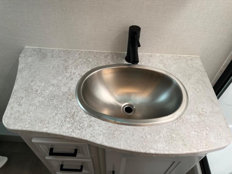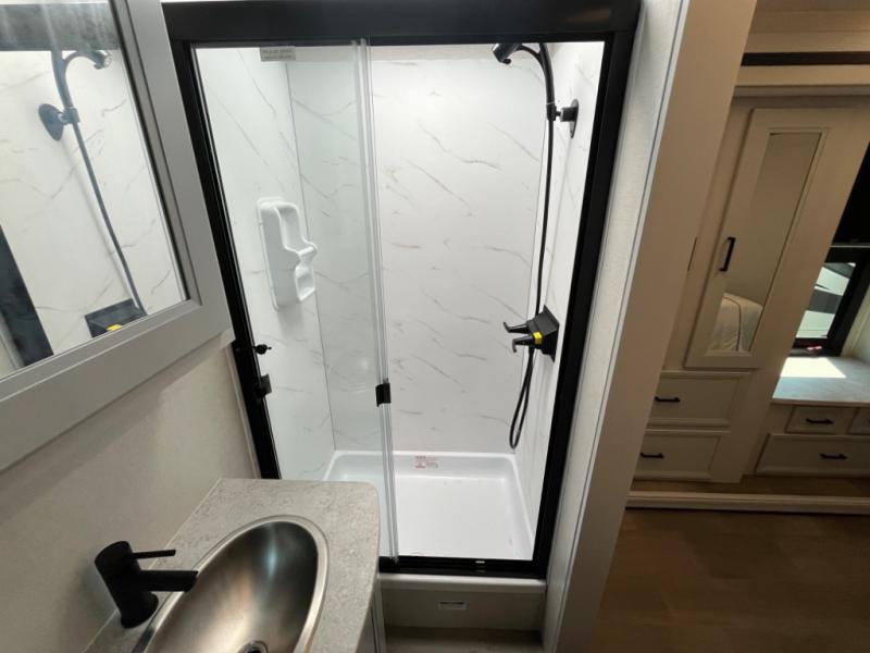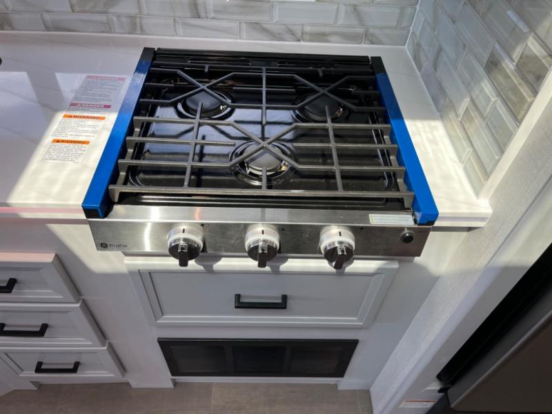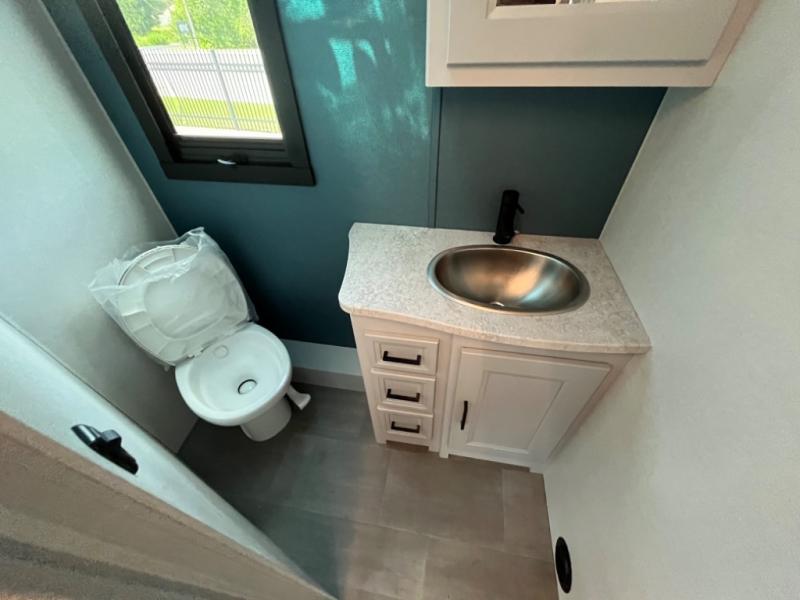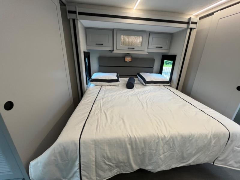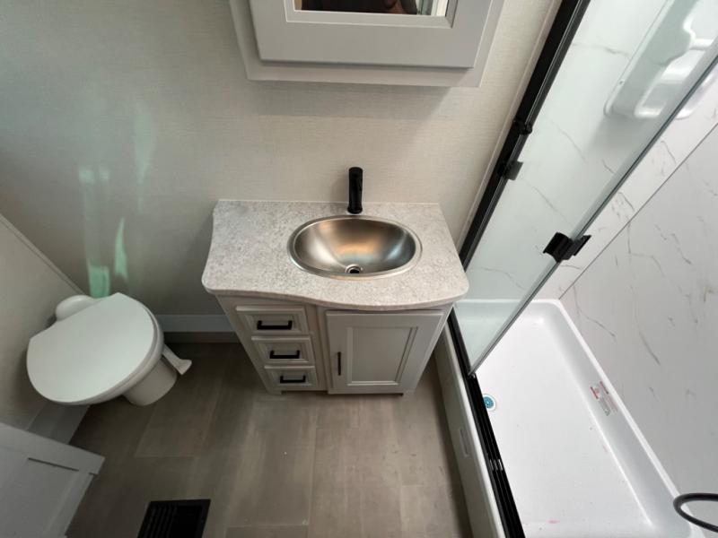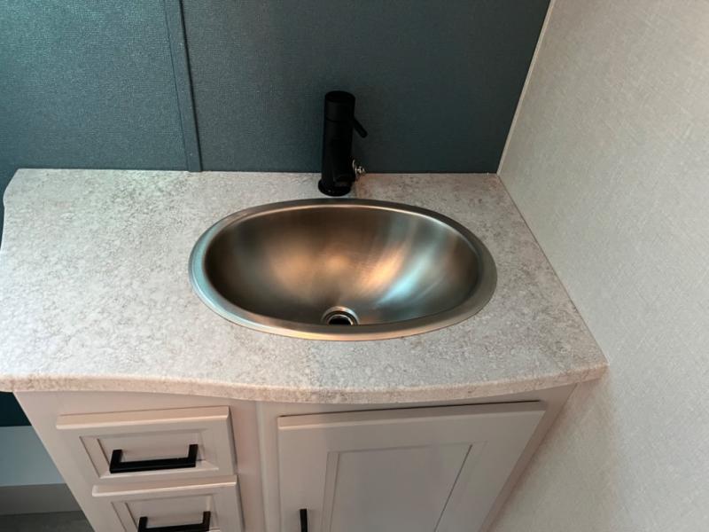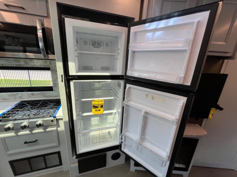 It's a clean decision to take this motorhome on your next vacation with a bath and a half! The full rear bathroom has a 38" x 30" shower and creates a master suite with the entrance going into the private bedroom which features a 70" x 74" king bed slide with CPAP station above it, a wardrobe, and a 32" LED TV with storage space. Just outside the bedroom is a prepped area to add an optional washer and dryer and a versatile space that can be transformed into bunks, an office, or a wardrobe area instead. The half bathroom is conveniently located close to the living/kitchen area for easy access for everyone. There is an 86" sofa with bed for extra sleeping space, but if you don't need the extra sleeping area then you can switch it out for the optional power theater seating. A 42" x 72" booth dinette could also transform into a sleeping space and the 47" x 81" drop down bunk over cab can be used for sleeping or storage!