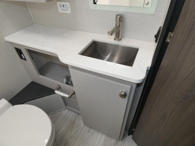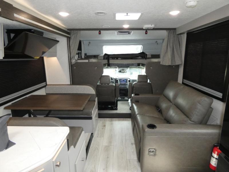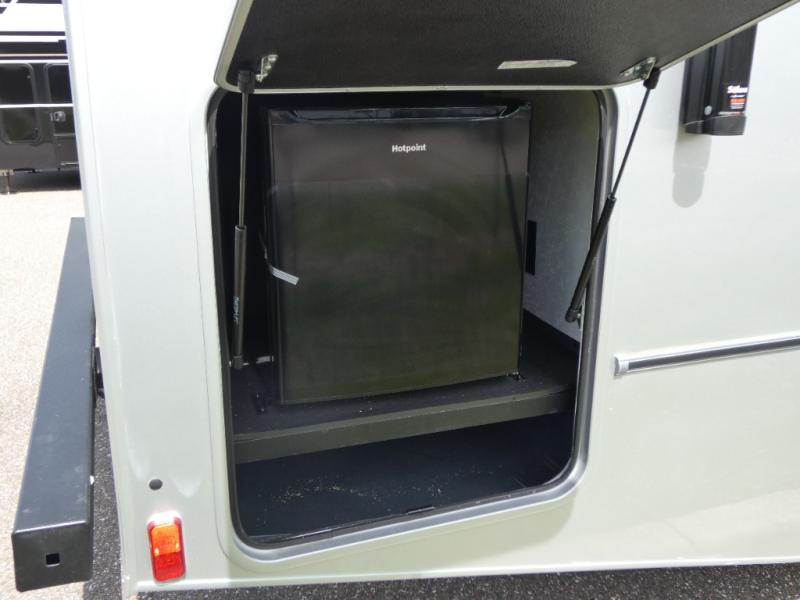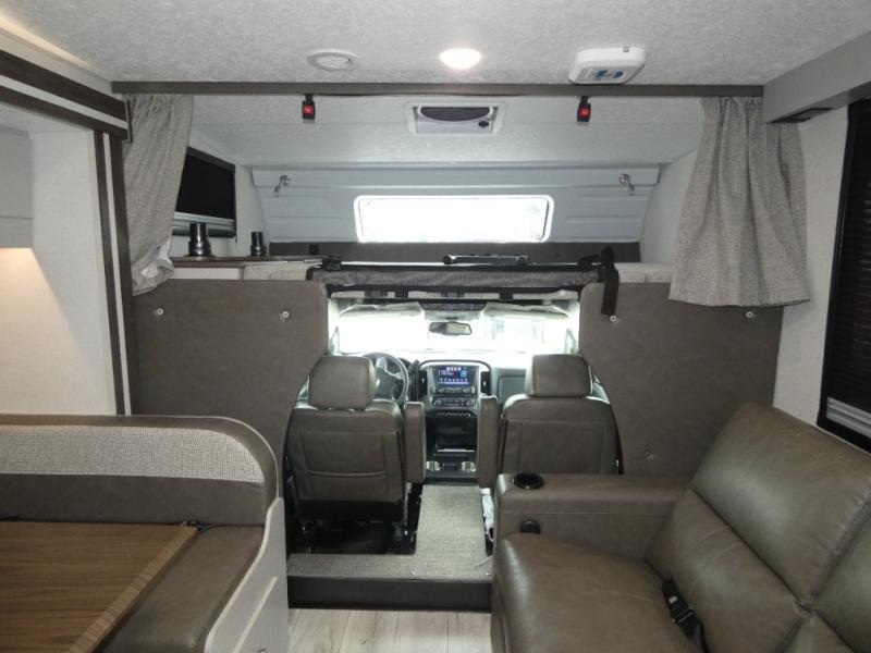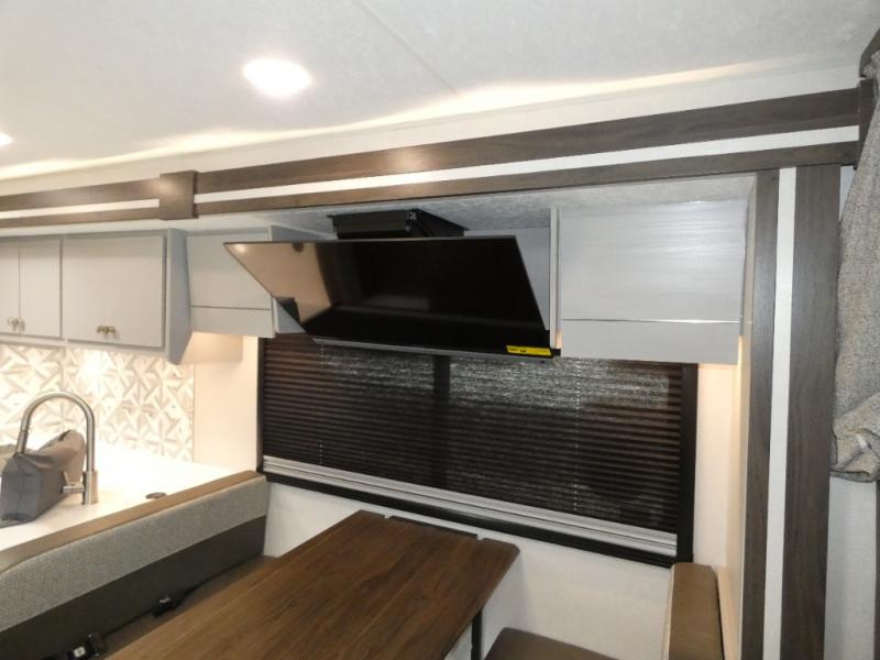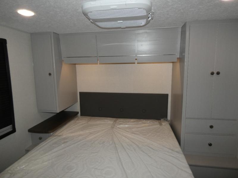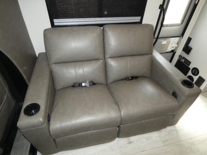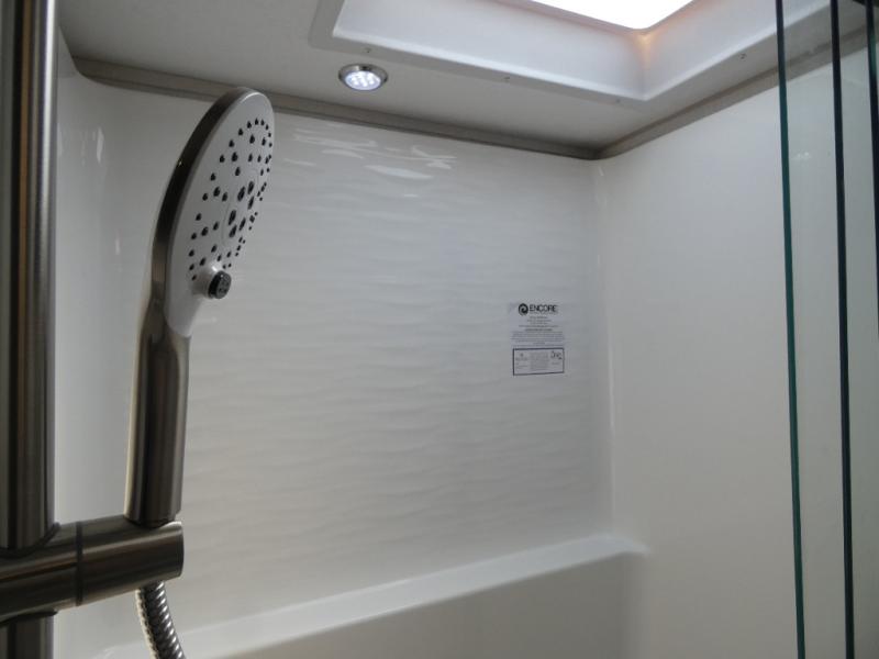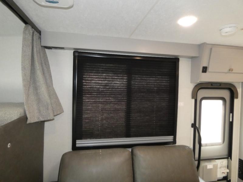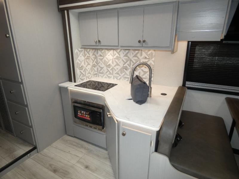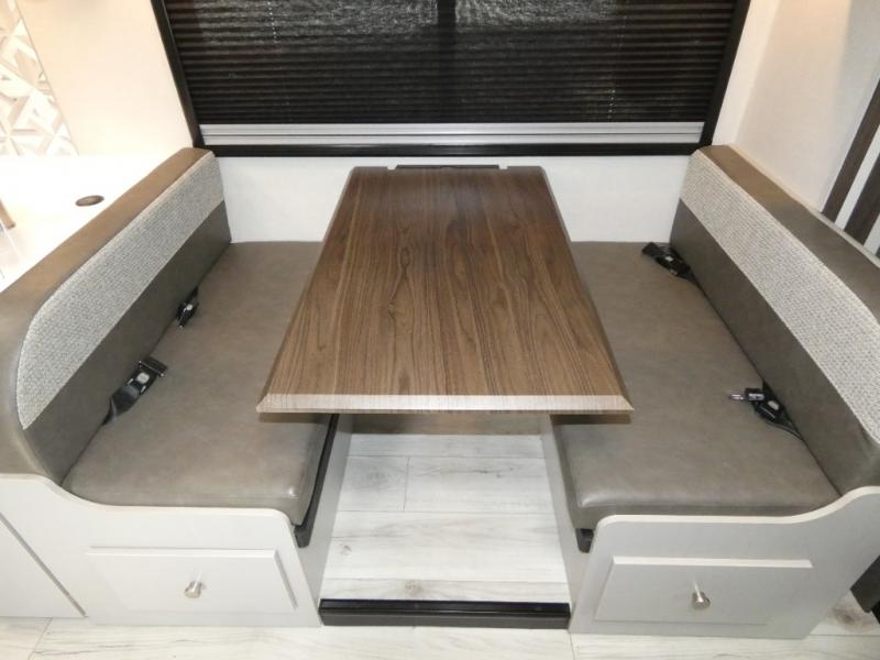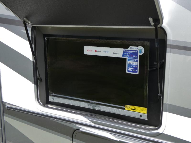 Pack your bags and head across the state in this durable coach. You can sleep five to six each night between the queen bed in the rear bedroom, the cab-over bunk, plus the booth dinette that will convert to sleeping space. The power recliners are sure to bring comfort after a day of traveling, or you can head outdoors to enjoy the outside TV and exterior grill table. When you get hungry, you can make lunch on the induction cooktop or in the convection microwave, and there is a 10 cu. ft. 12V double door refrigerator to keep your cold items fresh. A full bath is ready for you when you want to freshen up, and you'll find a wardrobe right across from the bath to keep clothes and linens ready to use. And the washer and dryer combo prep gives you the option to add these appliances if you choose!