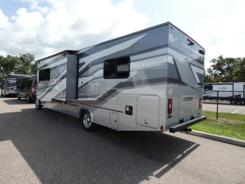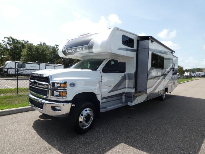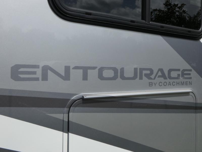 The Entourage is Coachmen's first super C diesel motorhome and it is packed with upscale appointments and solid construction so you can enjoy the RV lifestyle for years to come. This coach features a 4x4 diesel chassis (either a Chevy Silverado 5500 with a V8 6.6L diesel engine, or International CV chassis, depending on the model you choose), plus 50 amp service and a 2,000 watt inverter for all your power needs. The mandatory Icon Package includes a porcelain macerator toilet, auto generator start with dual batteries, 50 amp service, a tankless water heater, and more!