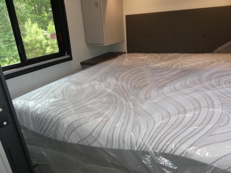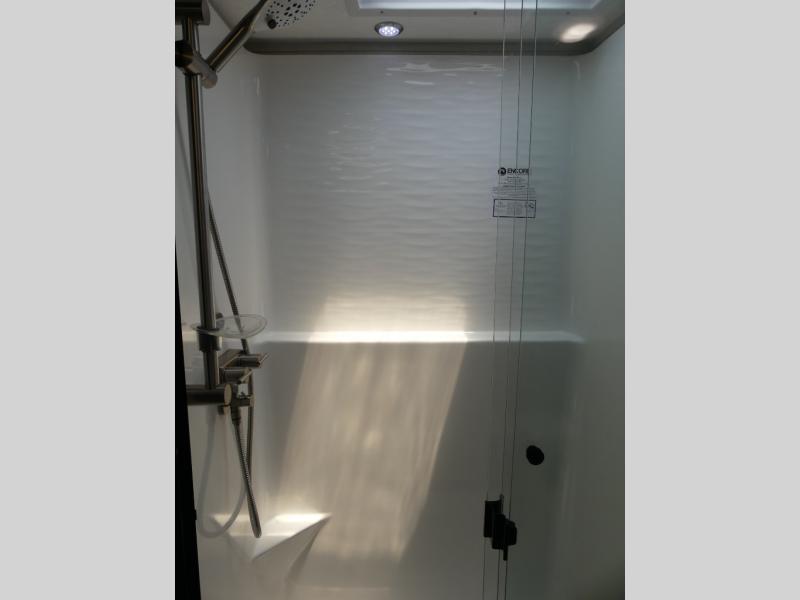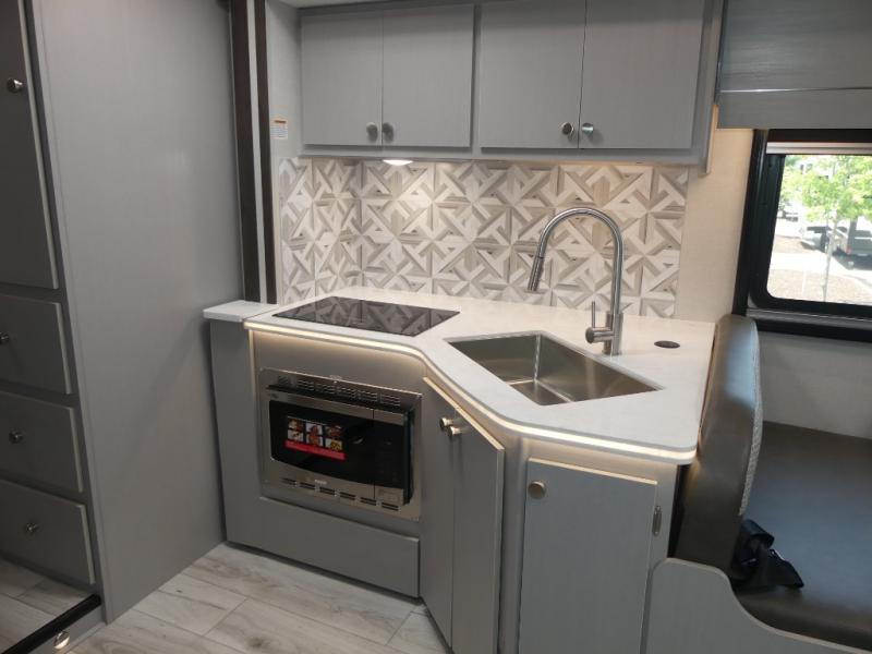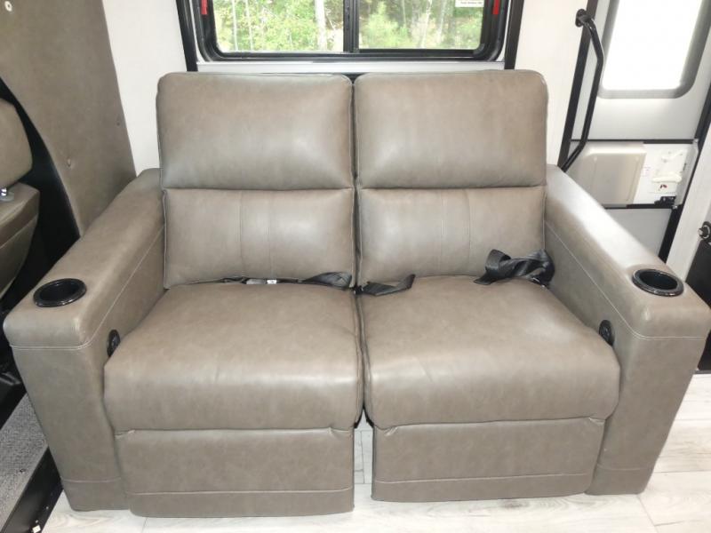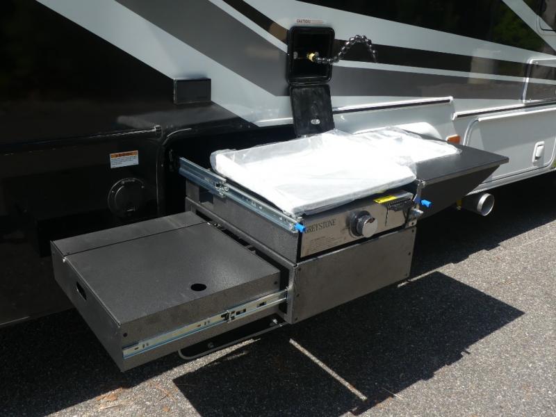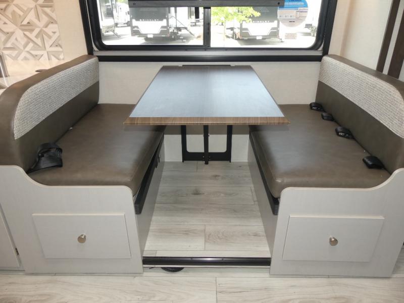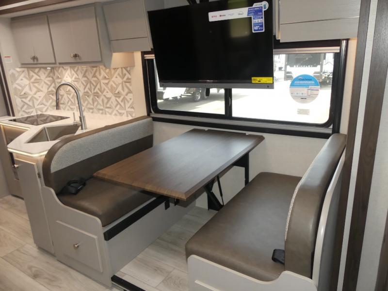Pack your bags and head across the state in this durable coach. You can sleep five to six each night between the queen bed in the rear bedroom, the cab-over bunk, plus the booth dinette that will convert to sleeping space. The power recliners are sure to bring comfort after a day of traveling, or you can head outdoors to enjoy the outside TV and exterior grill table. When you get hungry, you can make lunch on the induction cooktop or in the convection microwave, and there is a 10 cu. ft. 12V double door refrigerator to keep your cold items fresh. A full bath is ready for you when you want to freshen up, and you'll find a wardrobe right across from the bath to keep clothes and linens ready to use. And the washer and dryer combo prep gives you the option to add these appliances if you choose!