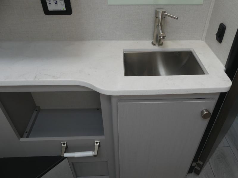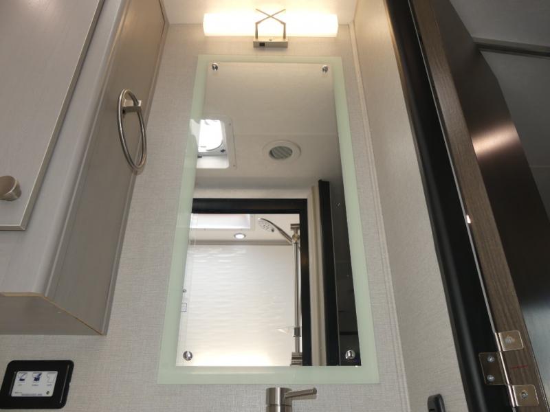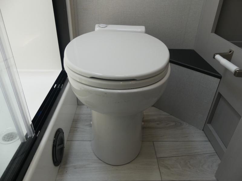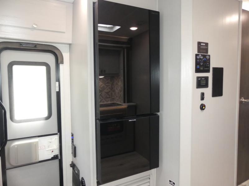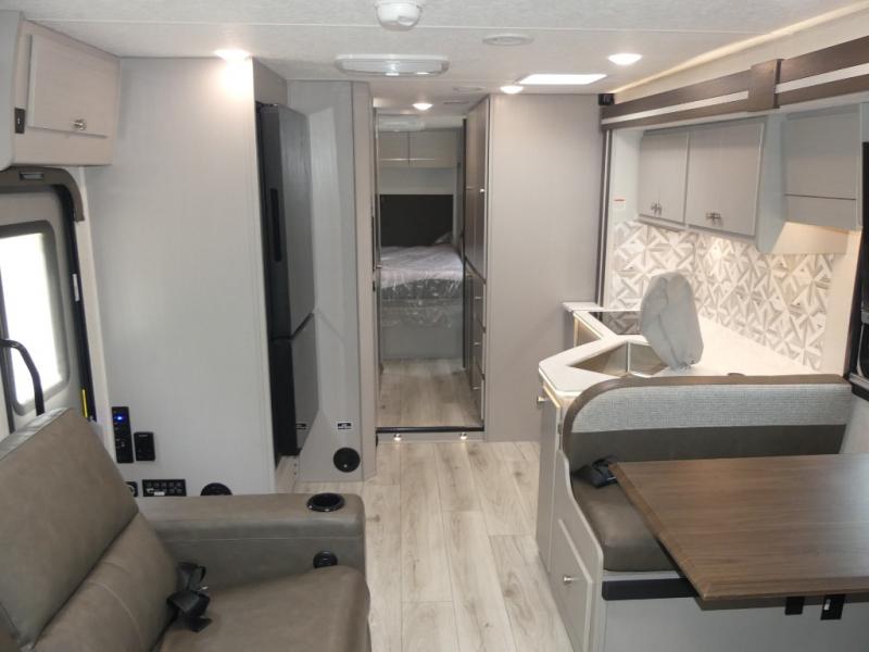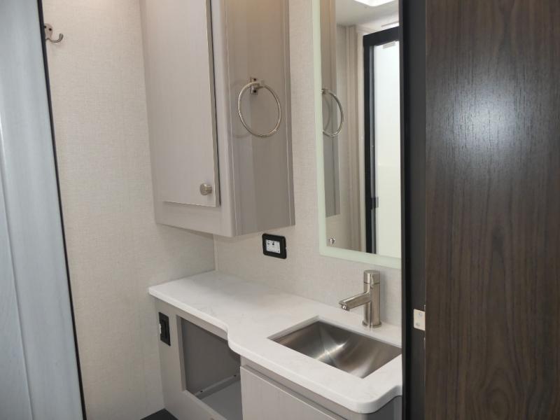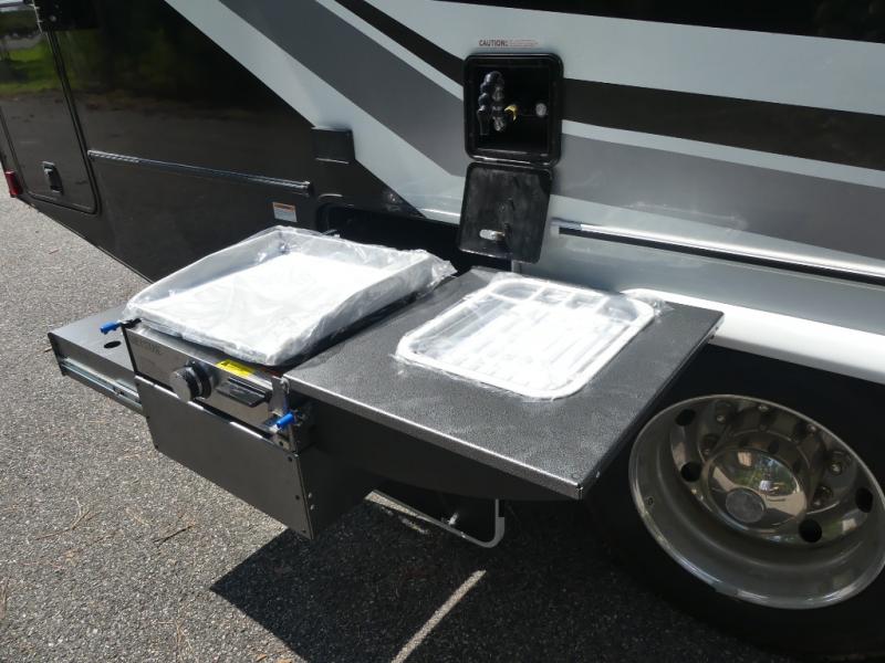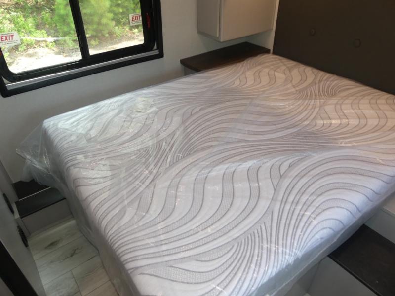 Pack your bags and head across the state in this durable coach. You can sleep five to six each night between the queen bed in the rear bedroom, the cab-over bunk, plus the booth dinette that will convert to sleeping space. The power recliners are sure to bring comfort after a day of traveling, or you can head outdoors to enjoy the outside TV and exterior grill table. When you get hungry, you can make lunch on the induction cooktop or in the convection microwave, and there is a 10 cu. ft. 12V double door refrigerator to keep your cold items fresh. A full bath is ready for you when you want to freshen up, and you'll find a wardrobe right across from the bath to keep clothes and linens ready to use. And the washer and dryer combo prep gives you the option to add these appliances if you choose!