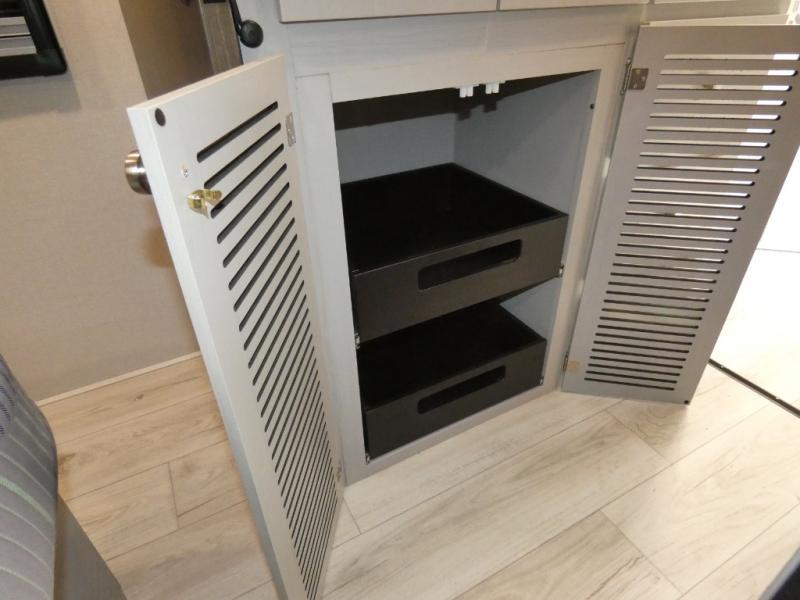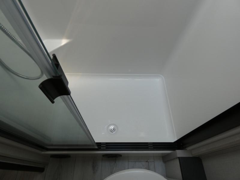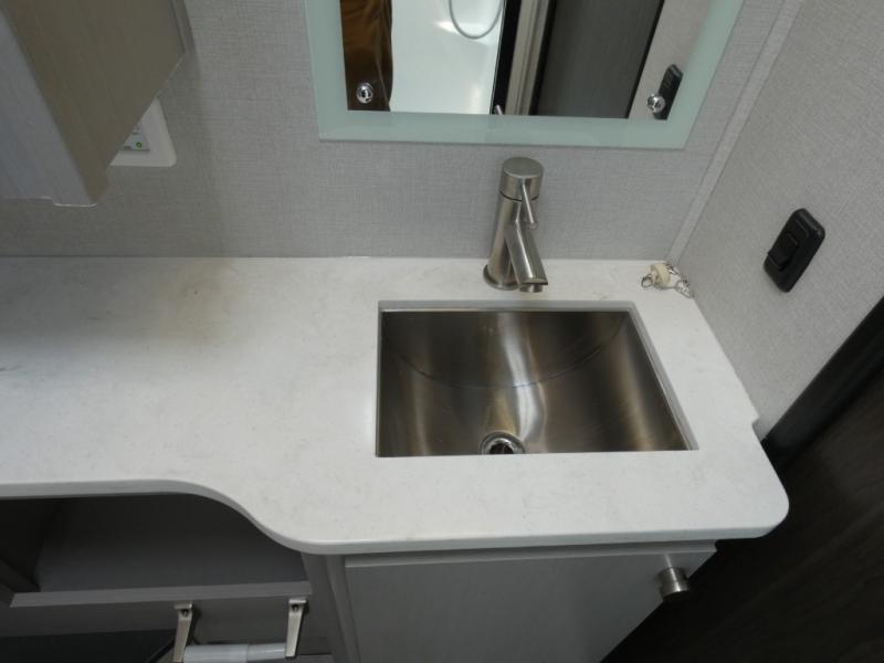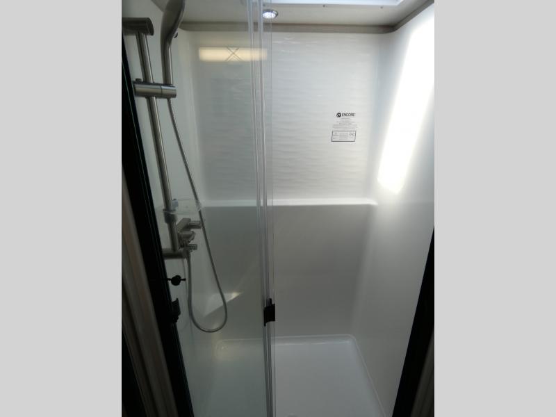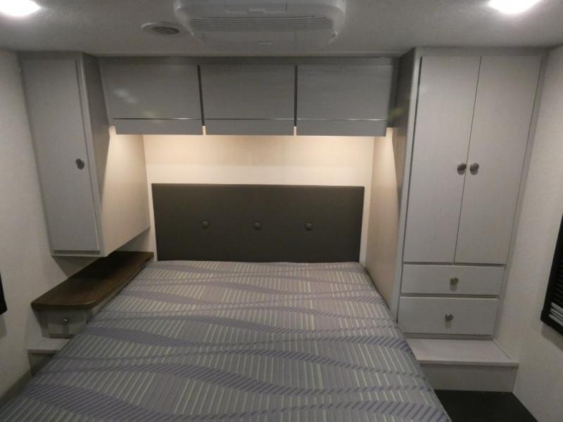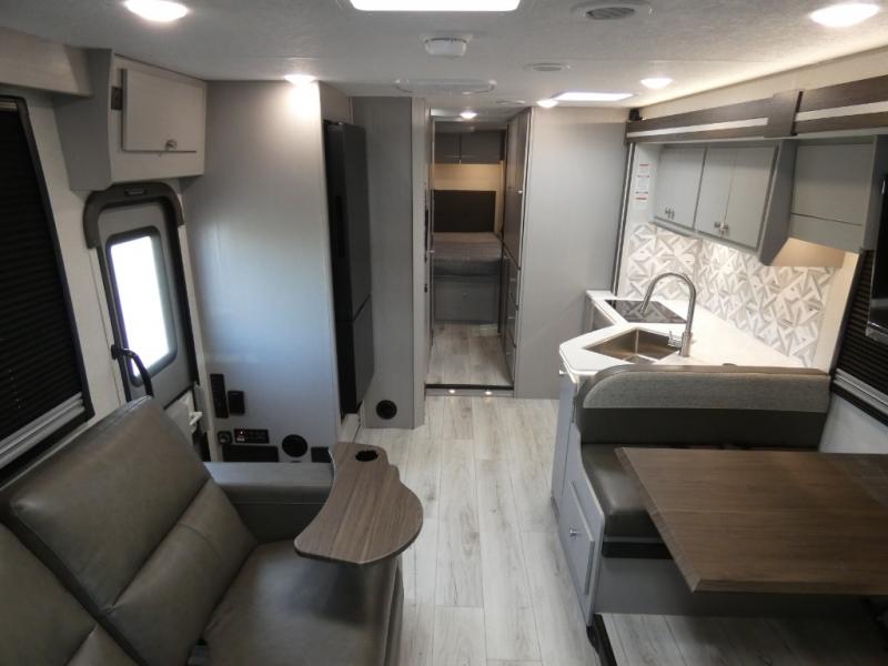 Pack your bags and head across the state in this durable coach. You can sleep five to six each night between the queen bed in the rear bedroom, the cab-over bunk, plus the booth dinette that will convert to sleeping space. The power recliners are sure to bring comfort after a day of traveling, or you can head outdoors to enjoy the outside TV and exterior grill table. When you get hungry, you can make lunch on the induction cooktop or in the convection microwave, and there is a 10 cu. ft. 12V double door refrigerator to keep your cold items fresh. A full bath is ready for you when you want to freshen up, and you'll find a wardrobe right across from the bath to keep clothes and linens ready to use. And the washer and dryer combo prep gives you the option to add these appliances if you choose!