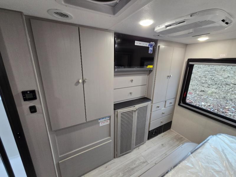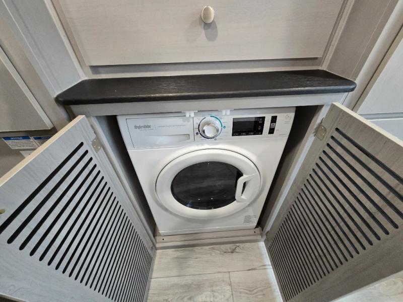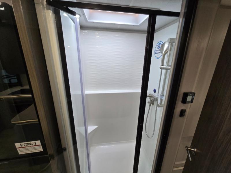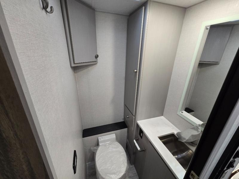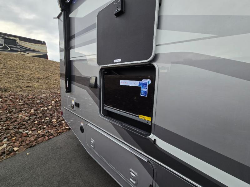 This coach will meet your every need, whether you're a weekend warrior or full-time RVer. Once you arrive at the campground, make a quick lunch on the cooktop or in the convection microwave, and the countertop extension will provide more space to prep fresh veggies. There is a refrigerator and a pantry to store food for the week, plus overhead cabinets for spices and dishes. After lunch is cleaned up, you can relax around the J-lounge with a pedestal table and an extension to sit more people. There is also a slide with theater seating for more seating space This coach features a split-style bath with an independent shower and a private toilet and sink right across the hall so two people can freshen up at once. The rear private bedroom includes a power inclining king bed, dual wardrobes, a TV, plus washer and dryer prep to make wash day easier than ever.