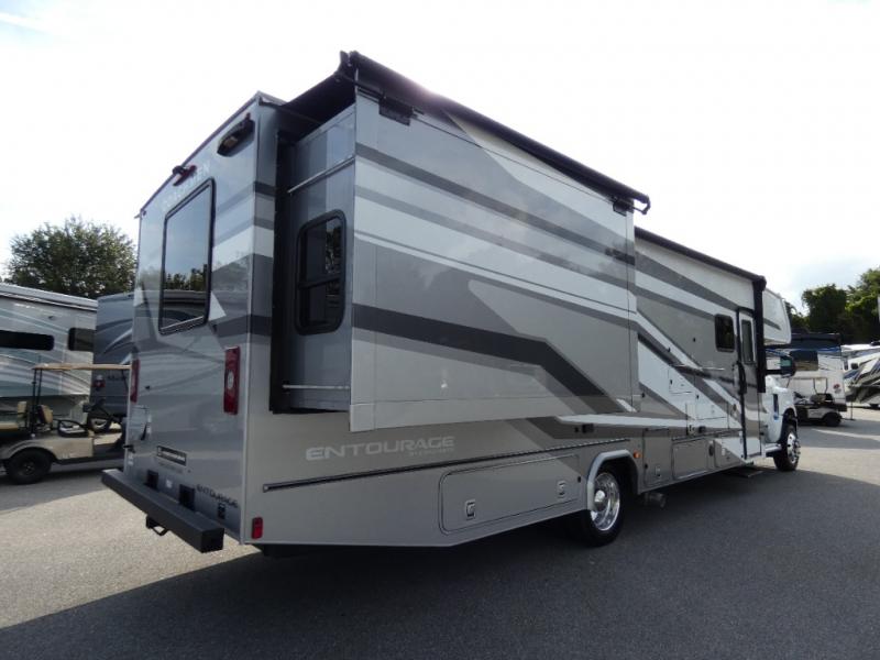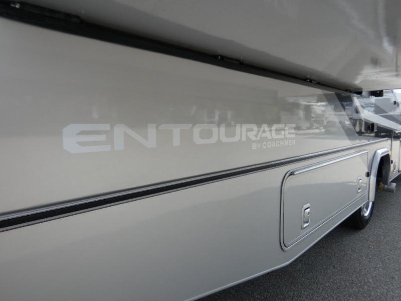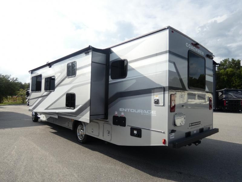 The Entourage is Coachmen's first super C diesel motorhome and it is packed with upscale appointments and solid construction so you can enjoy the RV lifestyle for years to come. This coach features a 4x4 diesel chassis (either a Chevy Silverado 5500 with a V8 6.6L diesel engine, or International CV chassis, depending on the model you choose), plus 50 amp service and a 2,000 watt invertor for all your power needs. The mandatory Icon Package includes a porcelain macerator toilet, auto generator start with dual batteries, 50 amp service, a tankless water heater, and more!