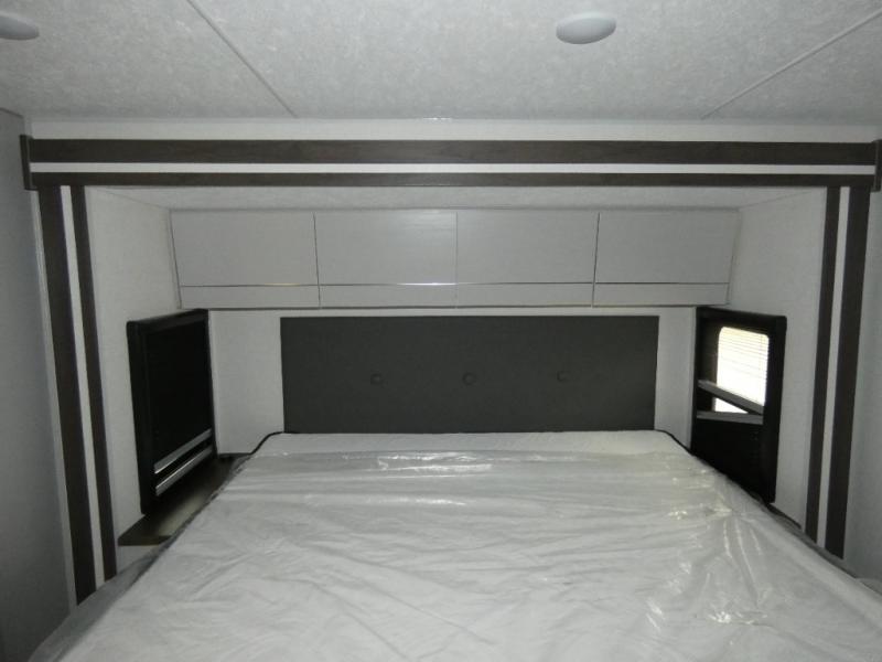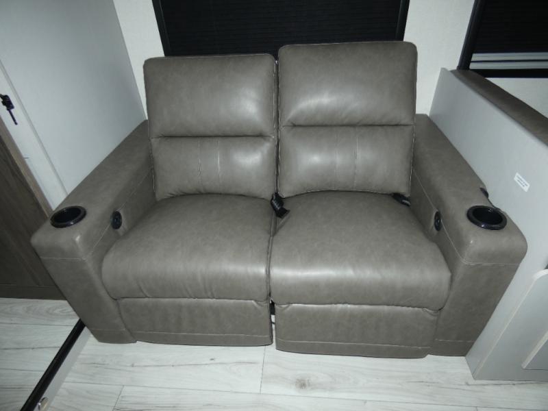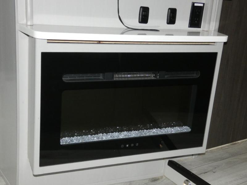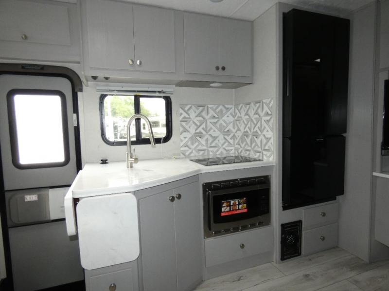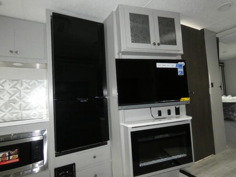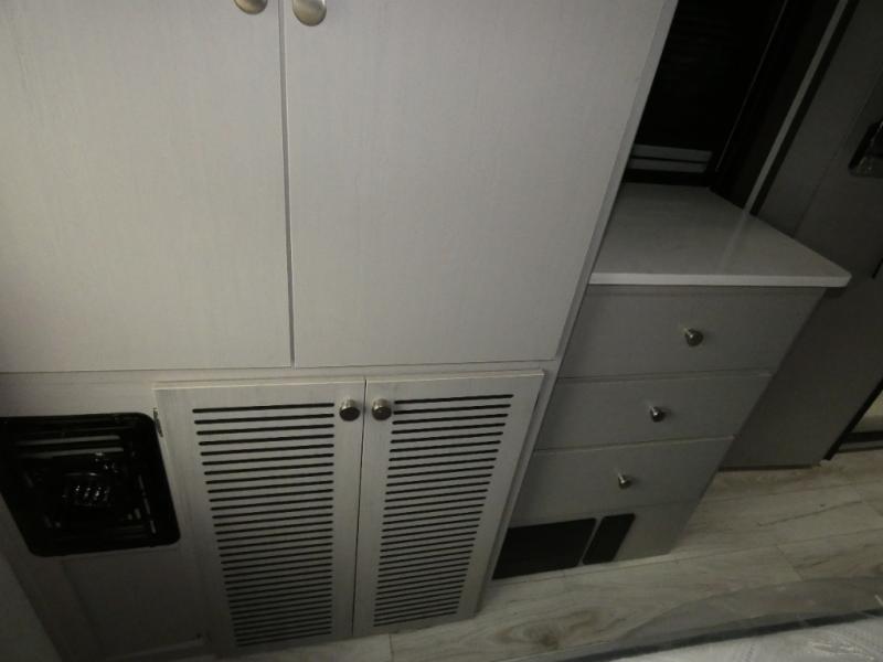 If you're looking for a coach with more sleeping space so your whole crew can join, take a look at this Entourage! You will have your own rear private bedroom with a power inclining king bed slide out, a dresser, plus wardrobe that is washer and dryer ready. Your guests can sleep on the sofa, booth dinette, set of bunk beds, or cab-over bunk, and the full bath is close by for easy use. The kitchen is fully equipped with an induction cooktop, a residential convection microwave, and a 10 cu. ft. 12V double door refrigerator for food storage. You will enjoy your time outdoors as well since there is an outside entertainment center and an outside kitchen!