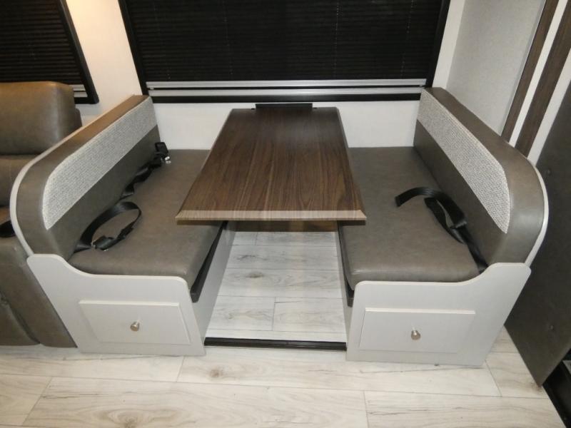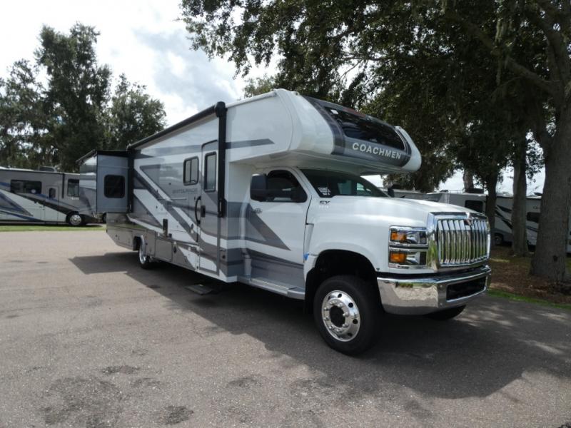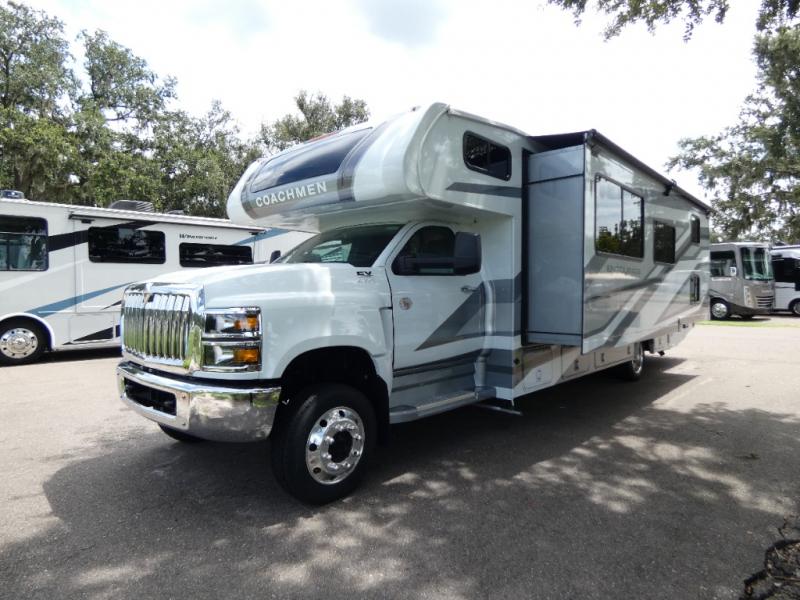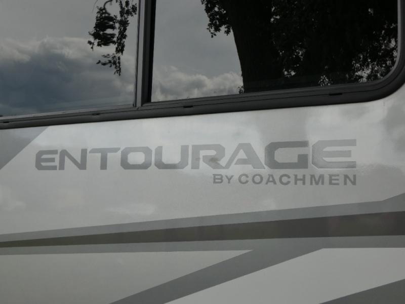 The Entourage is Coachmen's first super C diesel motorhome and it is packed with upscale appointments and solid construction so you can enjoy the RV lifestyle for years to come. This coach features a 4x4 diesel chassis (either a Chevy Silverado 5500 with a V8 6.6L diesel engine, or International CV chassis, depending on the model you choose), plus 50 amp service and a 2,000 watt invertor for all your power needs. The mandatory Icon Package includes a porcelain macerator toilet, auto generator start with dual batteries, 50 amp service, a tankless water heater, and more!
