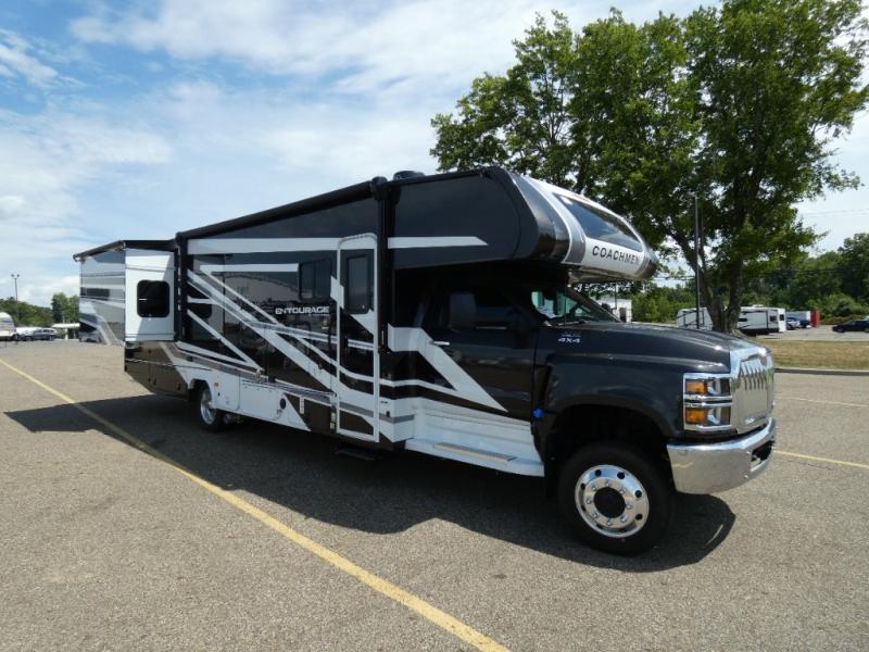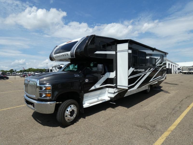 The Entourage is Coachmen's first super C diesel motorhome and it is packed with upscale appointments and solid construction so you can enjoy the RV lifestyle for years to come. The mandatory Icon Package includes a porcelain macerator toilet, auto generator start with dual batteries, 50 amp service, a tankless water heater, and more!