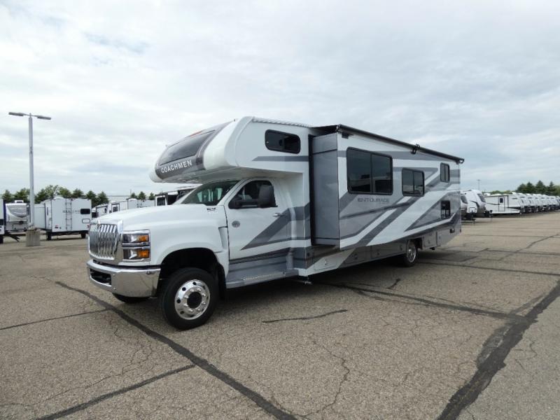 The Entourage is Coachmen's first super C diesel motorhome and it is packed with upscale appointments and solid construction so you can enjoy the RV lifestyle for years to come. This coach features a 4x4 diesel chassis plus 50 amp service and a 2,000 watt invertor for all your power needs. The mandatory Icon Package includes a porcelain macerator toilet, auto generator start with dual batteries, 50 amp service, a tankless water heater, and more!