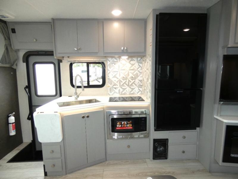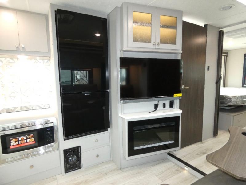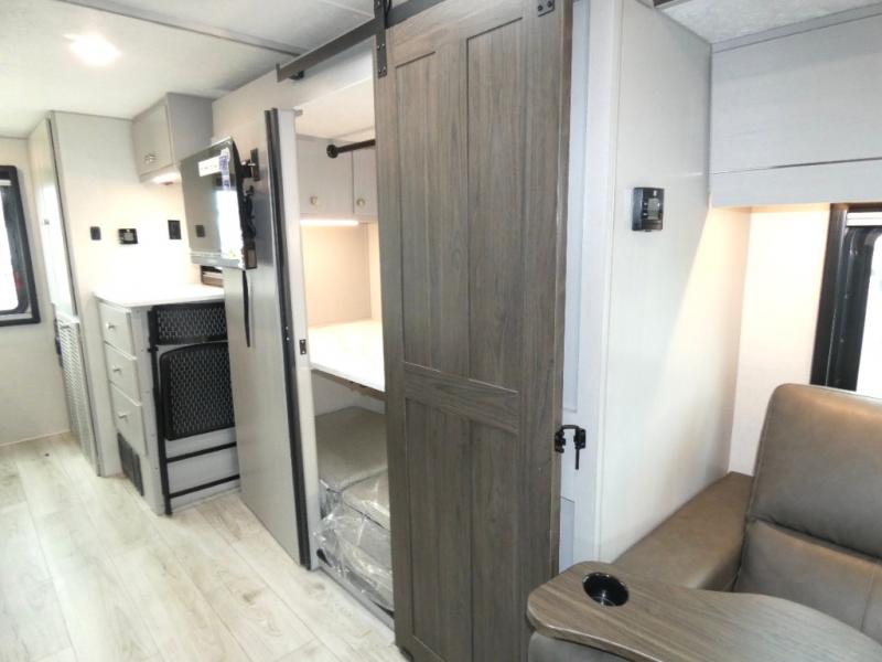 If you're looking for a coach with more sleeping space so your whole crew can join, take a look at this Entourage! You will have your own rear private bedroom with a power inclining king bed slide out, a dresser, plus wardrobe that is washer and dryer ready. Your guests can sleep on the sofa, booth dinette, set of bunk beds, or cab-over bunk, and the full bath is close by for easy use. The kitchen is fully equipped with an induction cooktop, a residential convection microwave, and a 10 cu. ft. 12V double door refrigerator for food storage. You will enjoy your time outdoors as well since there is an outside entertainment center and an outside kitchen!