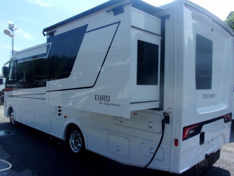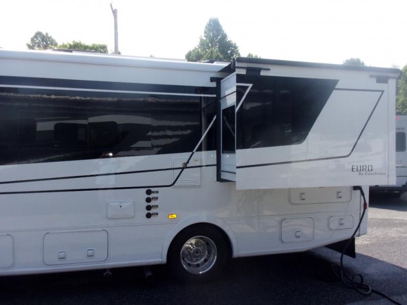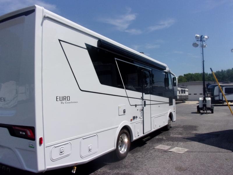 Enjoy the compact and stylish look of a European coach with the Euro Class A gas motorhome by Coachmen RV! There is a crowned, laminated fiberglass roof, a fiberglass front cap, plus high gloss Nobel Select Sidewalls with Azdel Superlite composite that will add to the life of your RV. The driver will love having a back up monitor with side view cameras, and the passenger can use the computer workstation to work remotely if needed. There is also traction control, cruise control, plus a tilt and telescoping steering wheel that will make the drive that much easier. An exterior propane hook-up also comes standard, along with radius trunk doors for your gear, and automatic leveling jacks to be set up in no-time. Head inside to find modern features, like the stainless steel appliances, European cabinetry with self-closing drawers, square windows with day/night shades, and the list goes on!