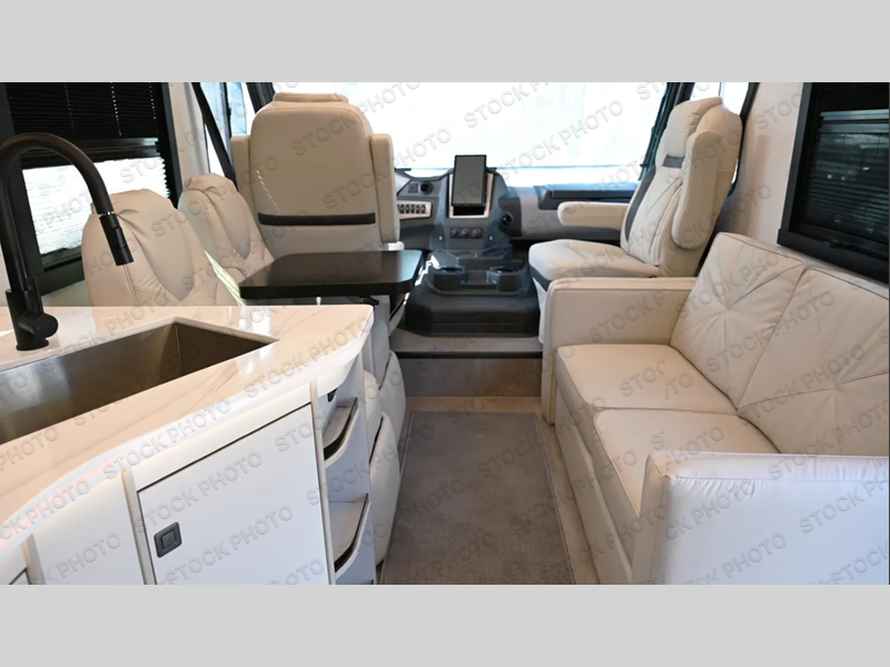 Come see why this coach was voted the Type A Gas Motorhome of the Year for 2024 by RV News and the 2024 Top RV Debut by RV Business! Once you arrive at your destination, the reclining/swivel pilot seats can become a part of the living area where your crew is relaxing on the sofa and two chairs with a table. You'll find an induction cooktop in the kitchen to prepare meals, plus a stainless steel double door refrigerator and a pantry to hold food for the whole week. A king bed slide out in the rear corner bedroom will have you feeling right at home, and there is a bedroom TV to watch movies in bed plus power outlets on both sides of the bed to charge your phone at night. Having a full bath onboard is sure to come in handy, especially with its glass shower door, skylight, and on-demand water heater. This model also includes two closets, one with washer and dryer prep to keep your clothes wrinkle-free plus more storage space throughout for camp gear and necessities!