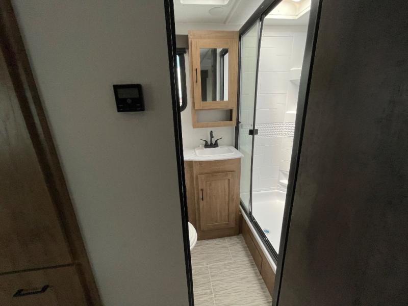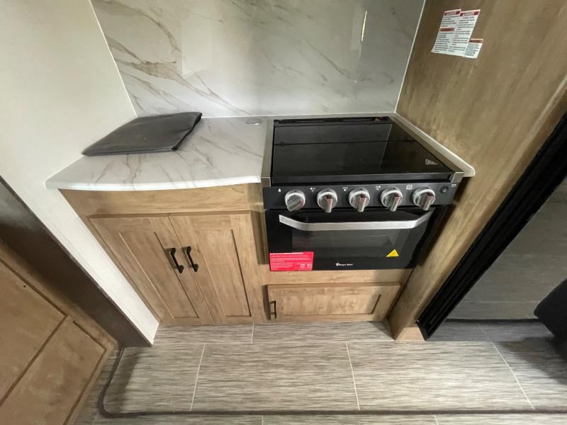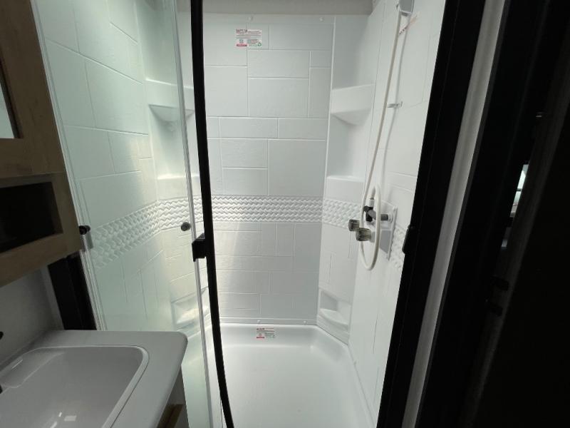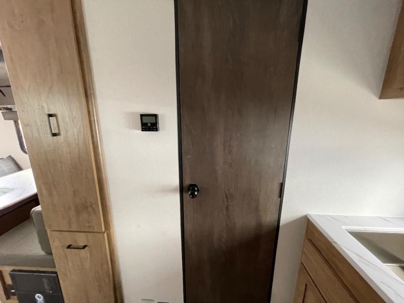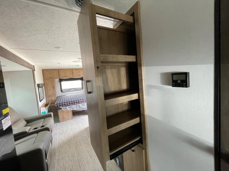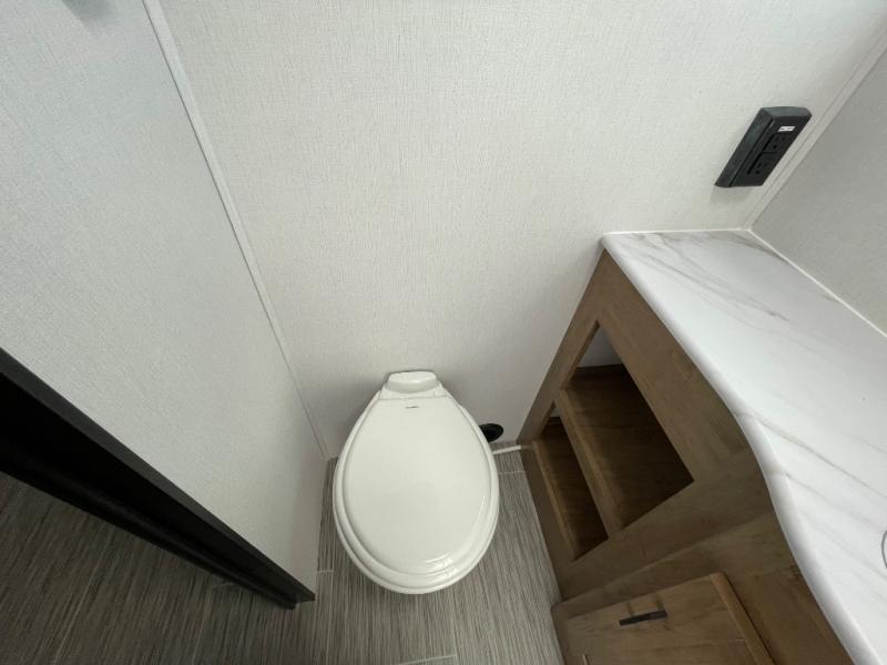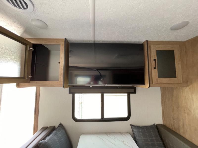 This trailer provides the perfect blend of utility and comfort. You will enjoy your own queen bed up front that includes vaulted under-bed storage for your luggage. A pair of theater seats provides a great spot to watch the flatscreen smart TV, and you can enjoy meals at the U-dinette. The chef will enjoy the well-equipped kitchen which includes a three burner cooktop, microwave, and stainless steel sink. Additional storage can be found in the overhead consoles plus a pantry/wardrobe closet.