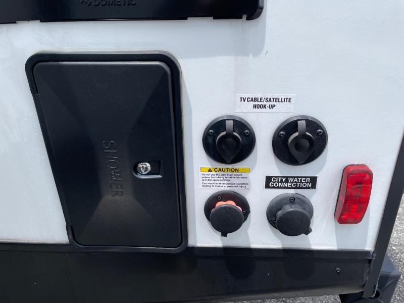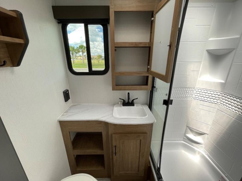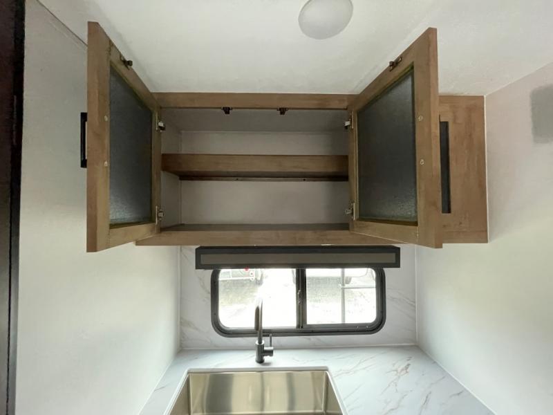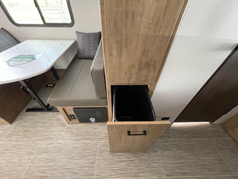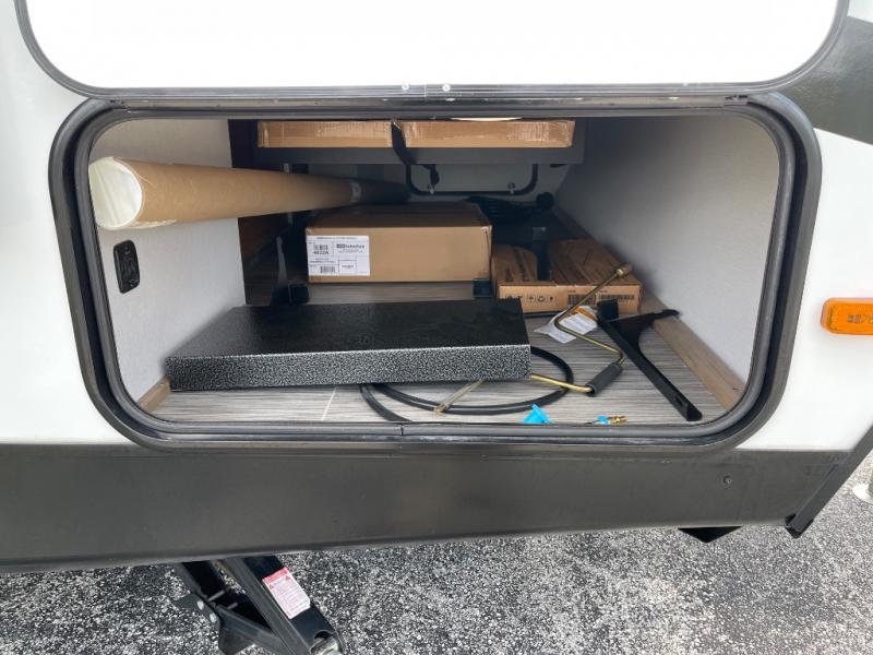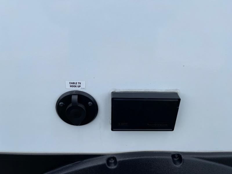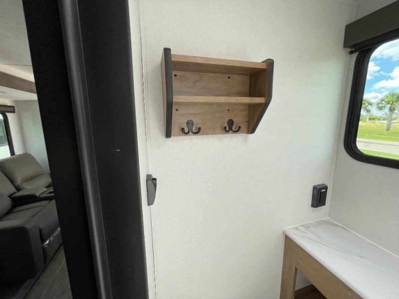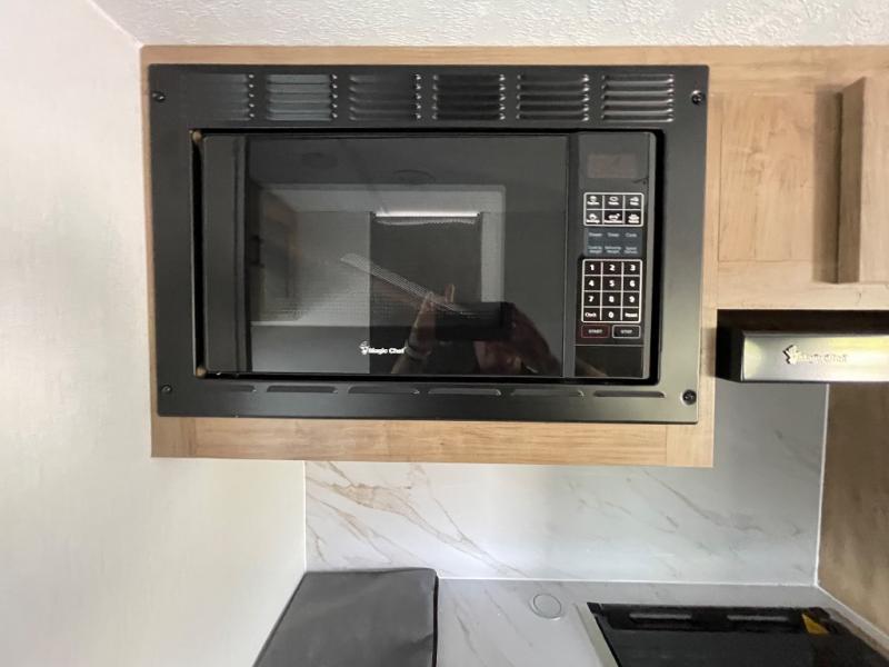 This trailer provides the perfect blend of utility and comfort. You will enjoy your own queen bed up front that includes vaulted under-bed storage for your luggage. A pair of theater seats provides a great spot to watch the flatscreen smart TV, and you can enjoy meals at the U-dinette. The chef will enjoy the well-equipped kitchen which includes a three burner cooktop, microwave, and stainless steel sink. Additional storage can be found in the overhead consoles plus a pantry/wardrobe closet.