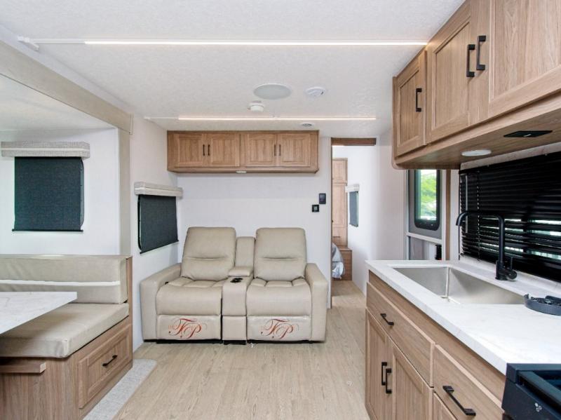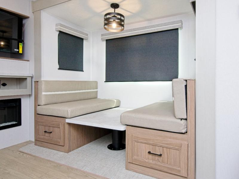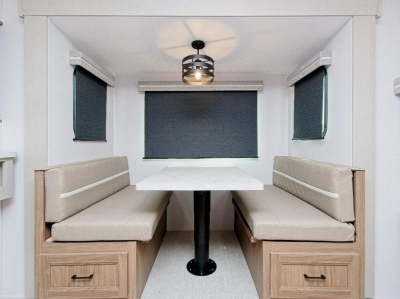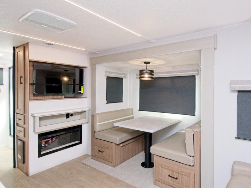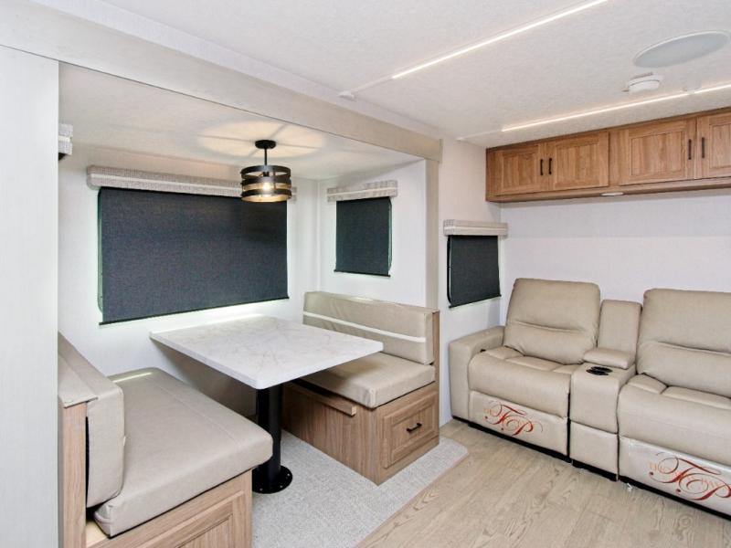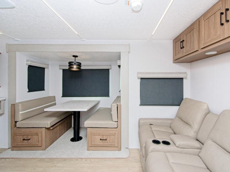 Living Area: Equipped with a slide-out booth dinette and a sofa, both of which can convert into additional sleeping spaces.