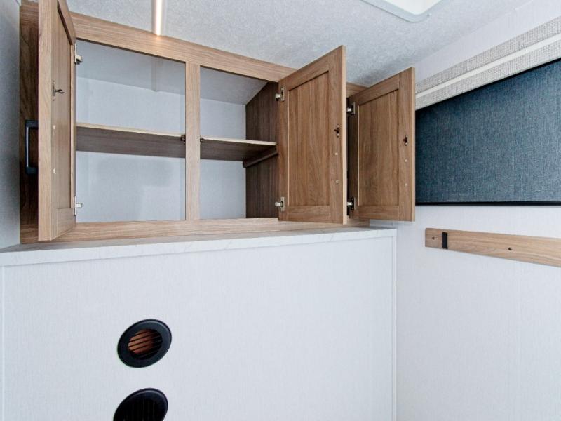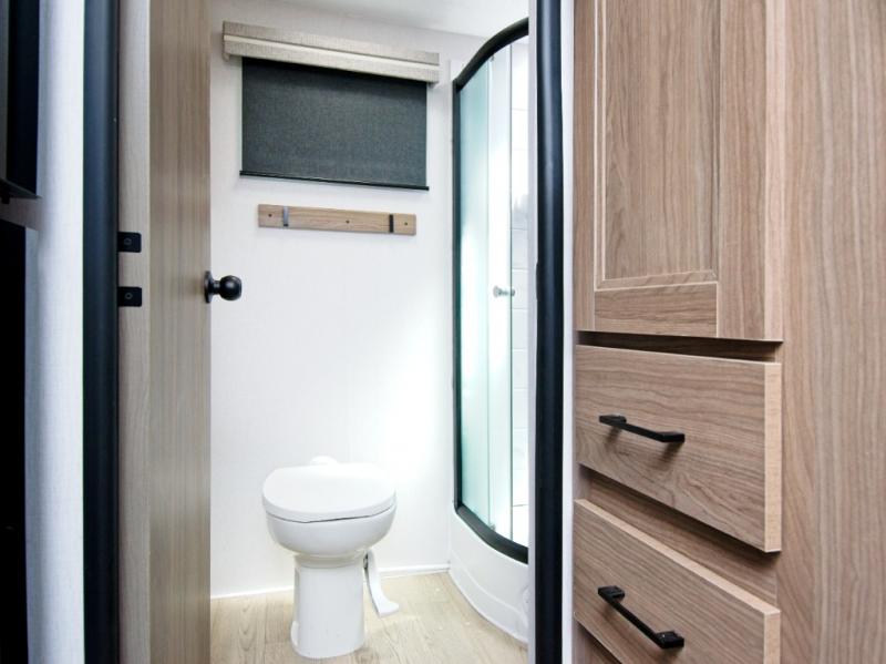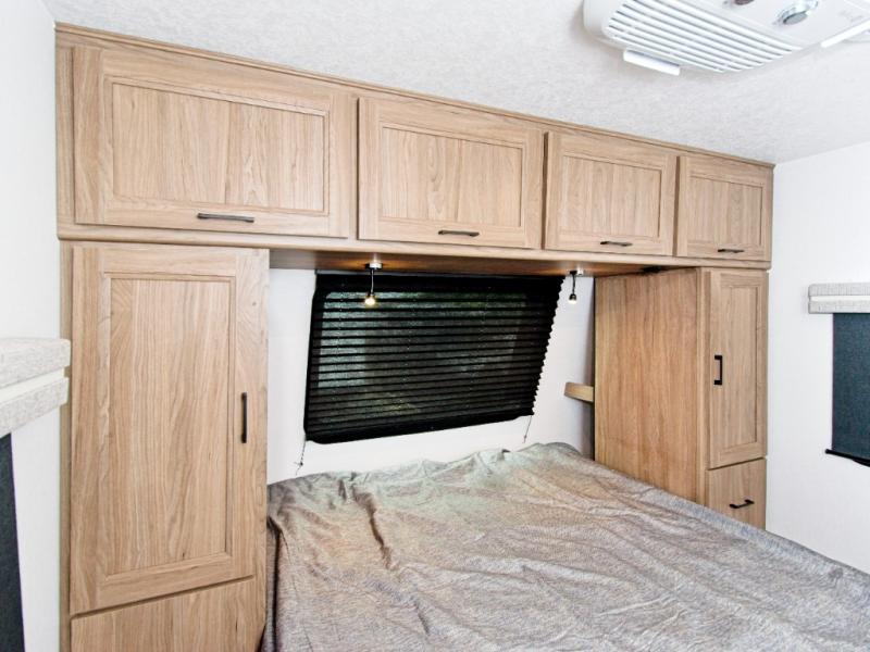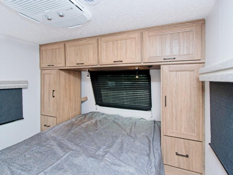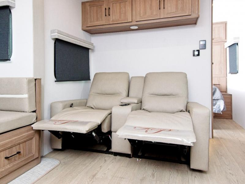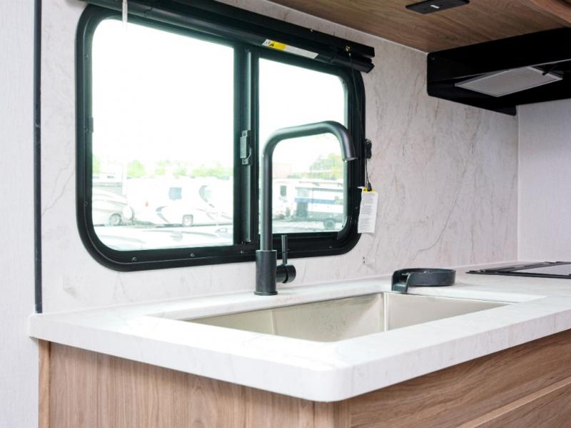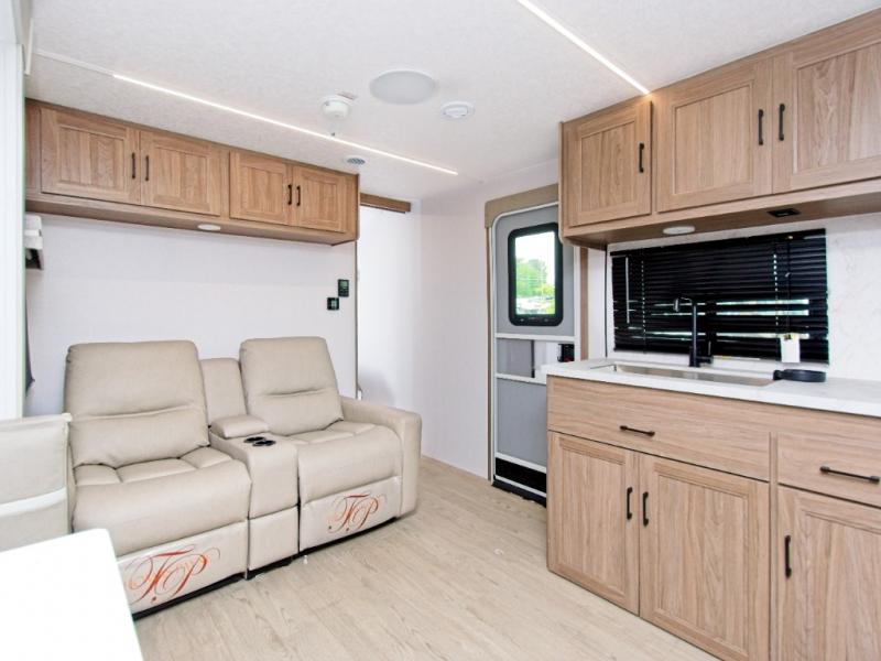 Living Area: Equipped with a slide-out booth dinette and a sofa, both of which can convert into additional sleeping spaces.