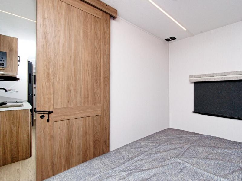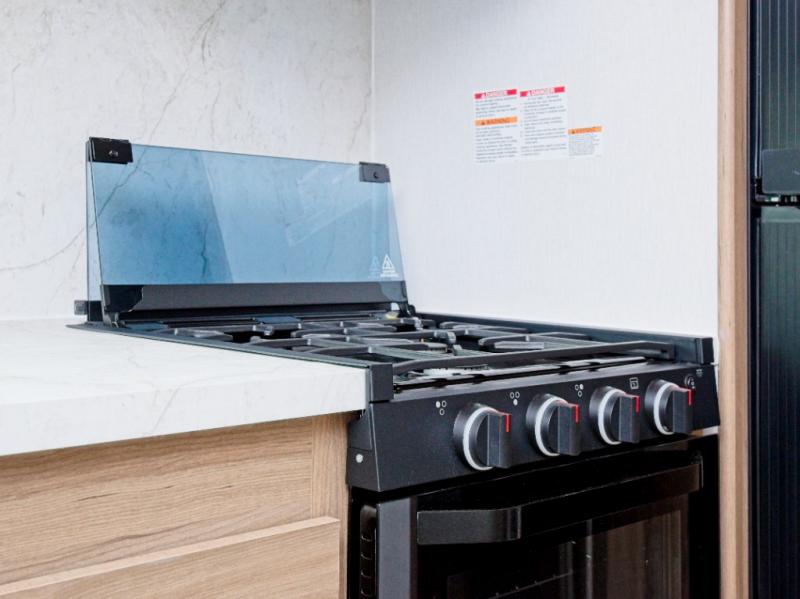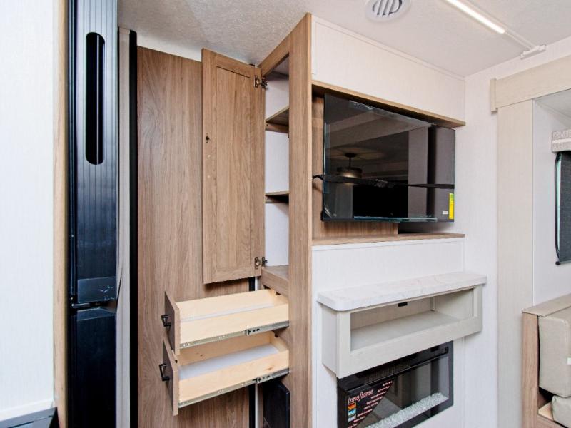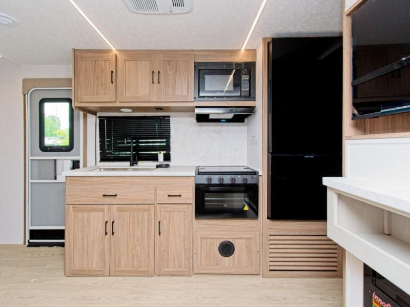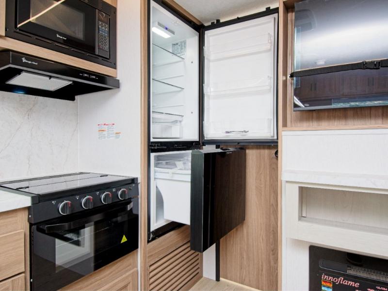 Outdoor Features: Includes a full camp kitchen with a refrigerator and a pull-out grill, enhancing the outdoor cooking experience.