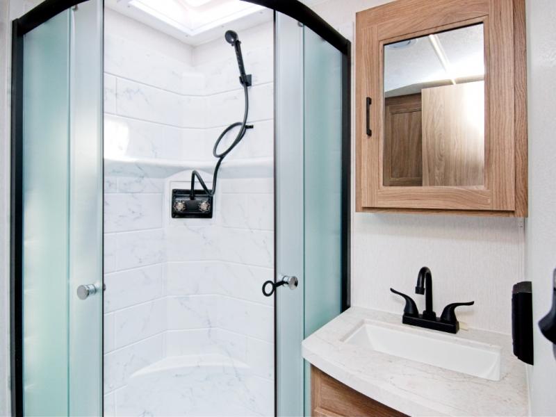 Rear Bathroom: Includes a spacious rear bathroom with a radius shower, linen closet, and a vanity sink.
