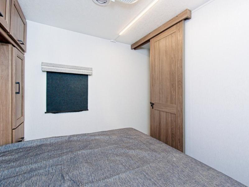 Front Private Bedroom: Features a queen-size bed with wardrobes on either side, providing ample storage.