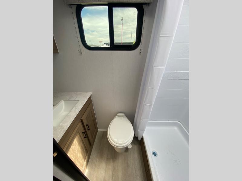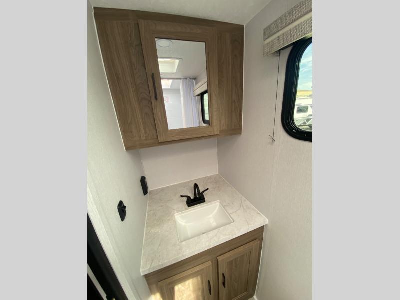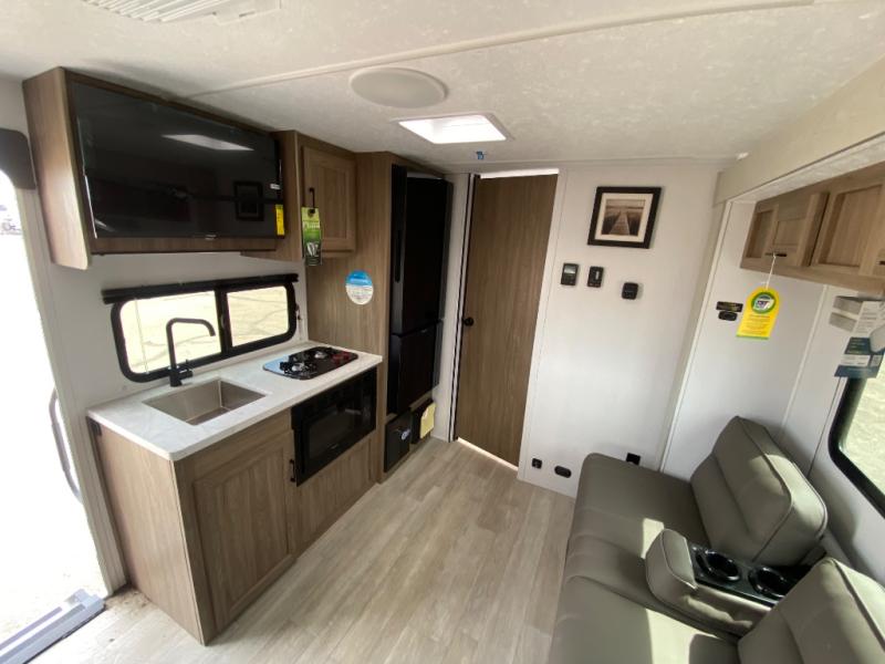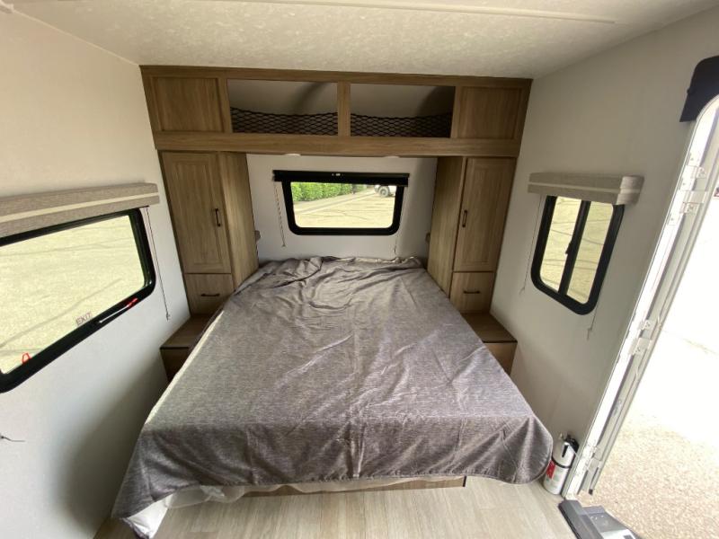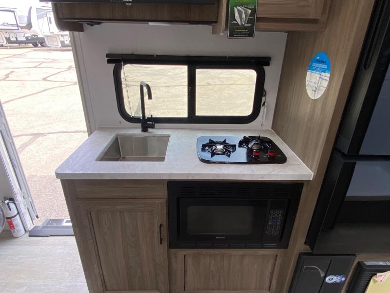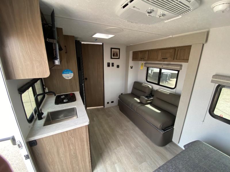 You'll love spending time at the campground in this single slide out travel trailer! The 54" x 80" front bed includes vaulted underbed storage to keep your luggage or extra blankets out of the way, plus there are dual bedside wardrobes for your clothes. A sofa with a free-standing table will provide a place to relax and dine, and the full kitchen includes a dual-burner cooktop and microwave oven to cook meals each day. This unit also features a full rear bath, complete with a 30" x 36" shower, a toilet, and a sink with a medicine cabinet for your necessities.