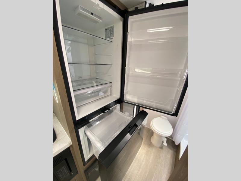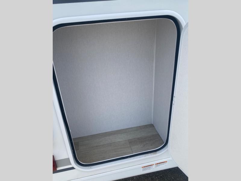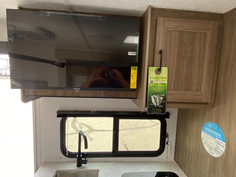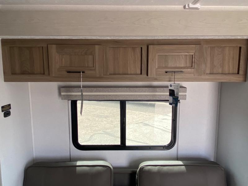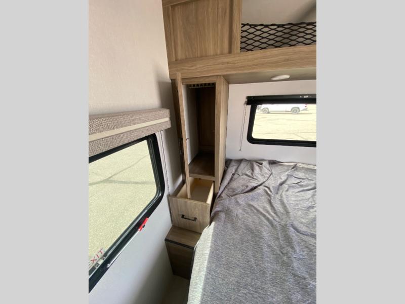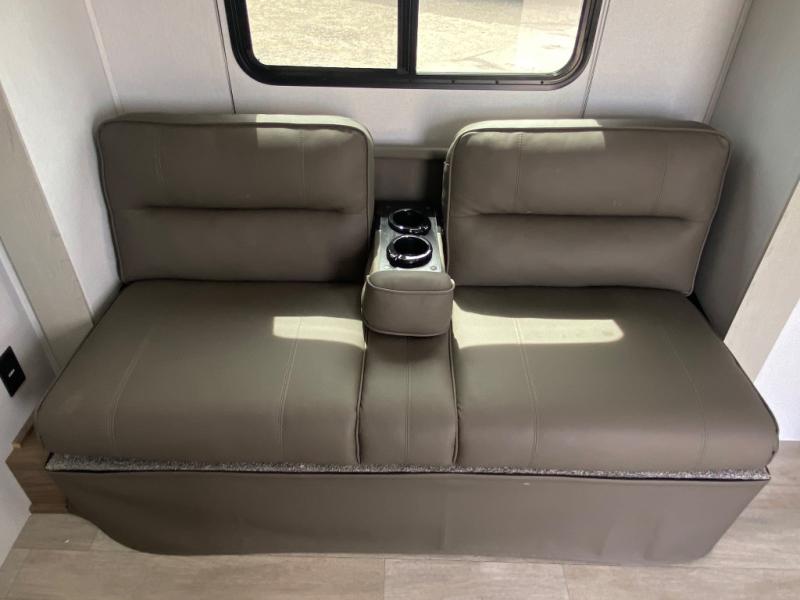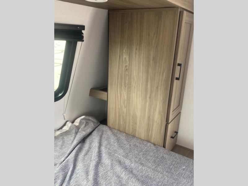 You'll love spending time at the campground in this single slide out travel trailer! The 54" x 80" front bed includes vaulted underbed storage to keep your luggage or extra blankets out of the way, plus there are dual bedside wardrobes for your clothes. A sofa with a free-standing table will provide a place to relax and dine, and the full kitchen includes a dual-burner cooktop and microwave oven to cook meals each day. This unit also features a full rear bath, complete with a 30" x 36" shower, a toilet, and a sink with a medicine cabinet for your necessities.