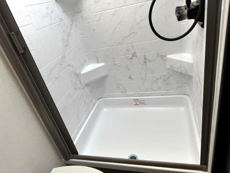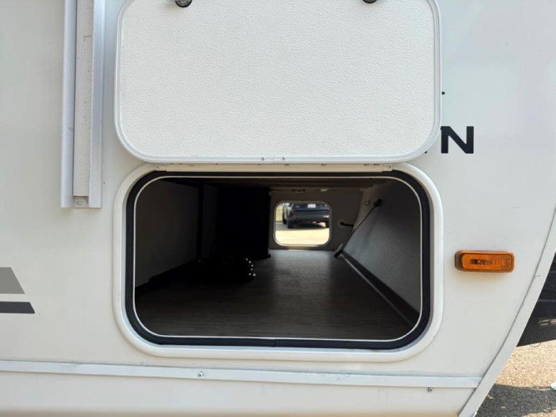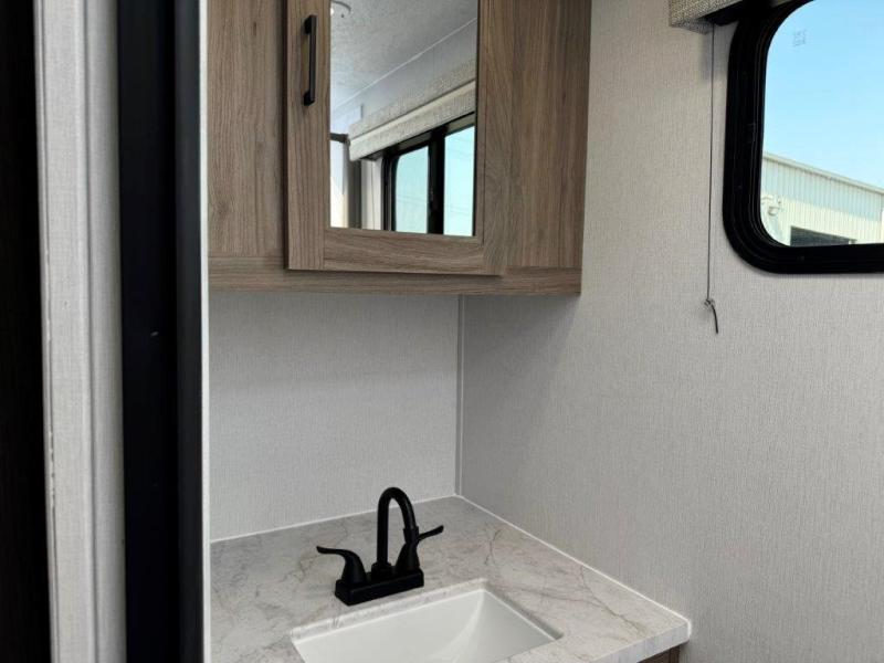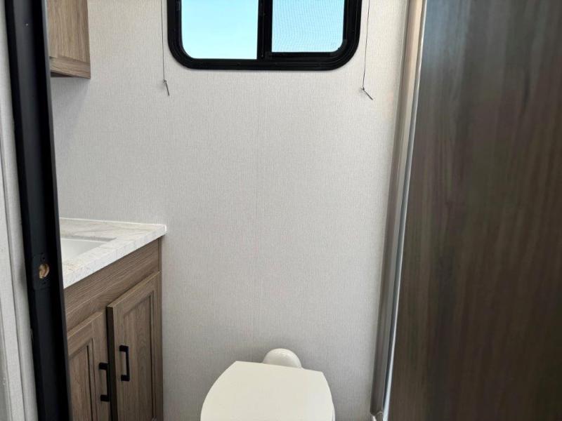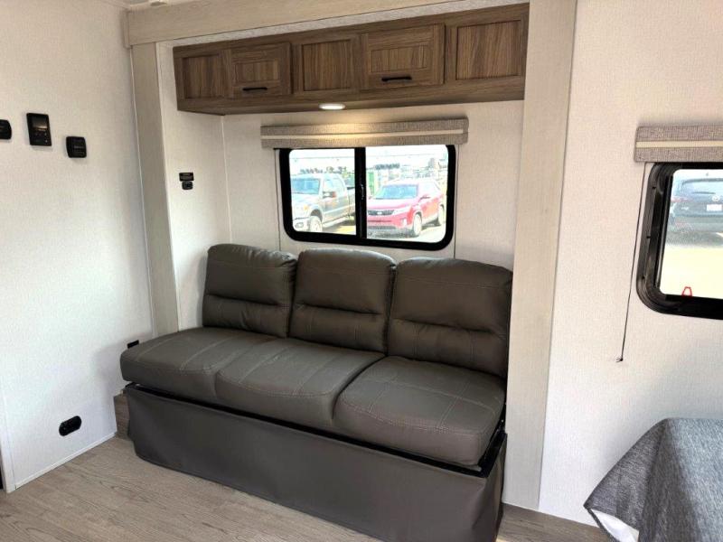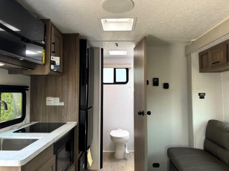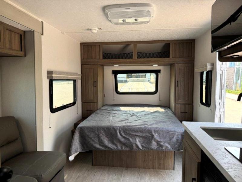 You'll love spending time at the campground in this single slide out travel trailer! The 54" x 80" front bed includes vaulted underbed storage to keep your luggage or extra blankets out of the way, plus there are dual bedside wardrobes for your clothes. A sofa with a free-standing table will provide a place to relax and dine, and the full kitchen includes a dual-burner cooktop and microwave oven to cook meals each day. This unit also features a full rear bath, complete with a 30" x 36" shower, a toilet, and a sink with a medicine cabinet for your necessities.