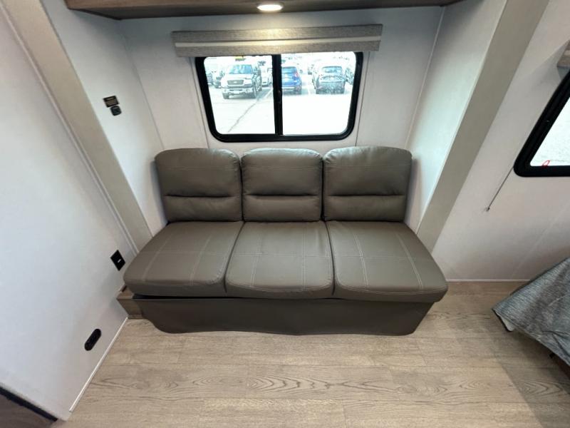You'll love spending time at the campground in this single slide out travel trailer! The 54" x 80" front bed includes vaulted underbed storage to keep your luggage or extra blankets out of the way, plus there are dual bedside wardrobes for your clothes. A sofa with a free-standing table will provide a place to relax and dine, and the full kitchen includes a dual-burner cooktop and microwave oven to cook meals each day. This unit also features a full rear bath, complete with a 30" x 36" shower, a toilet, and a sink with a medicine cabinet for your necessities.