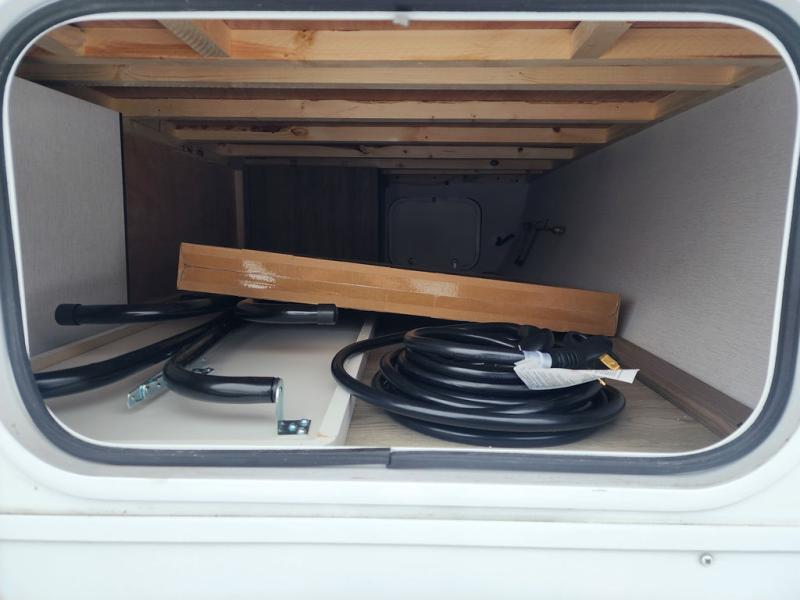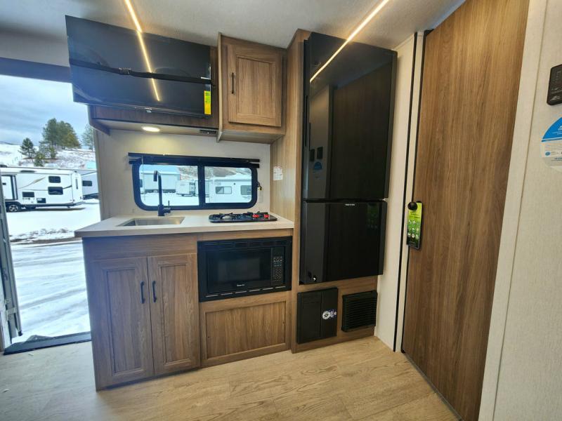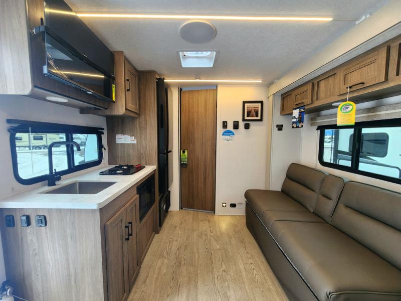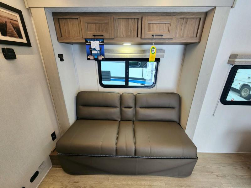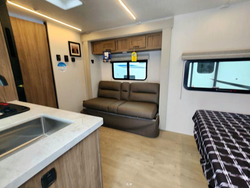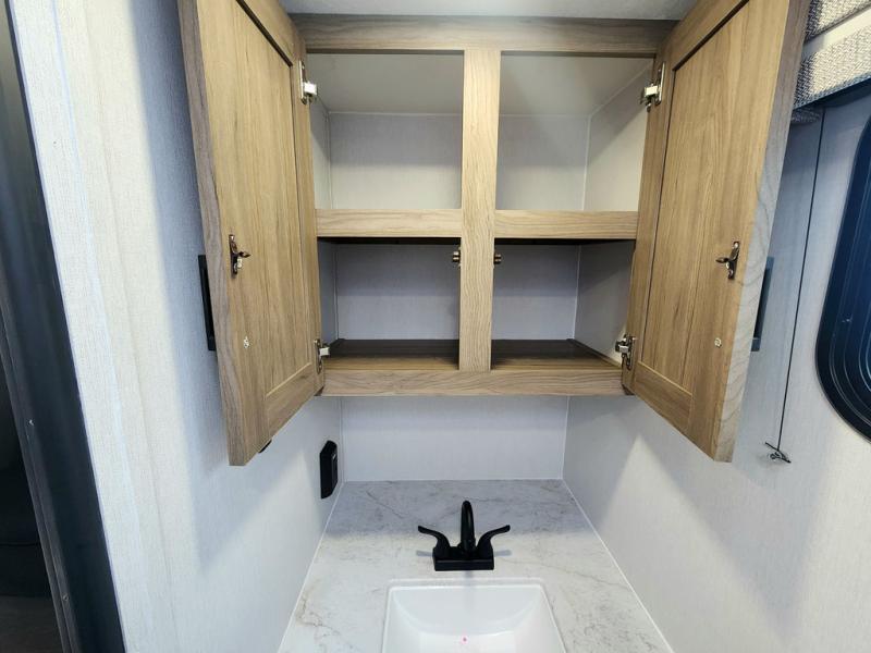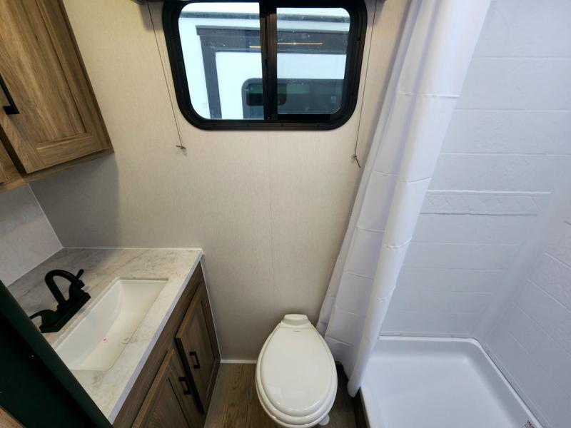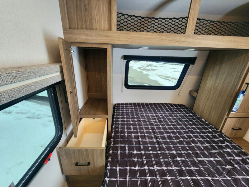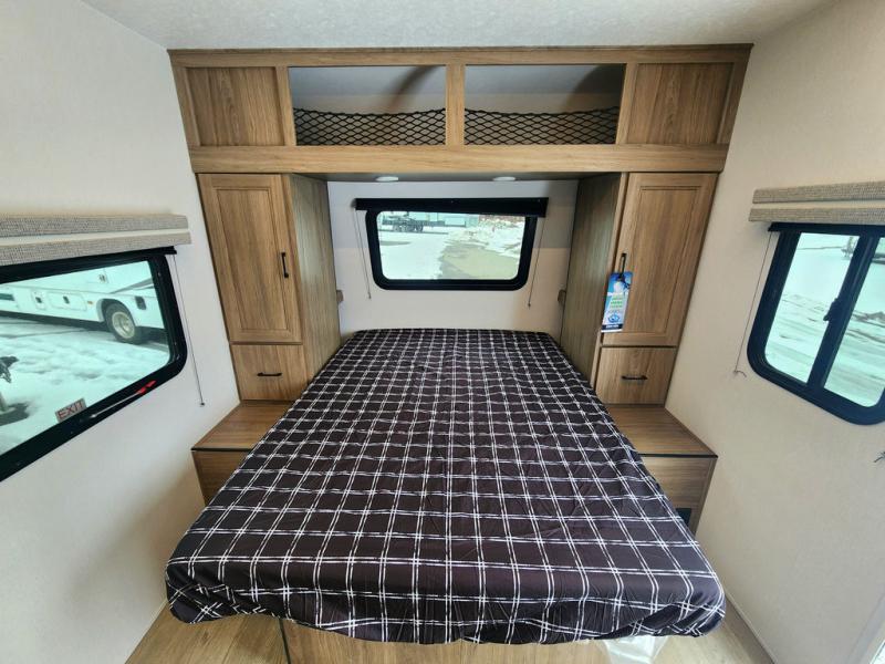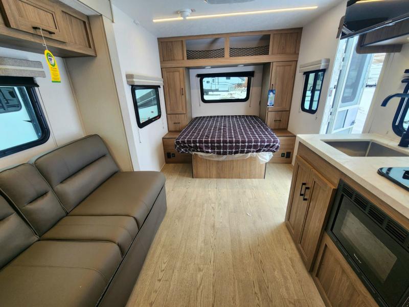 You'll love spending time at the campground in this single slide out travel trailer! The 54" x 80" front bed includes vaulted underbed storage to keep your luggage or extra blankets out of the way, plus there are dual bedside wardrobes for your clothes. A sofa with a free-standing table will provide a place to relax and dine, and the full kitchen includes a dual-burner cooktop and microwave oven to cook meals each day. This unit also features a full rear bath, complete with a 30" x 36" shower, a toilet, and a sink with a medicine cabinet for your necessities.